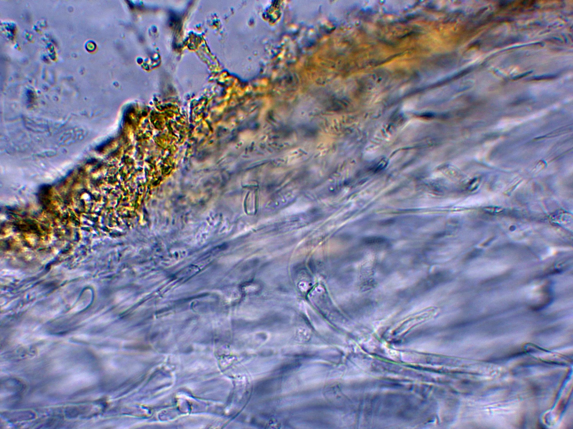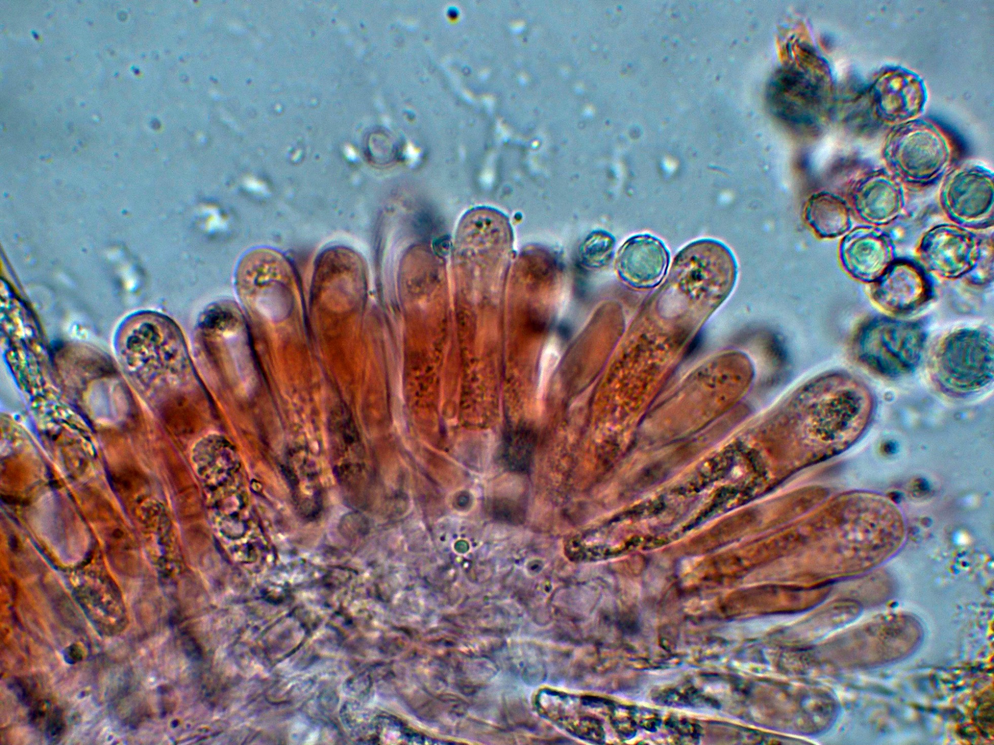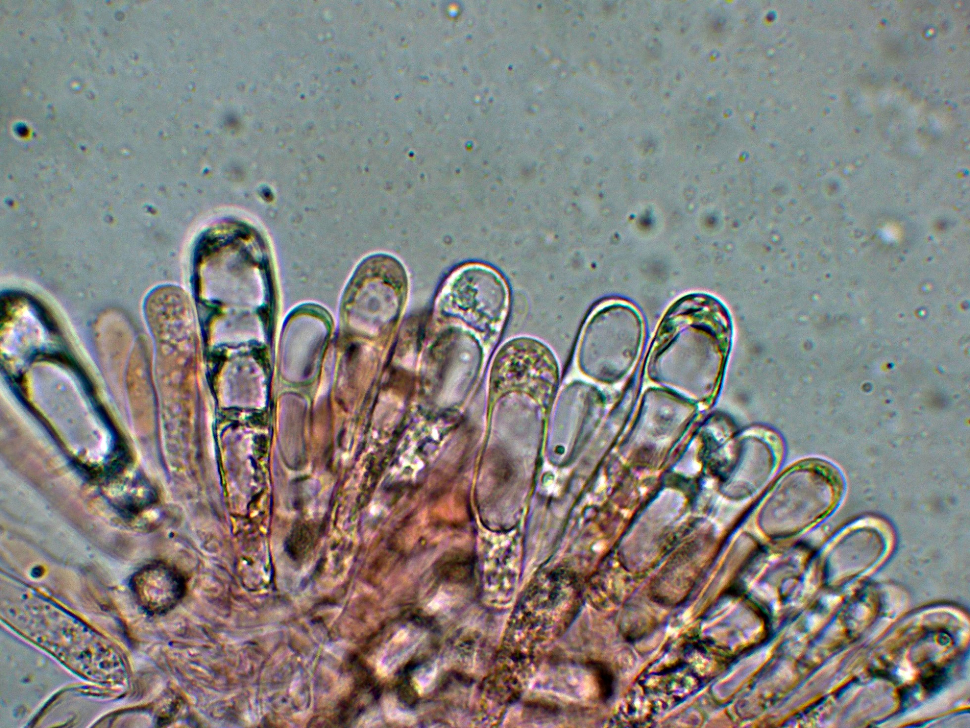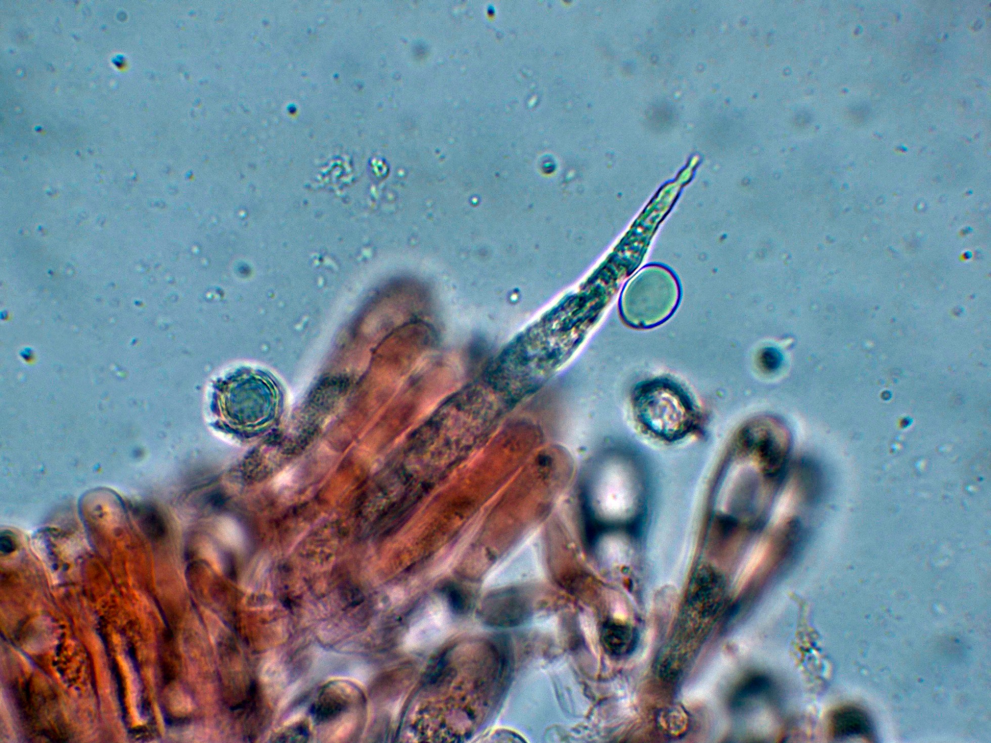 Sus cistidios fusiformes, muy alargados y estrechos, terminados en una larga punta: