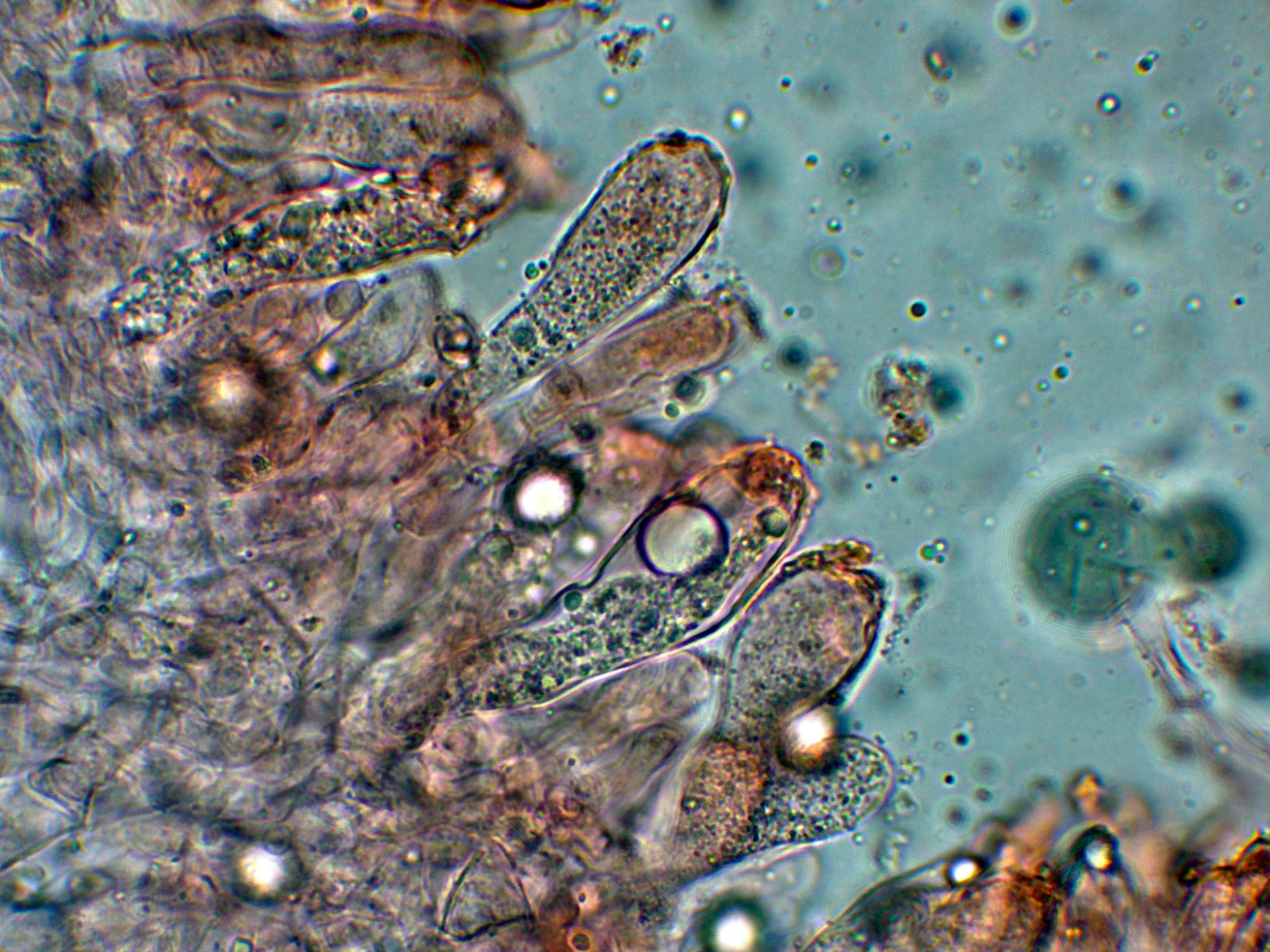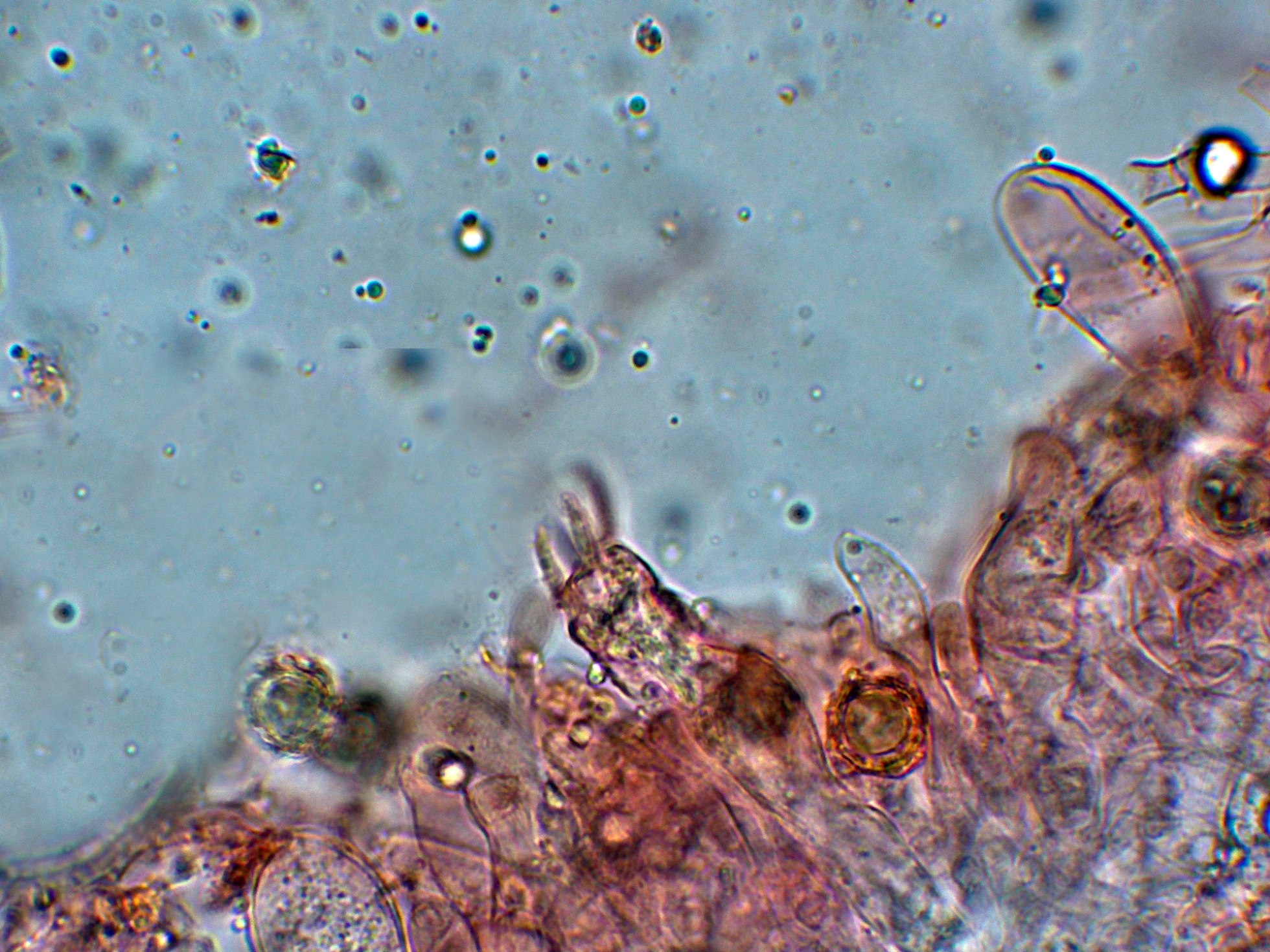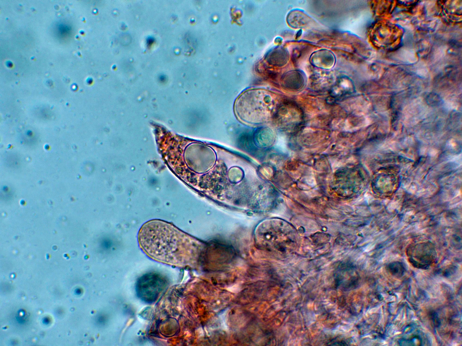 Cistidios ensanchados y con el extremo apuntado que no sobresalen en exceso por encima del nivel de los basidios.