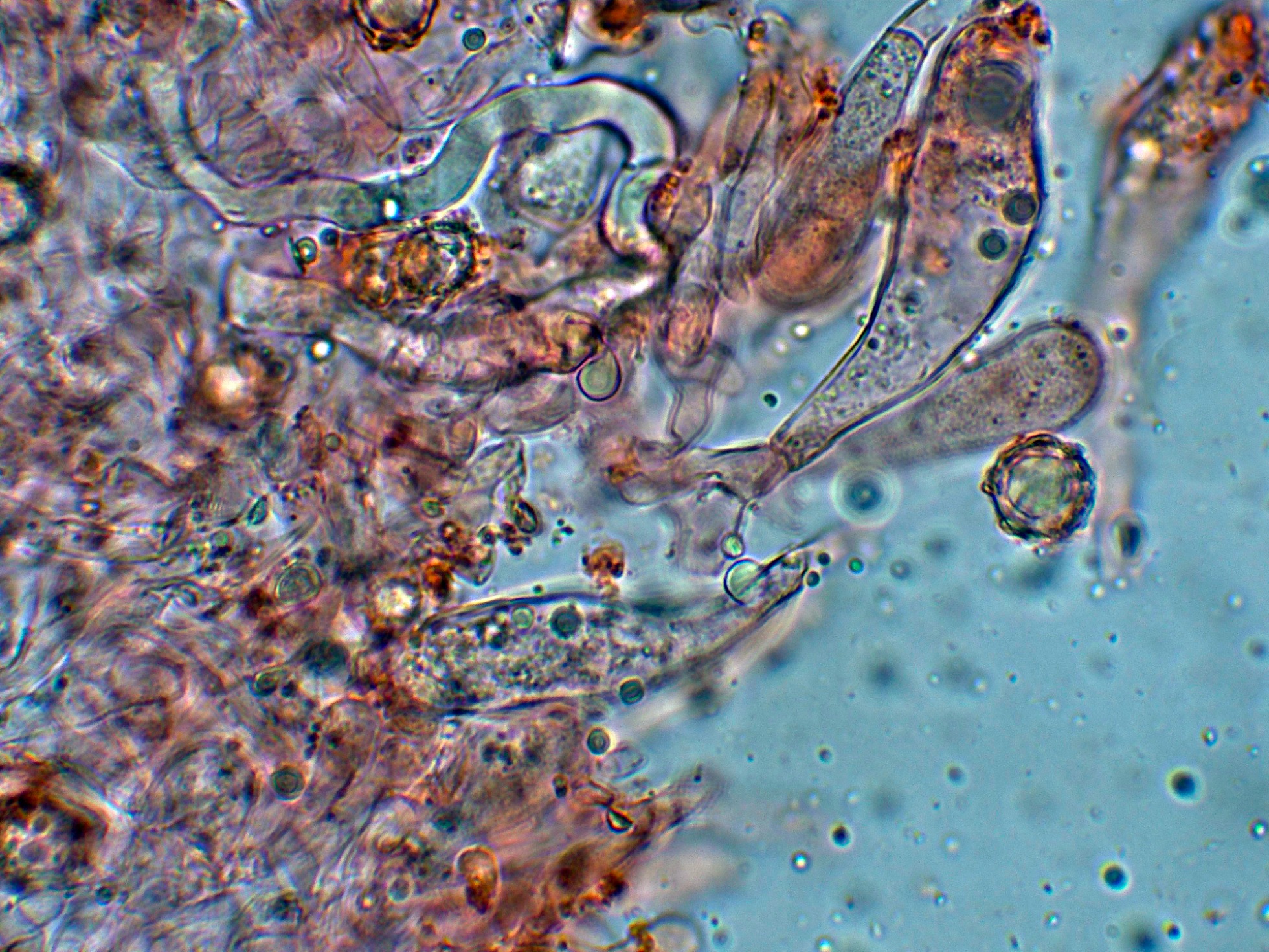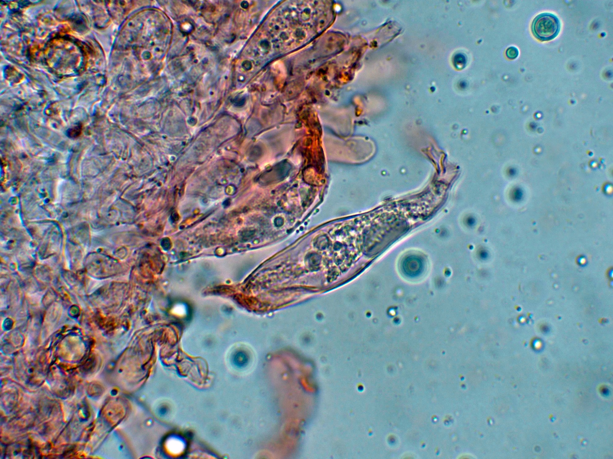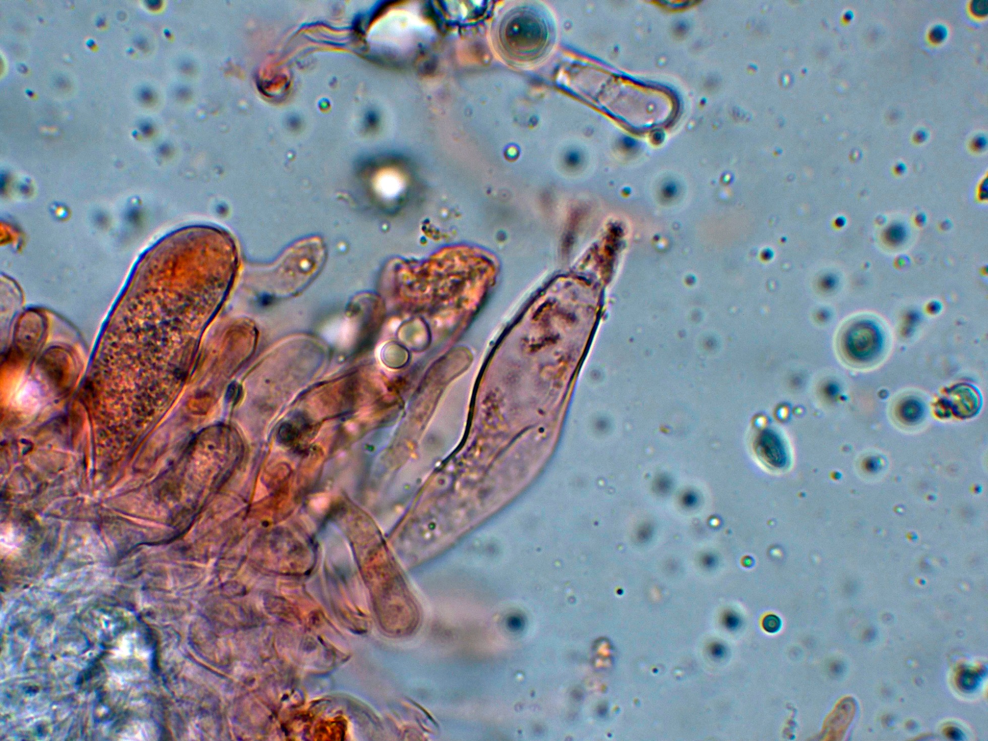 Cistidios ensanchados y con el extremo apuntado que no sobresalen en exceso por encima del nivel de los basidios.