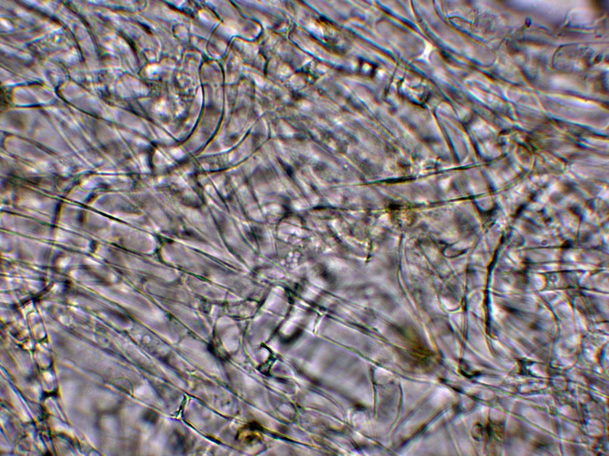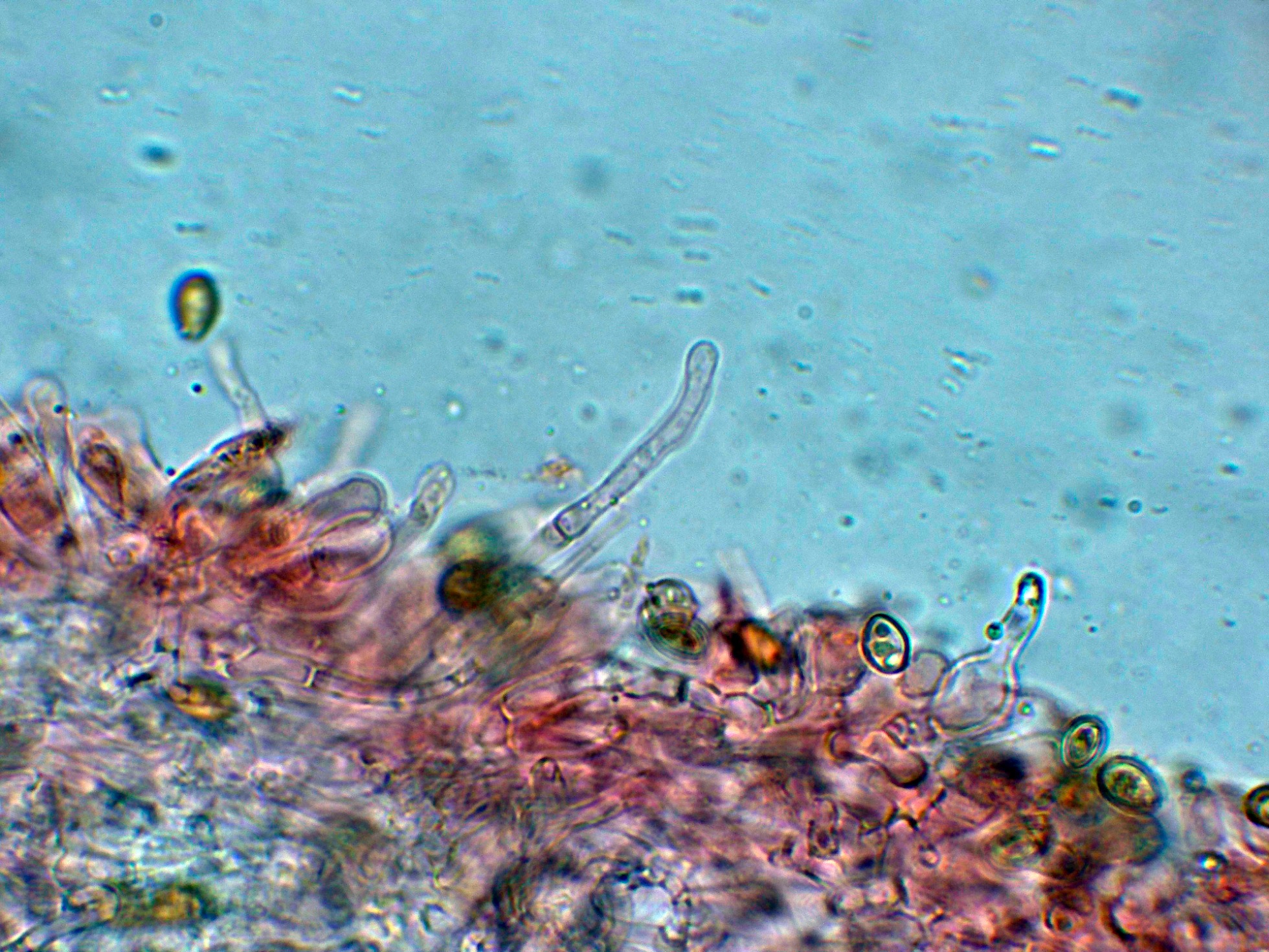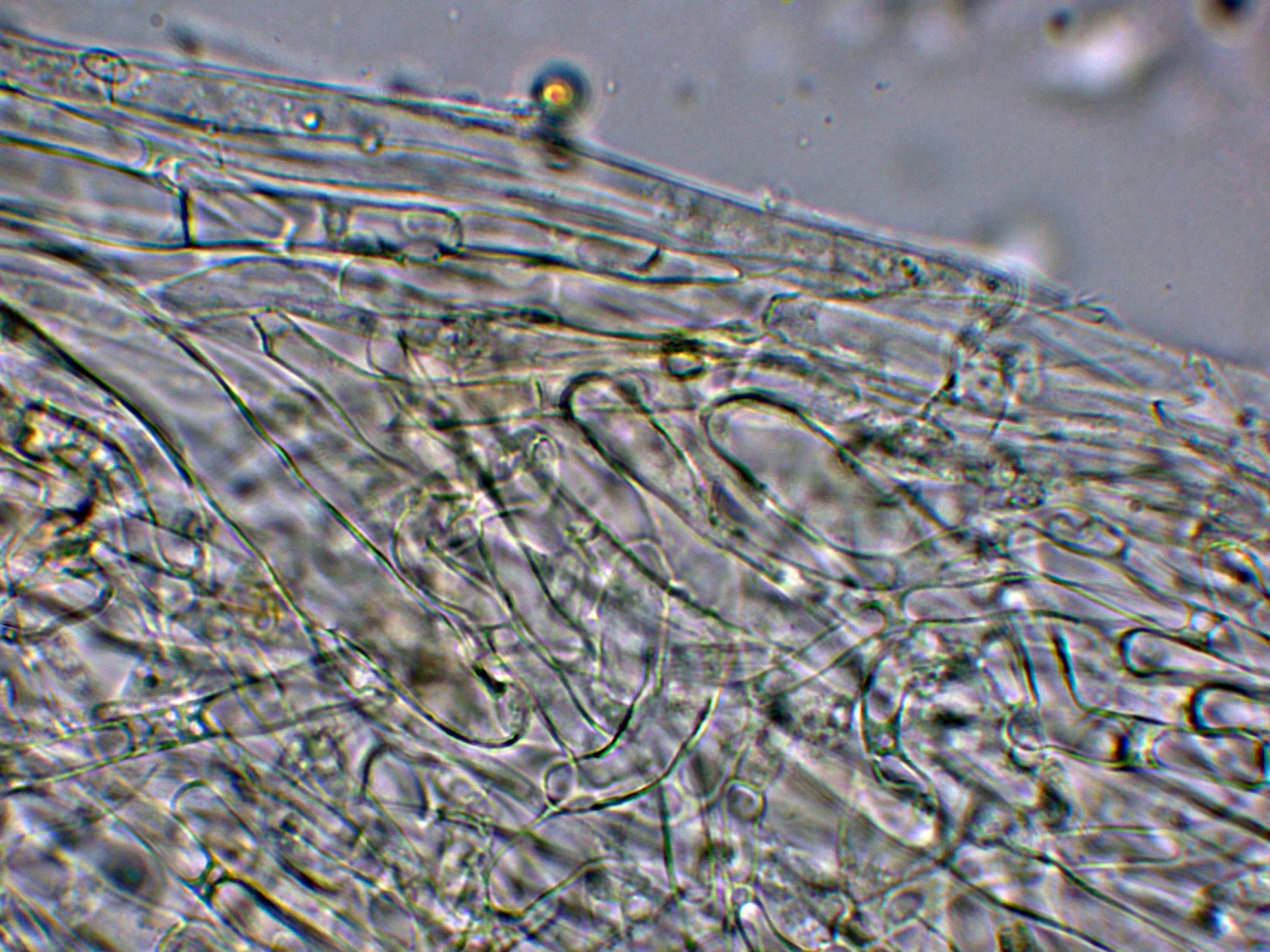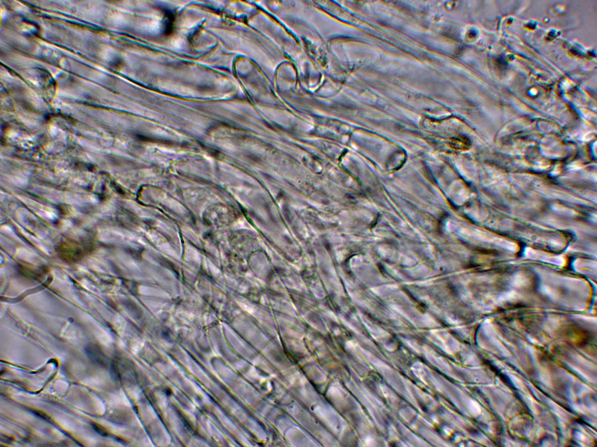 Arista laminar con abundantes hifas terminales a modo de queilocistidios de pequeño tamaño, cilíndricas y sinuosas.