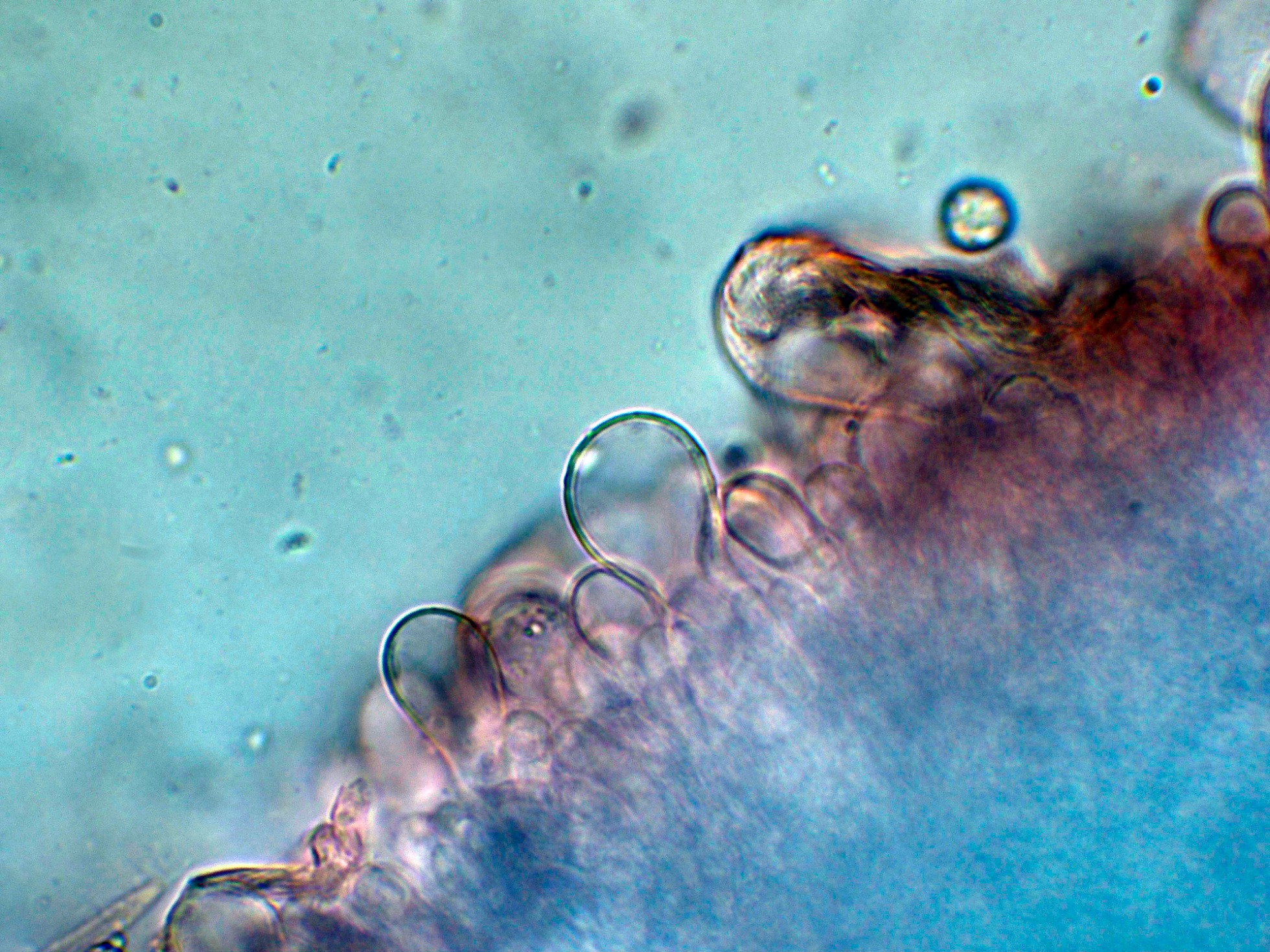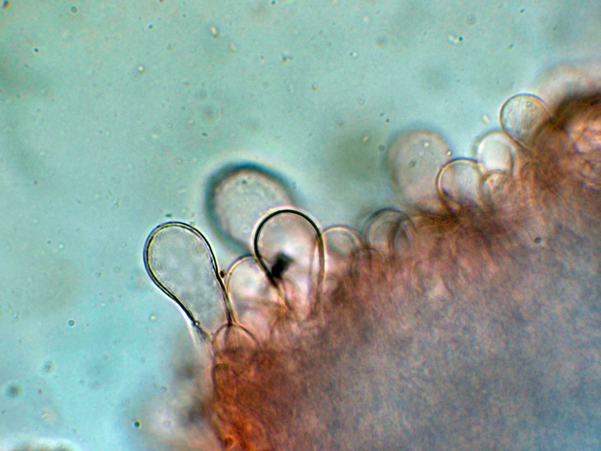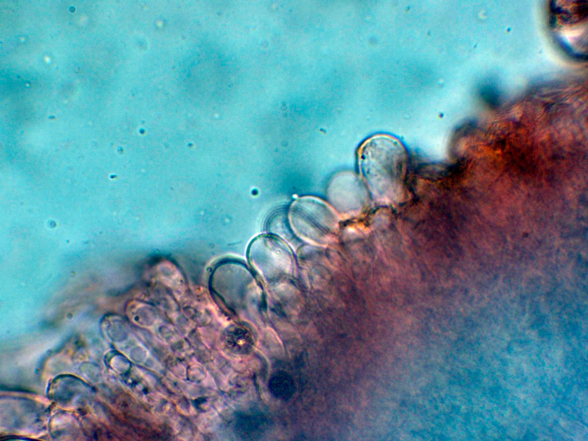 Aunque se define a la especie sin cistidios, pude observar en a arista laminar del ejemplar joven de la primera imágen unas hifas terminales hinchadas piriformes.