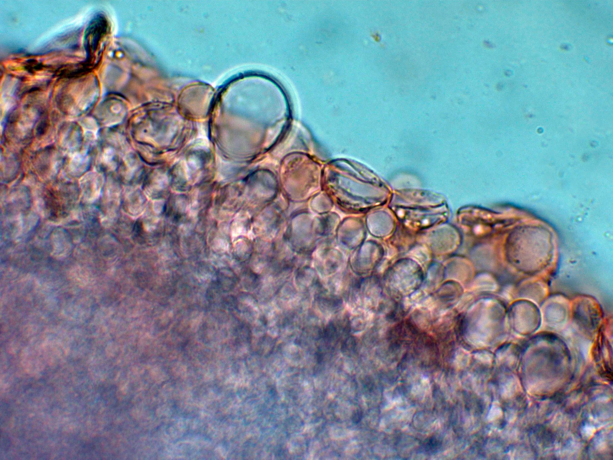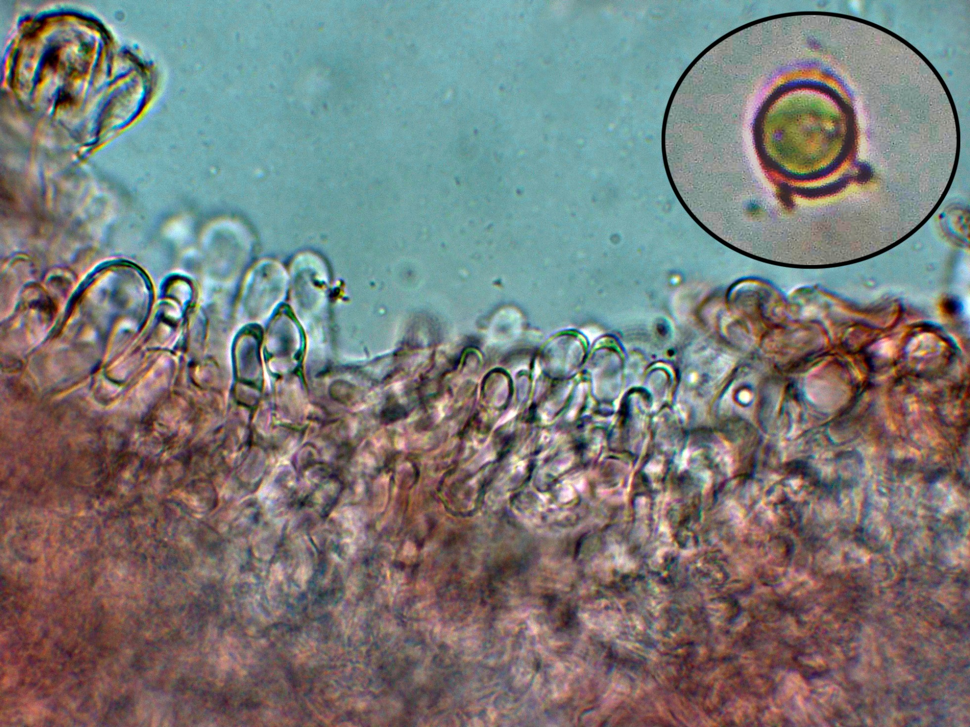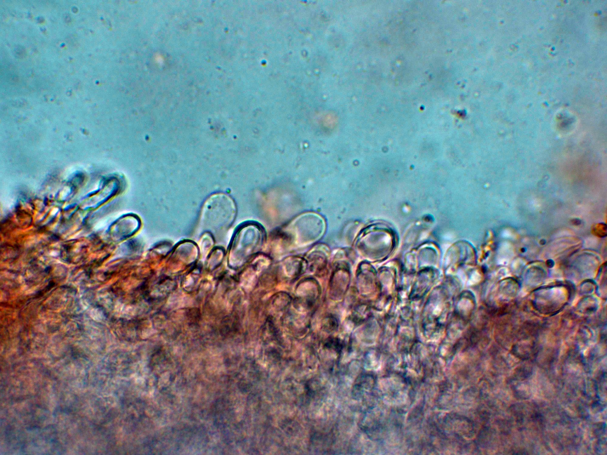 Aunque se define a la especie sin cistidios, pude observar en a arista laminar del ejemplar joven de la primera imágen unas hifas terminales hinchadas piriformes.