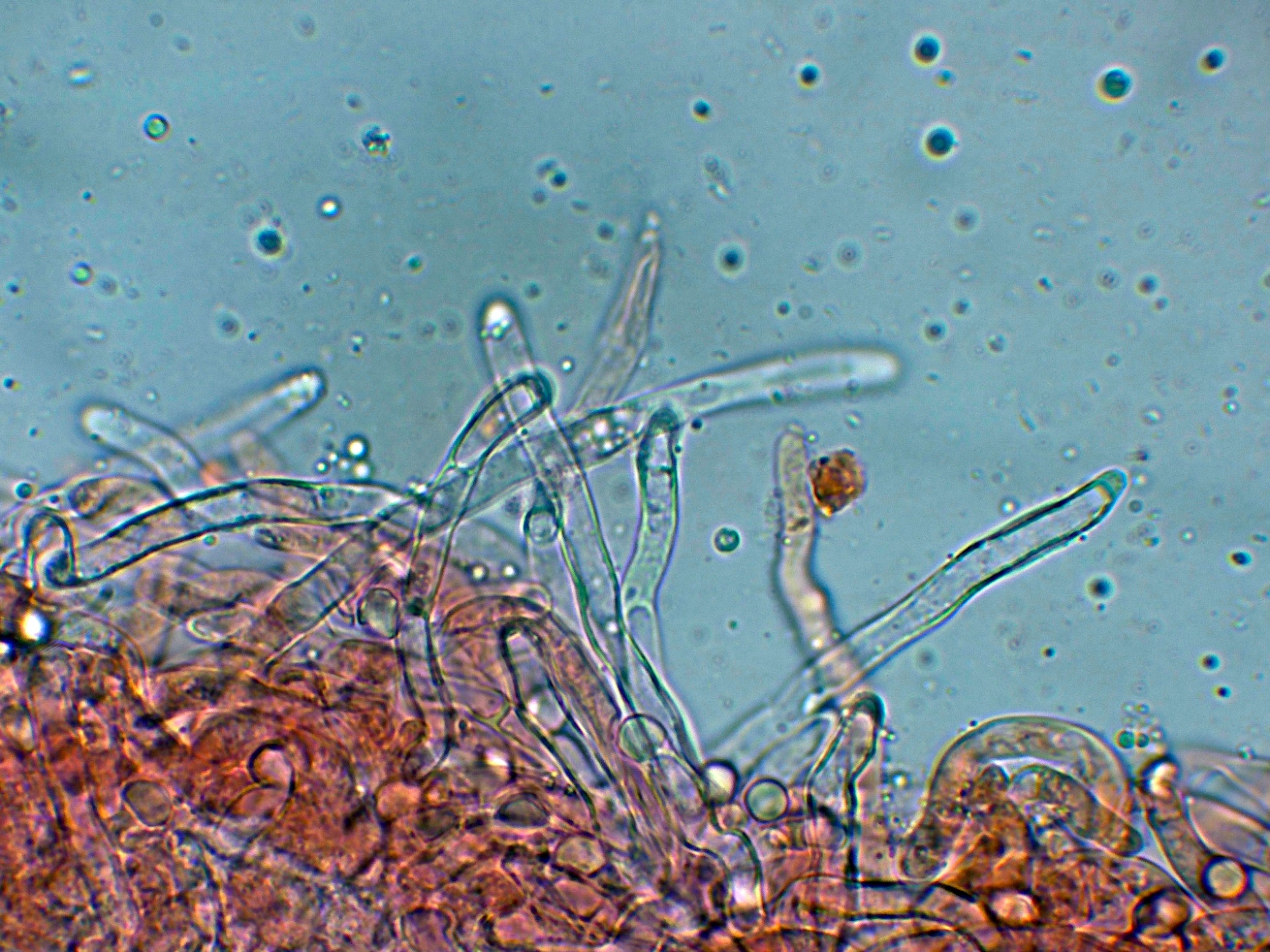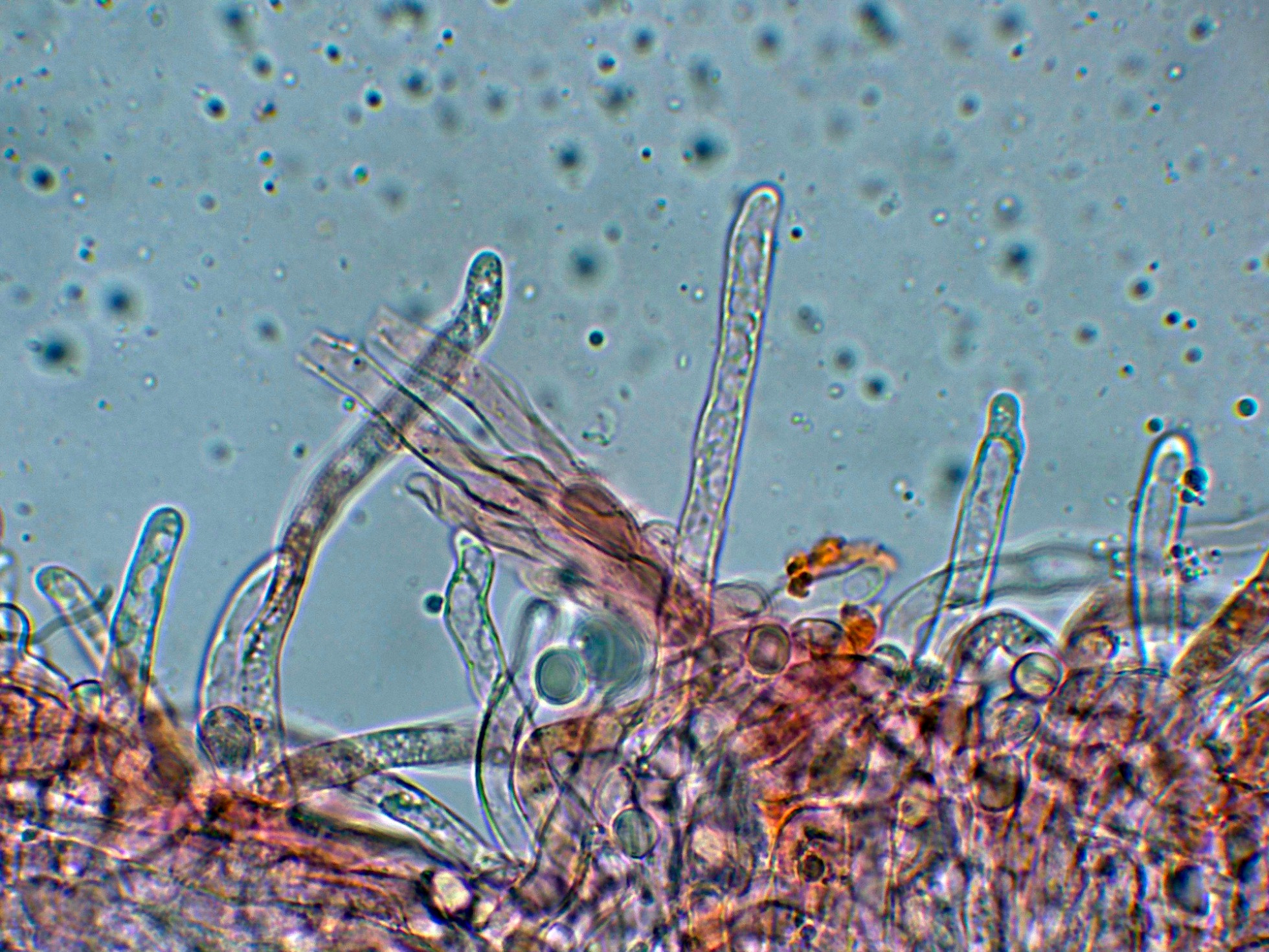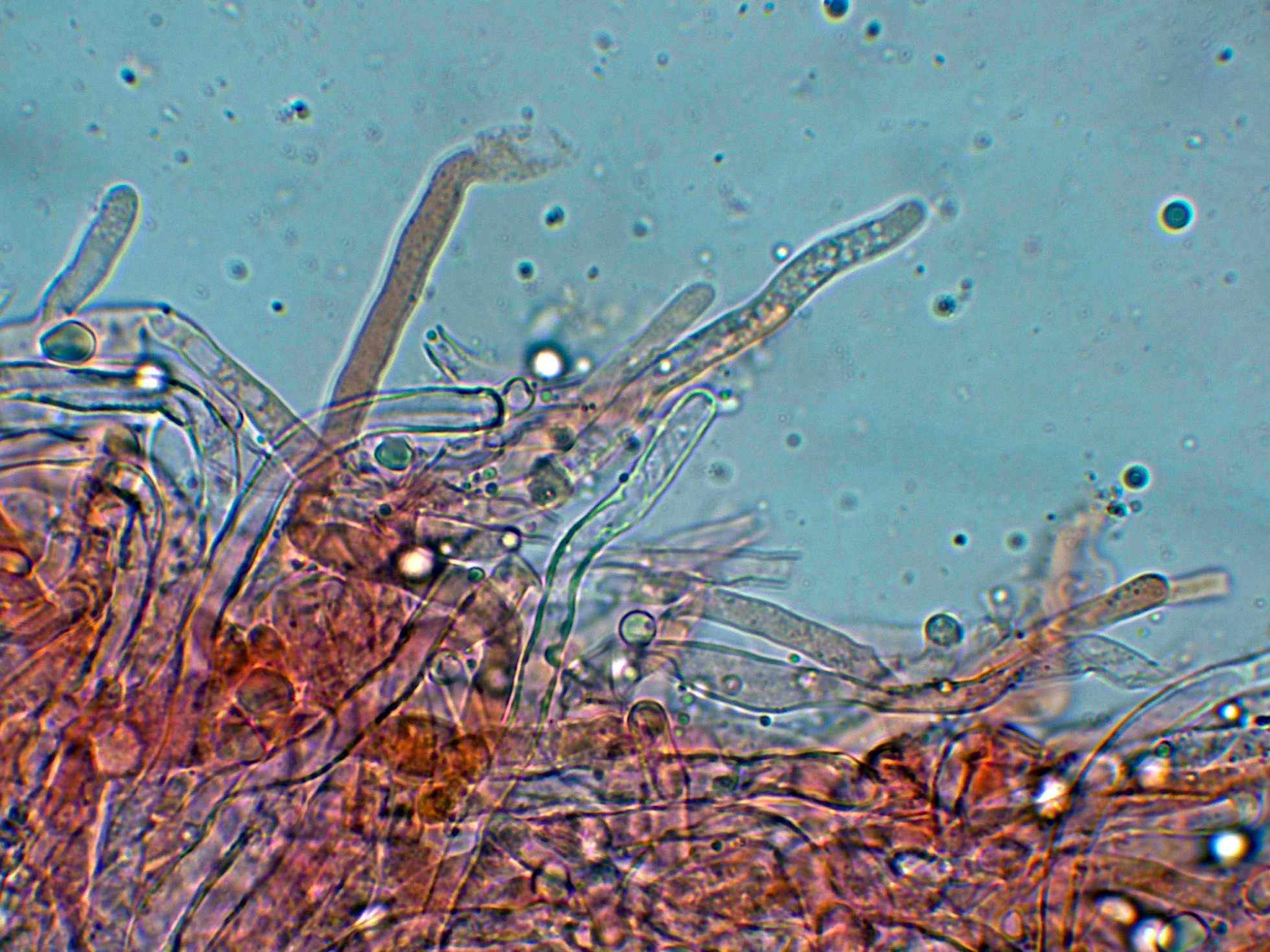 Hifas de la pileipellis entremezcladas con terminaciones emergentes a lodo de pelos.