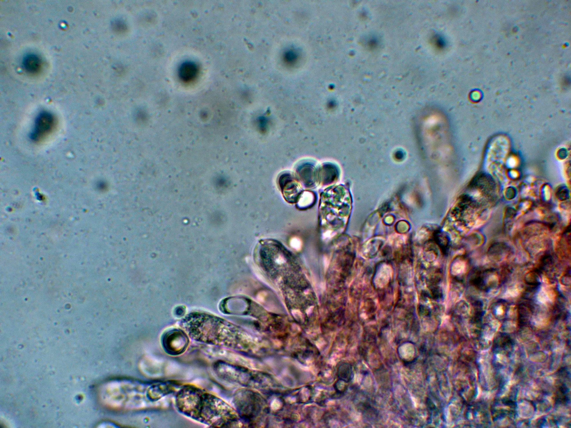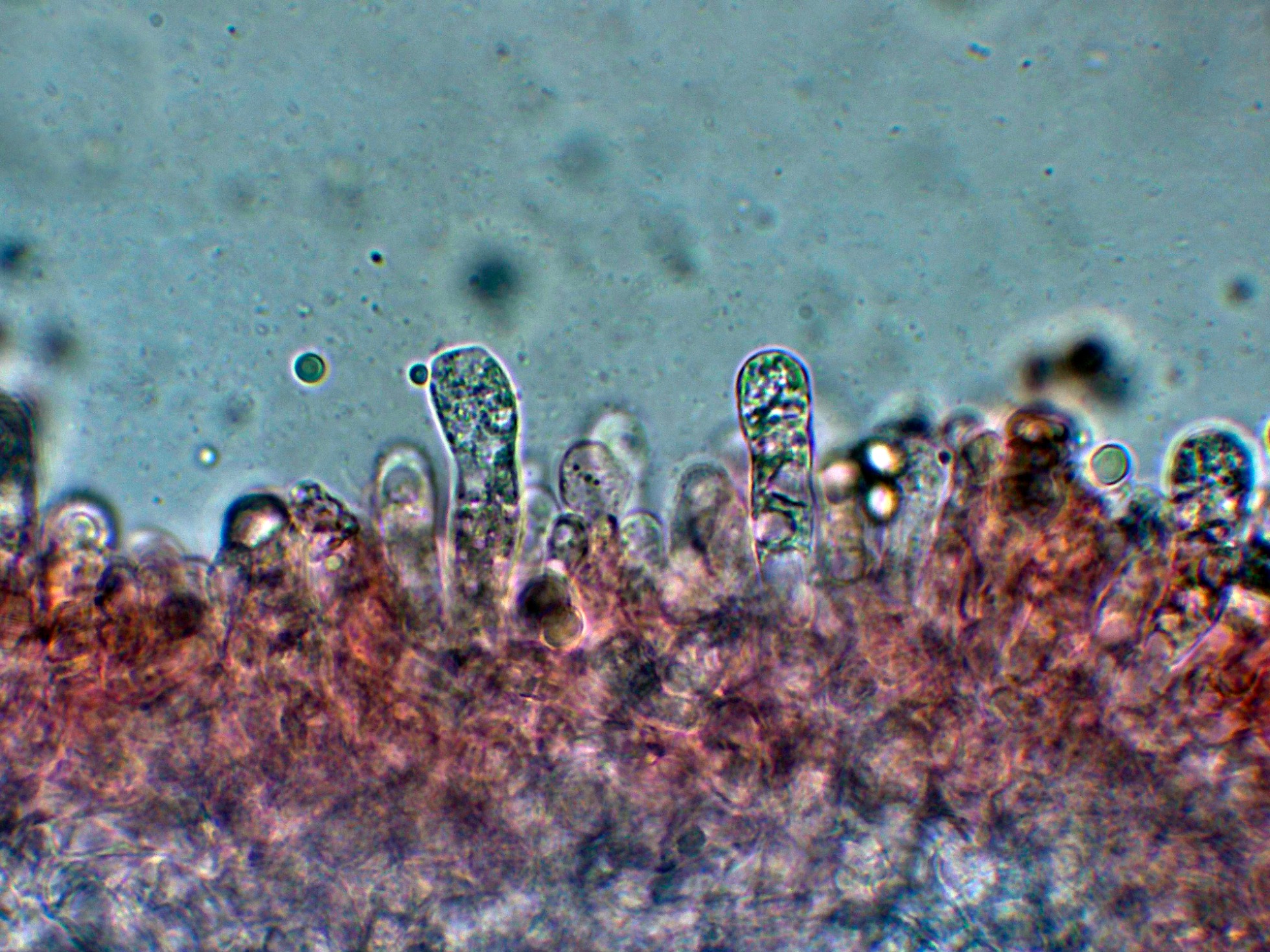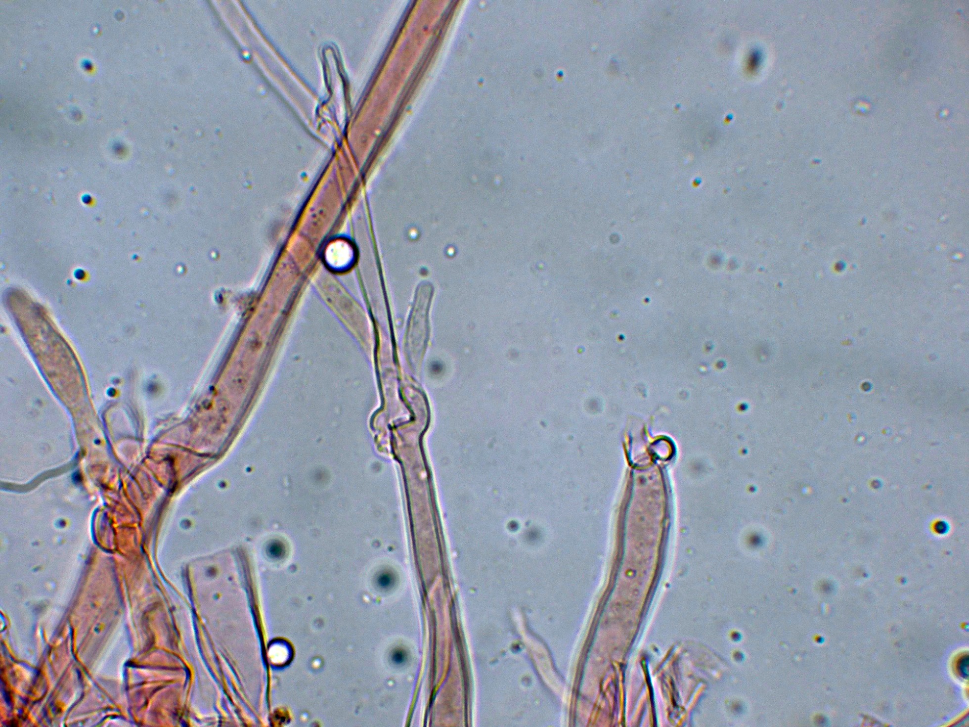 Hifas de la pileipellis entremezcladas con terminaciones emergentes a lodo de pelos.