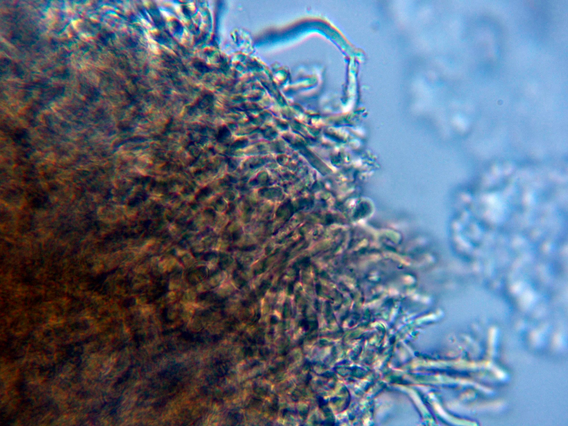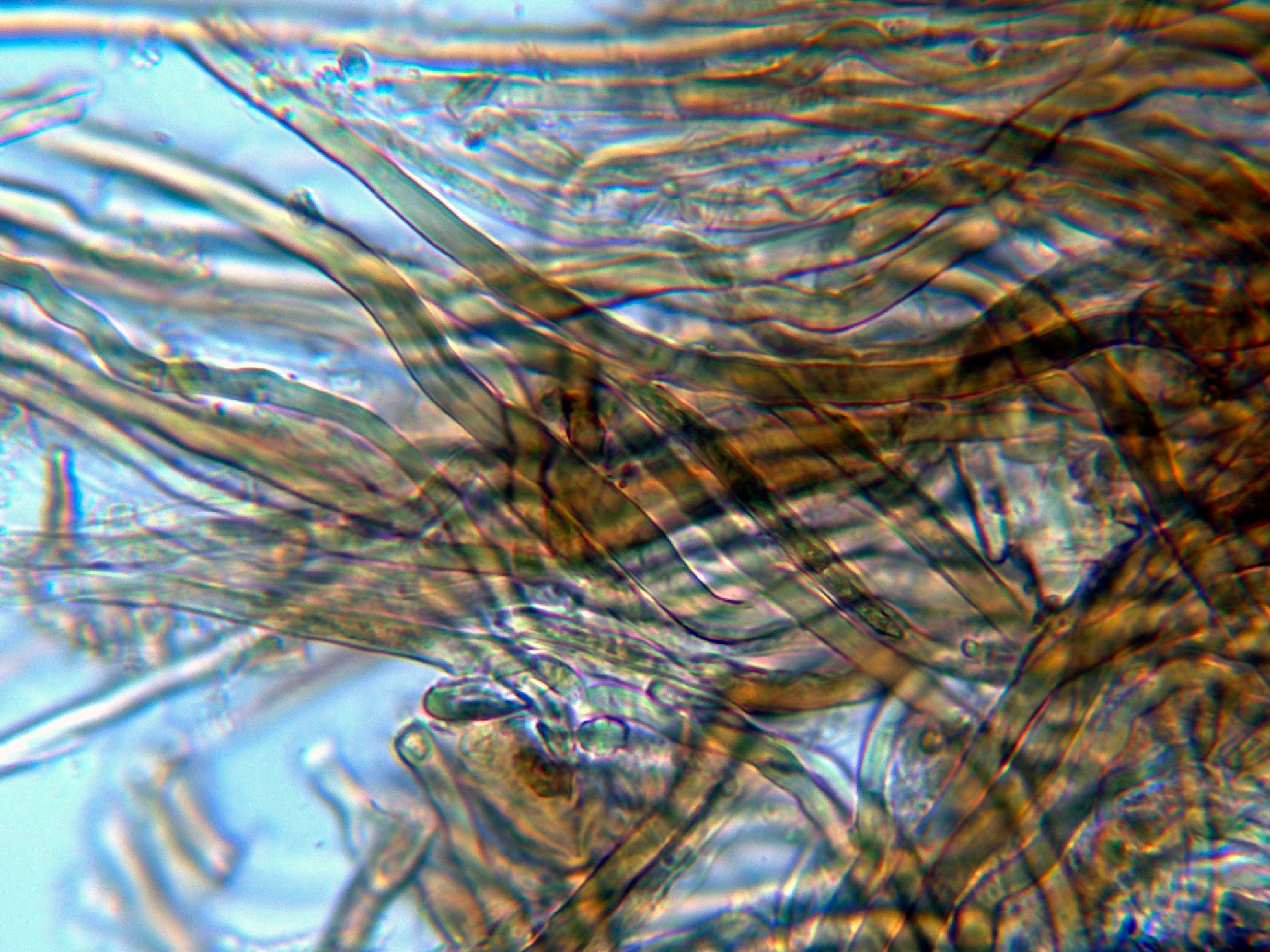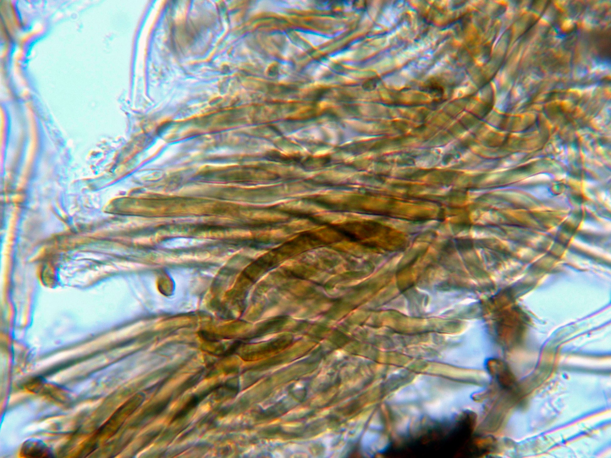 Hifas de la pileipellis, dispuestas más o menos paralelamente y fuertemente pigmentadas de marrón ocráceo.