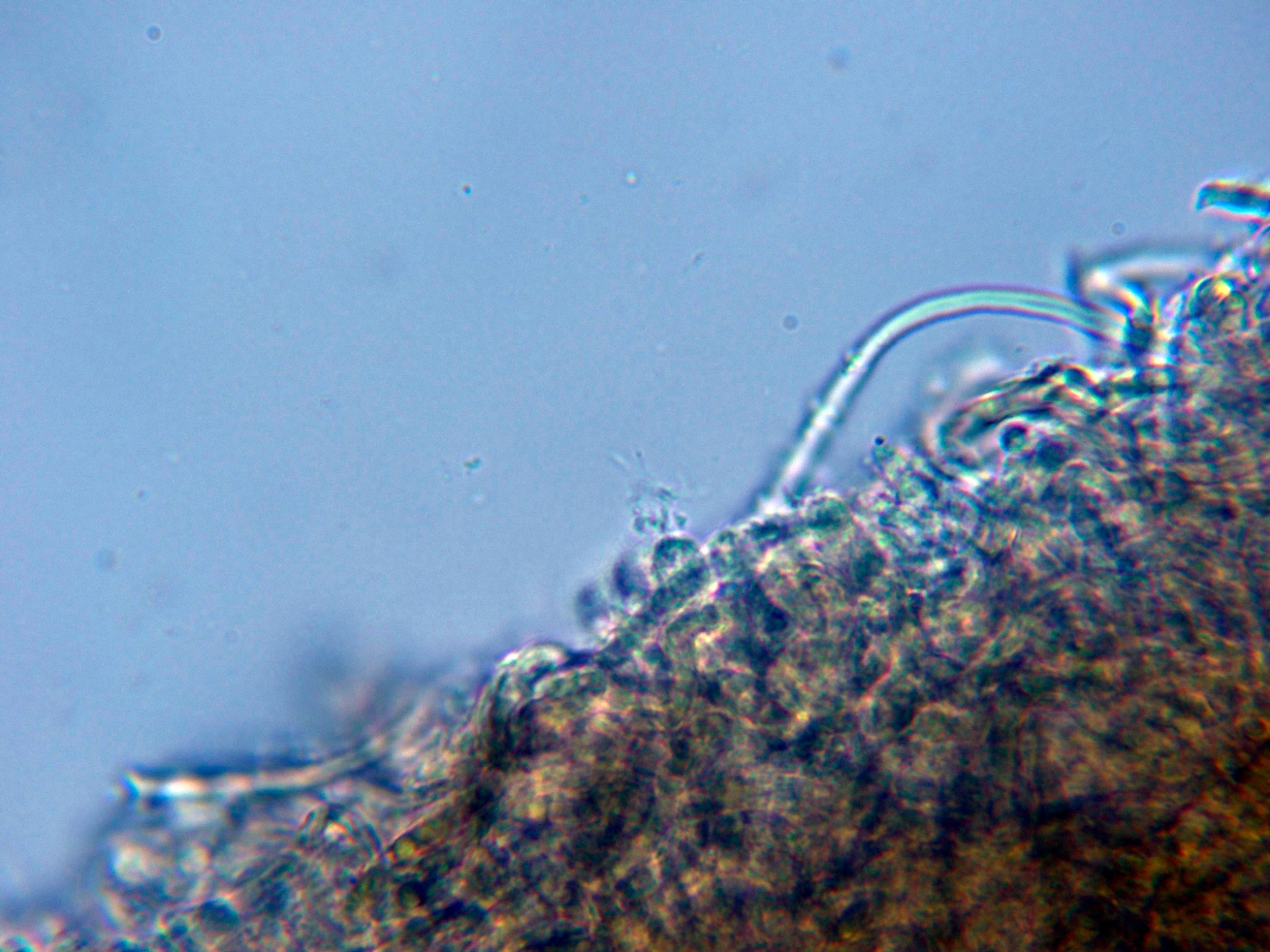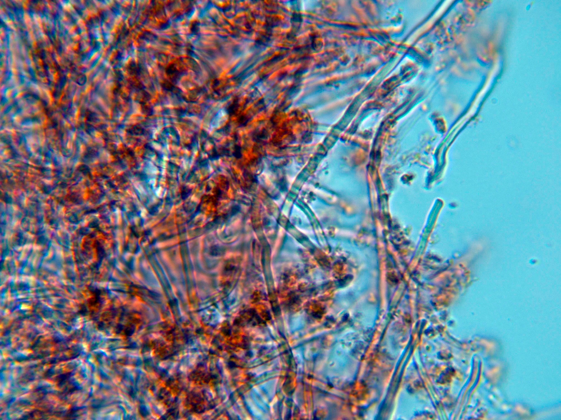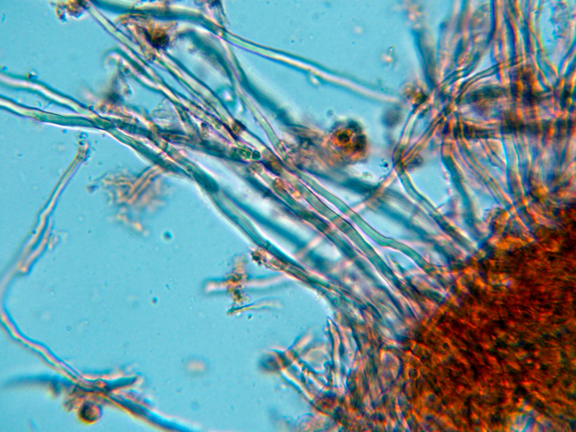 Hifas de la pileipellis, dispuestas más o menos paralelamente y fuertemente pigmentadas de marrón ocráceo.
