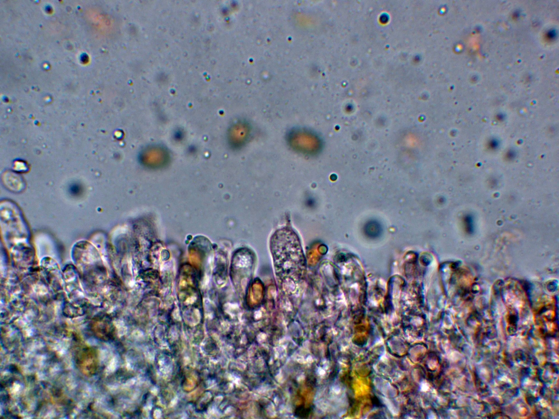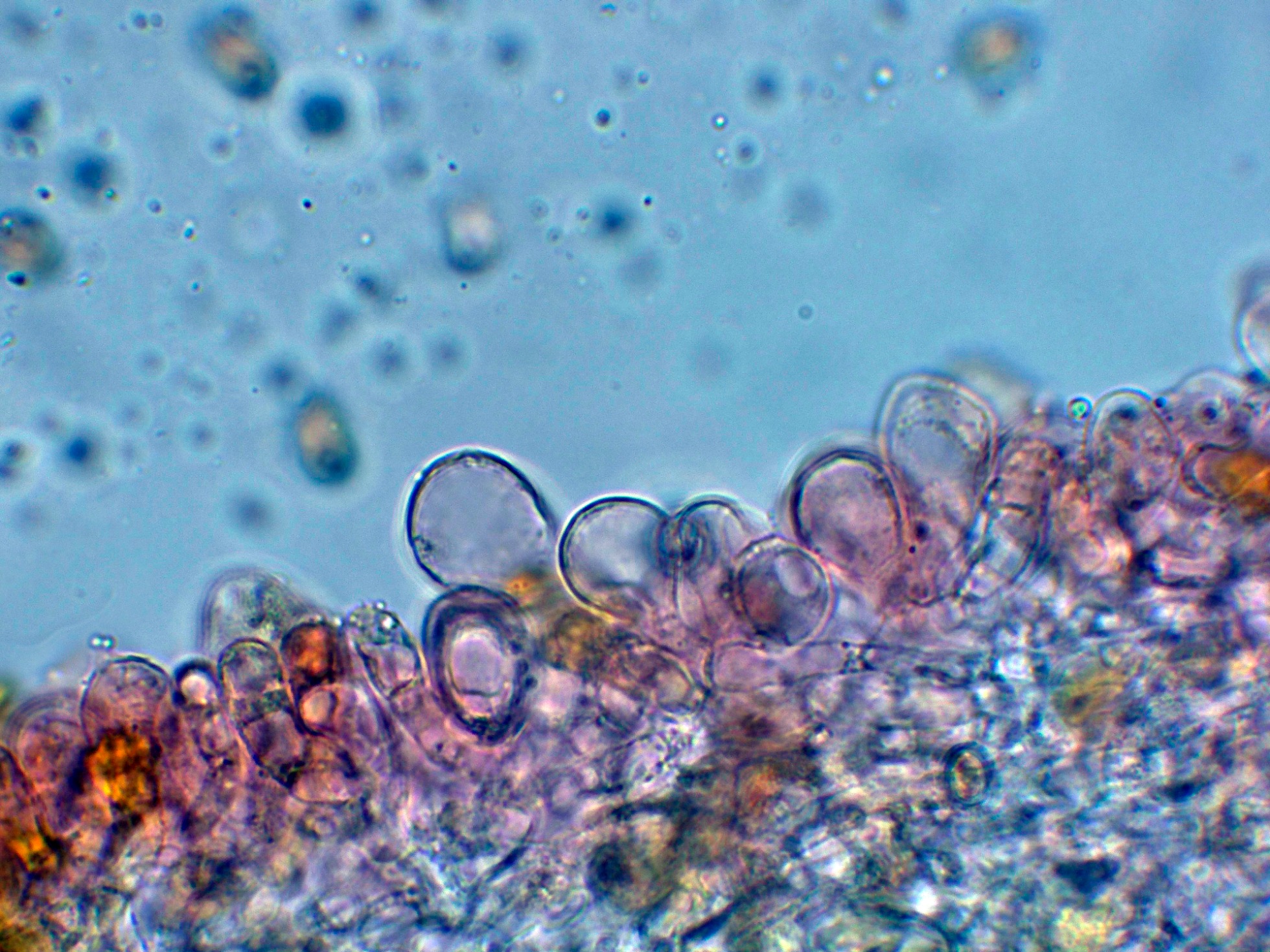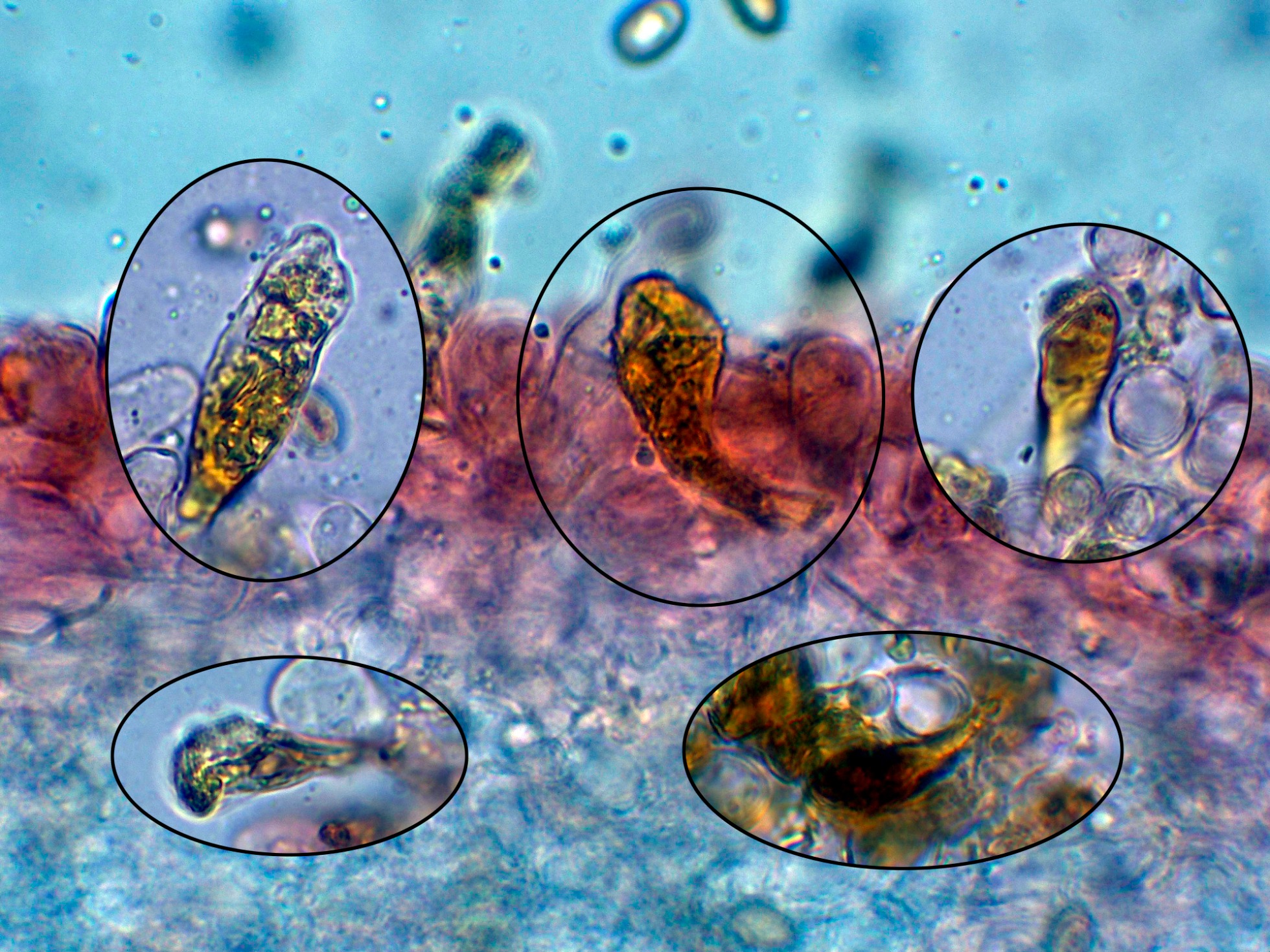 Queilocistidios abundantes entre esféricos, piriformes e irregulares.