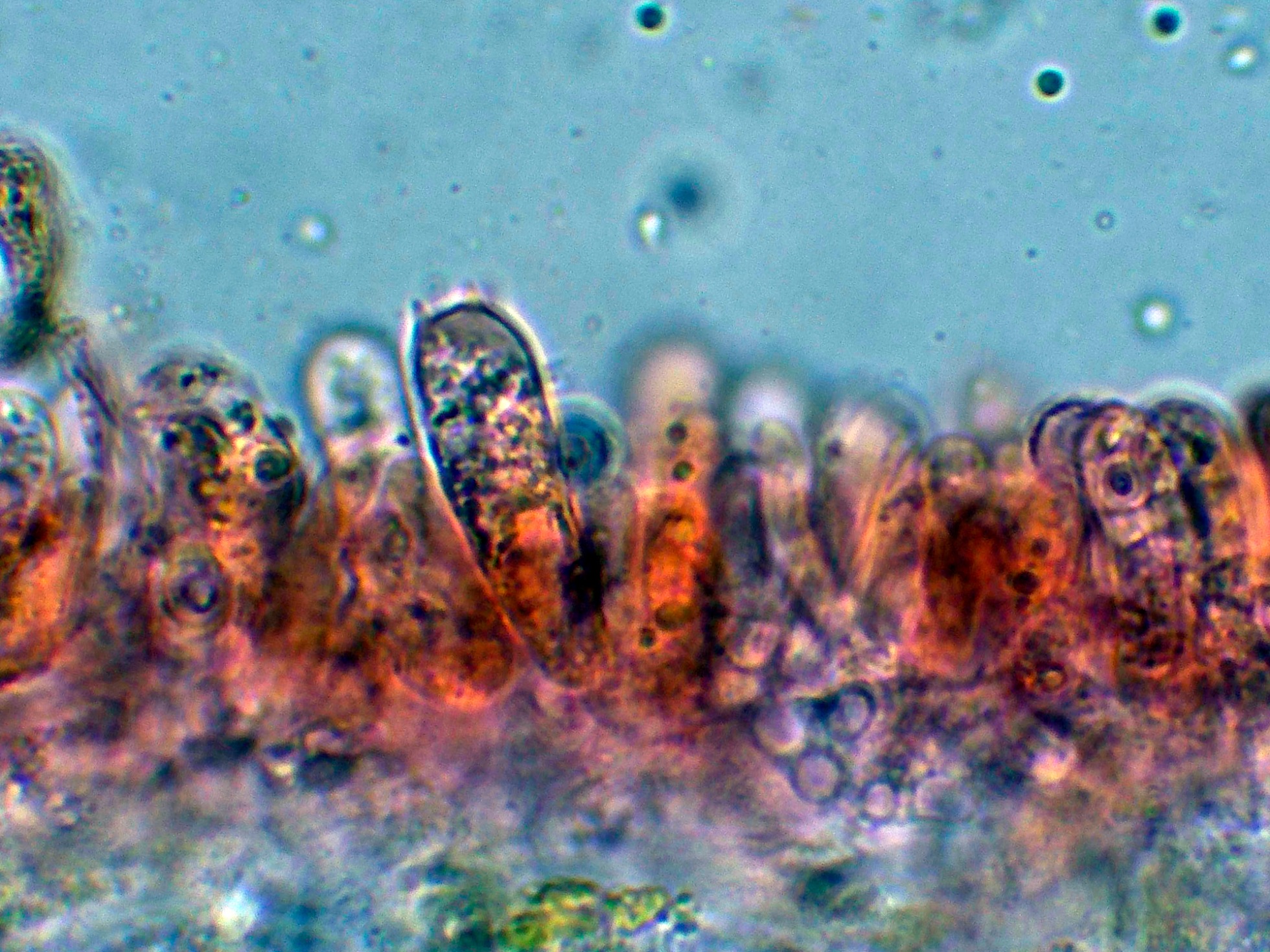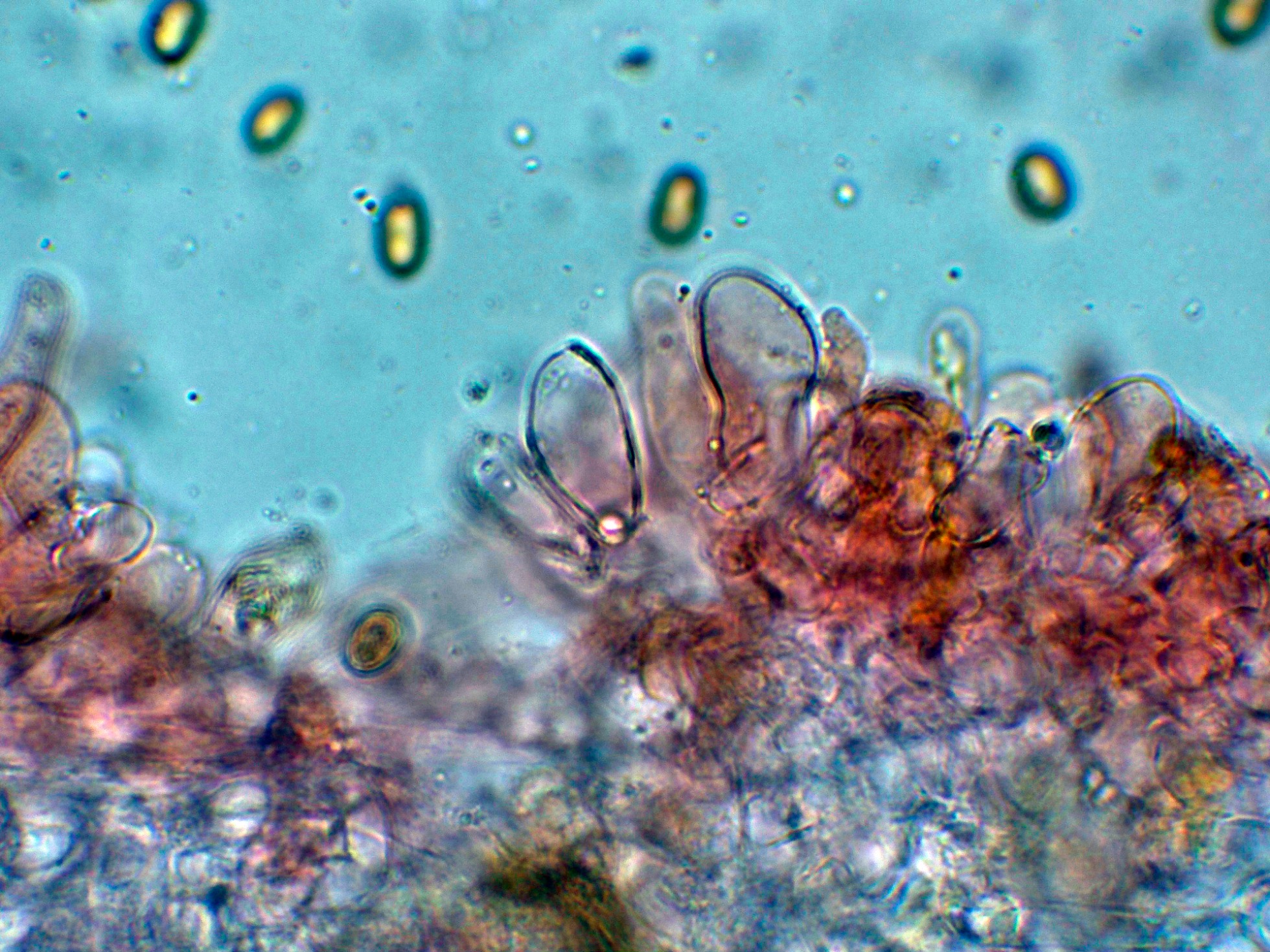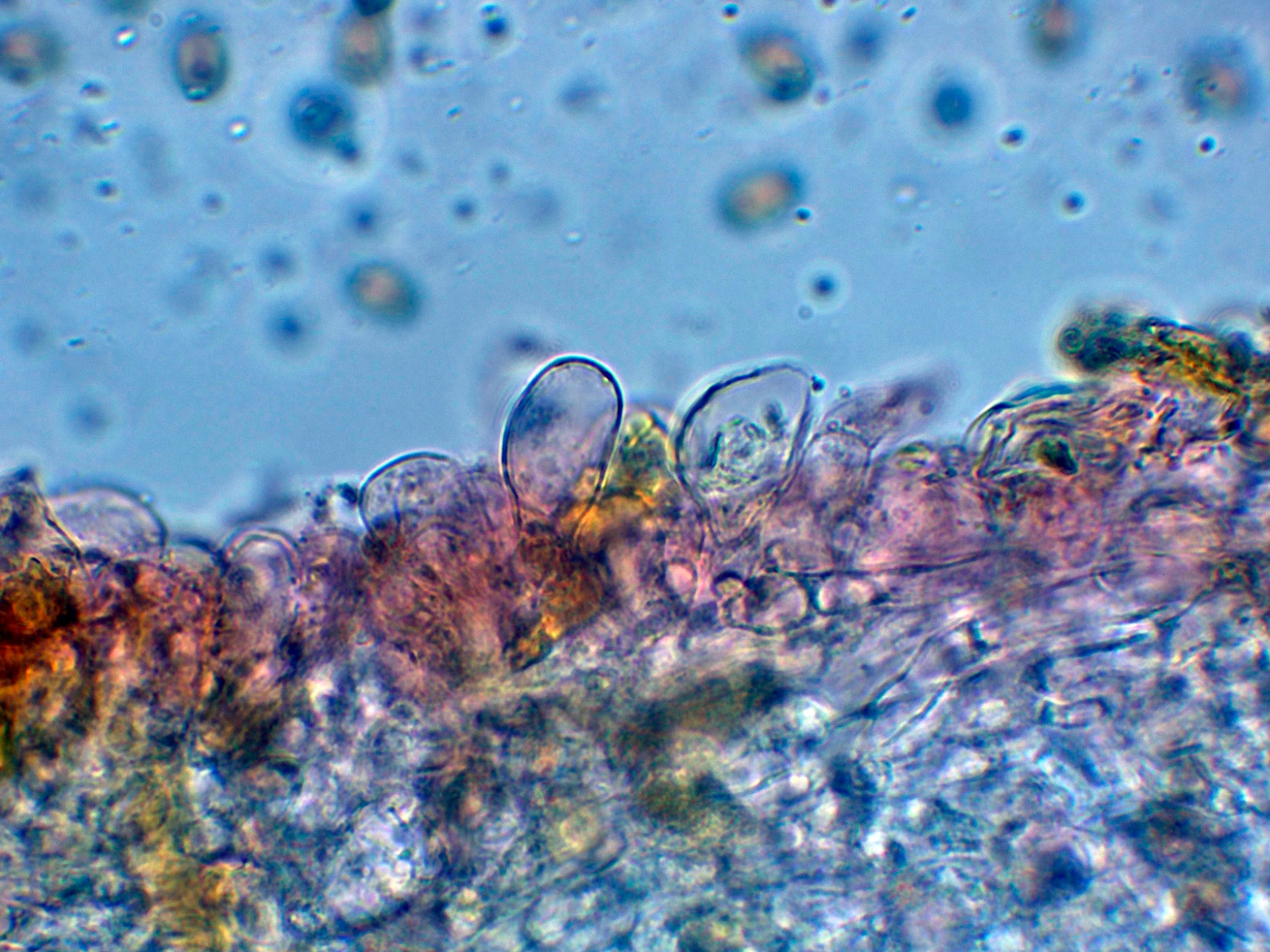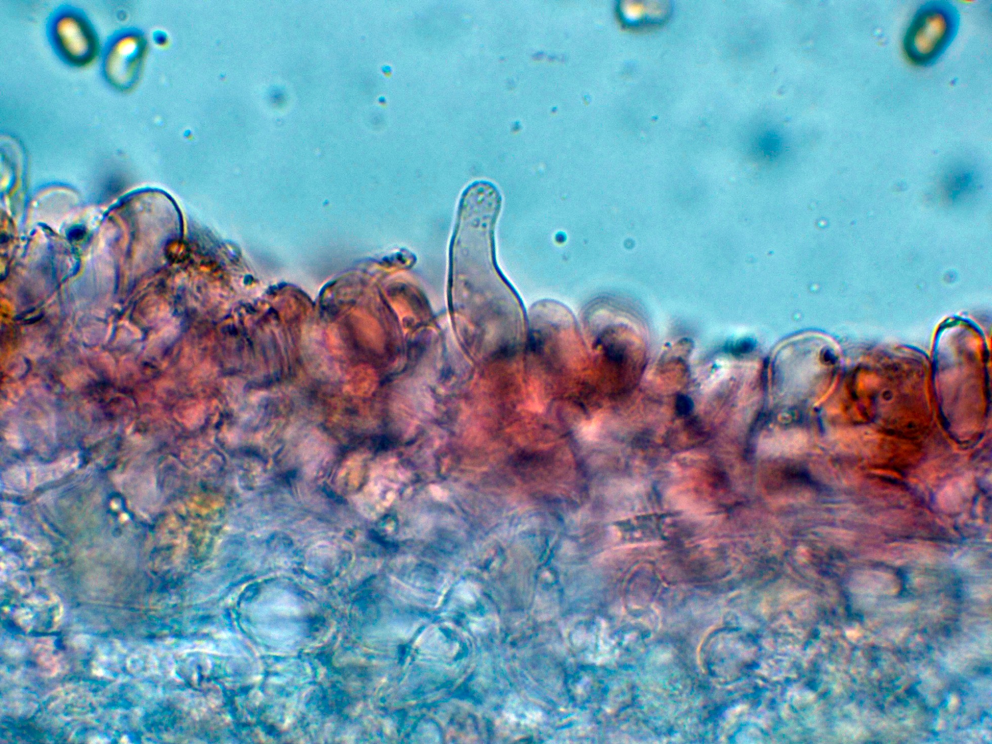 Pileipellis gelificada, con hifas pigmentadas y emergentes a modo de pelos.
