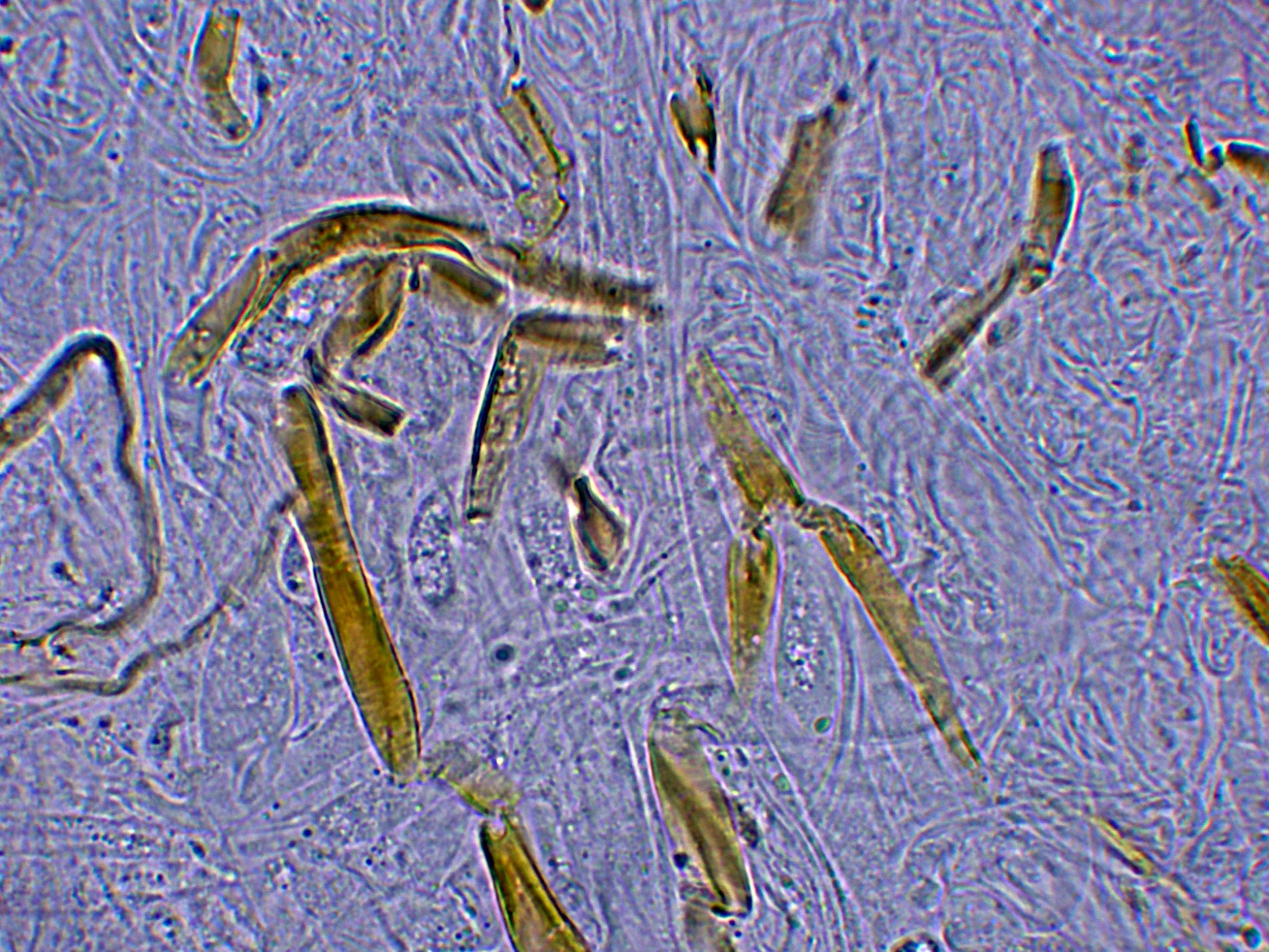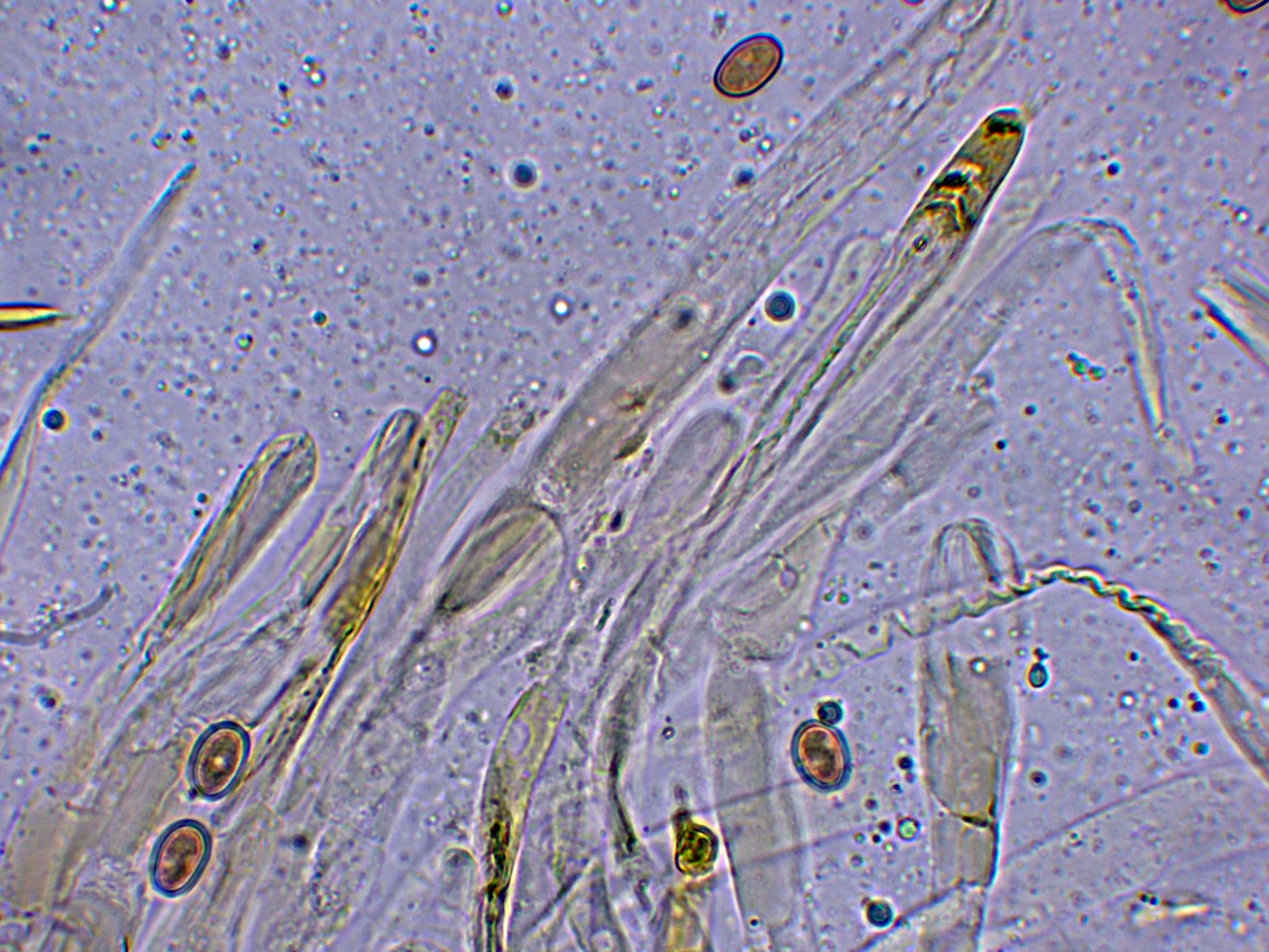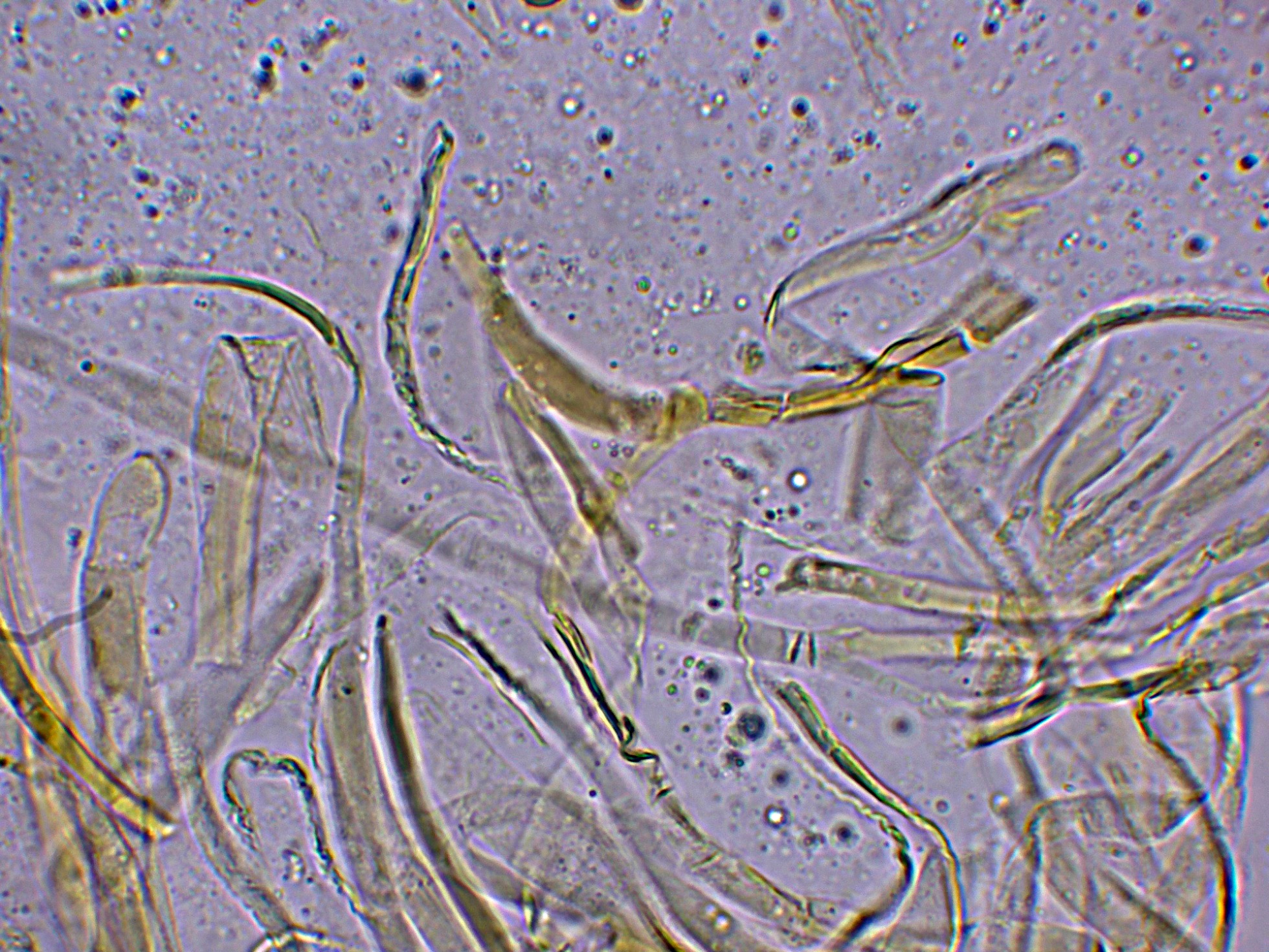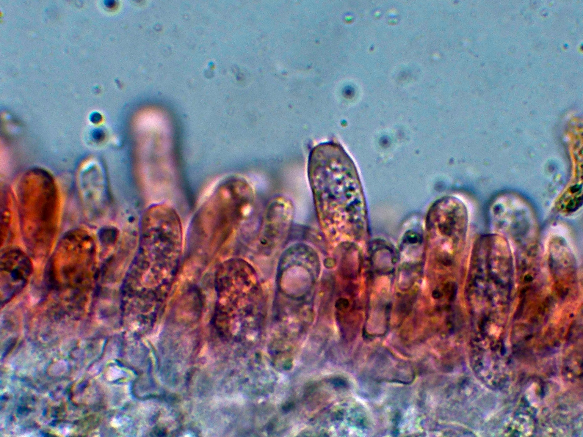 Pileipellis gelificada, con hifas pigmentadas y emergentes a modo de pelos.