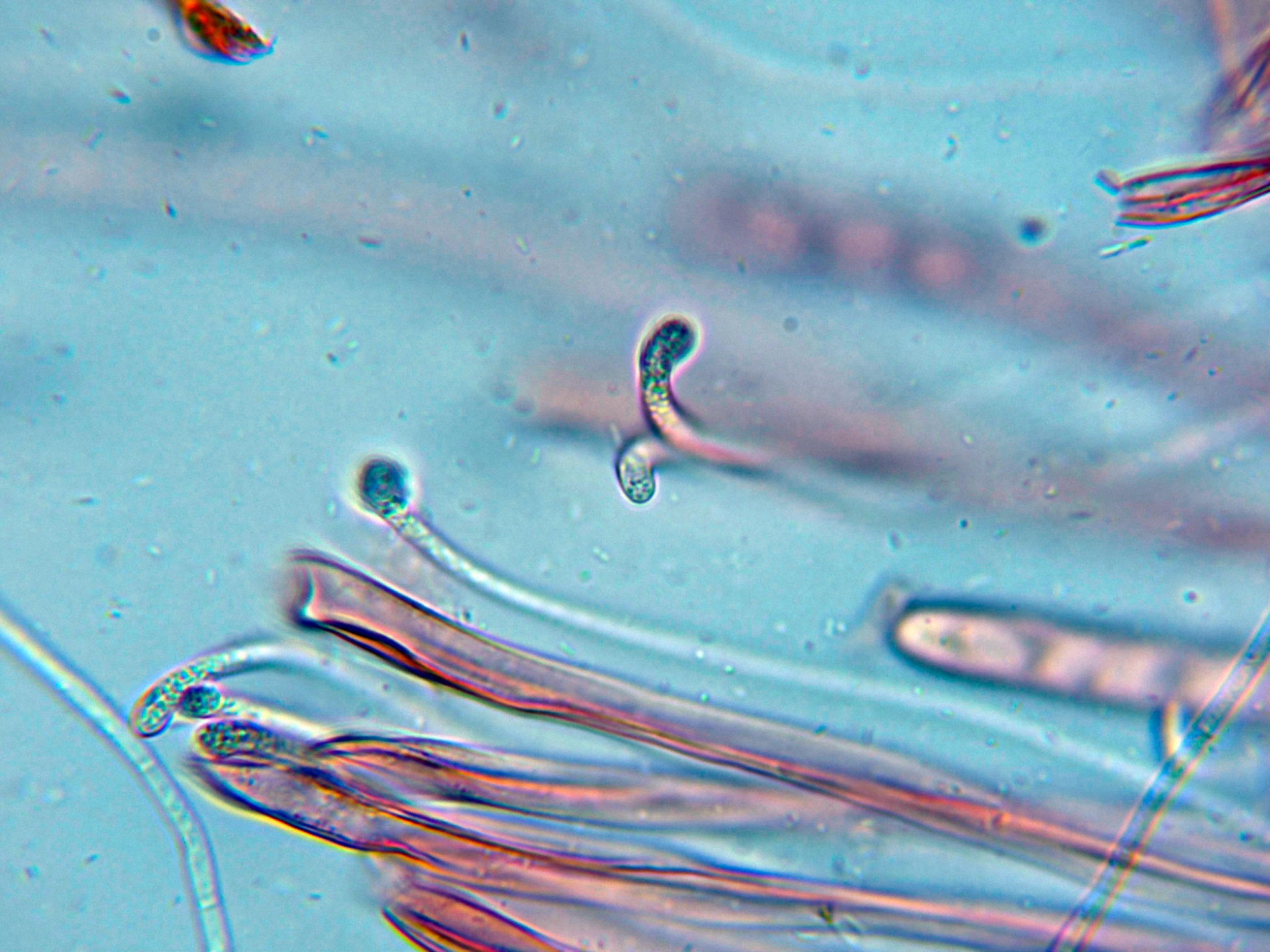 Paráfisis en forma de báculo o bastón, con contenido opaco granuloso en su interior: