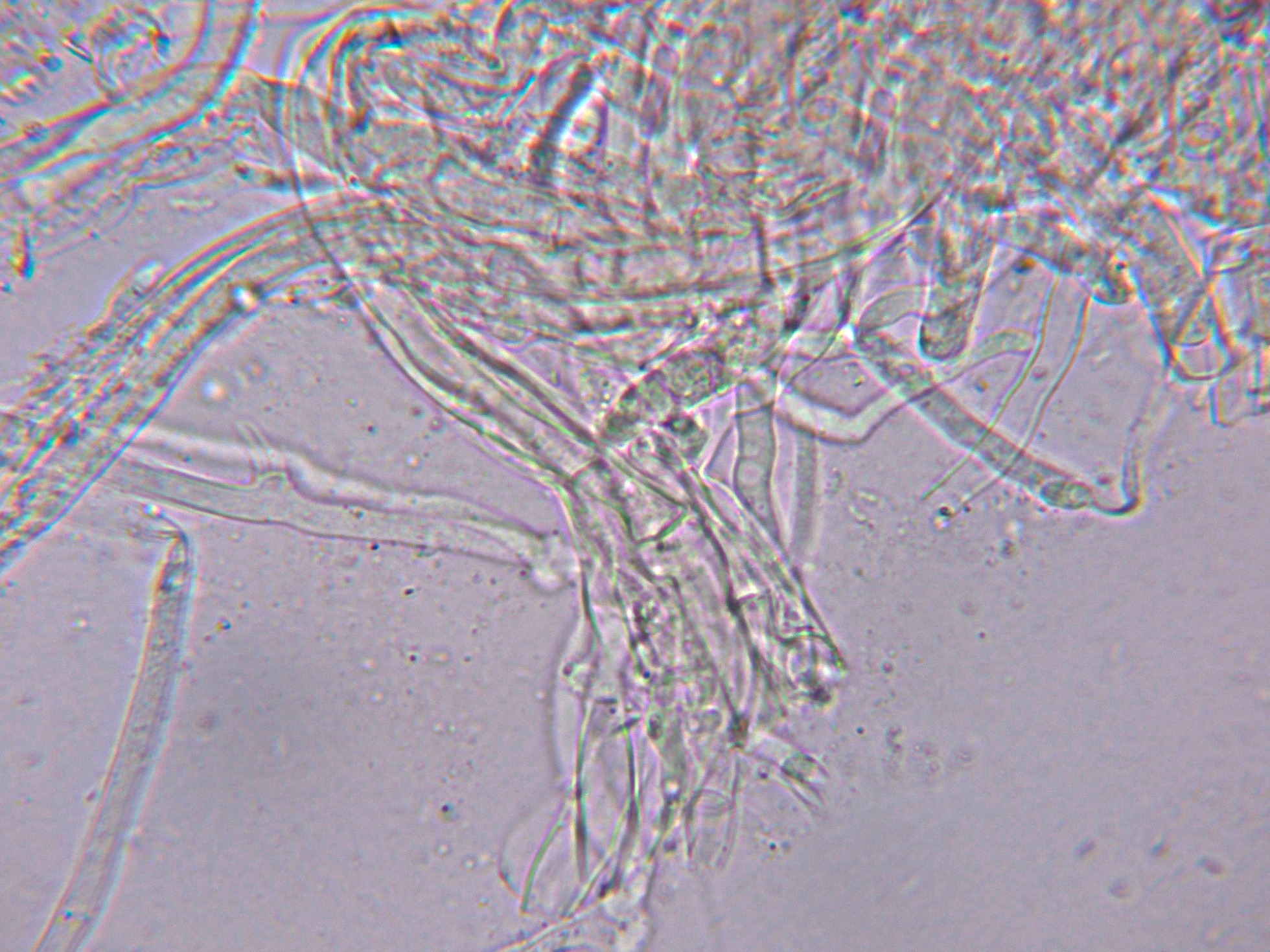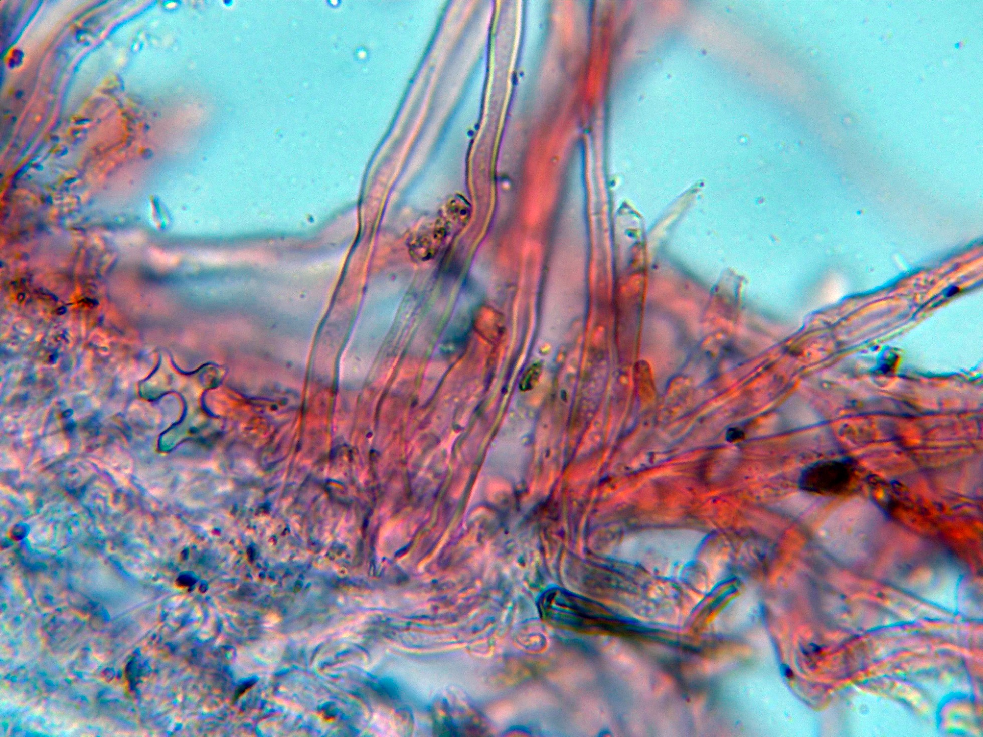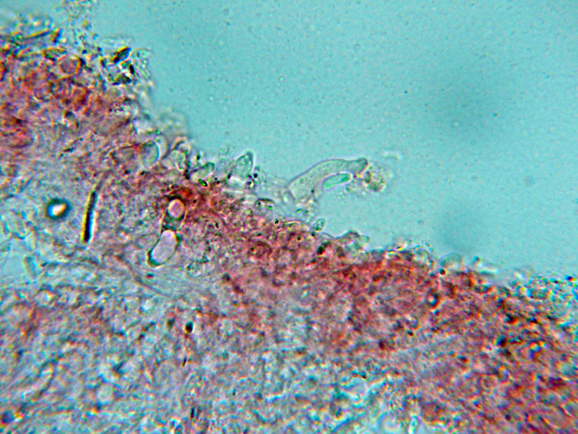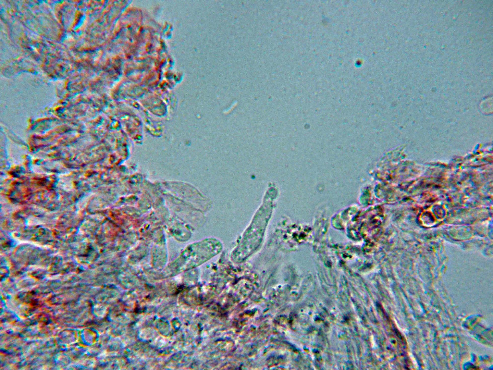 Nada que se diferenciara de manera notable de los basidios o basidiolos, solo un par de estructuras que quizás podrían corresponderse a cistidios o cistidiolos, aunque dada su excepcionalidad debo considerar a la especie como "sin cistidios".