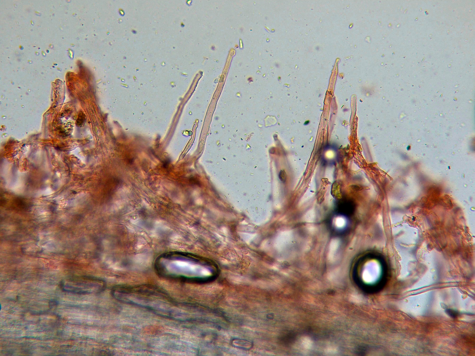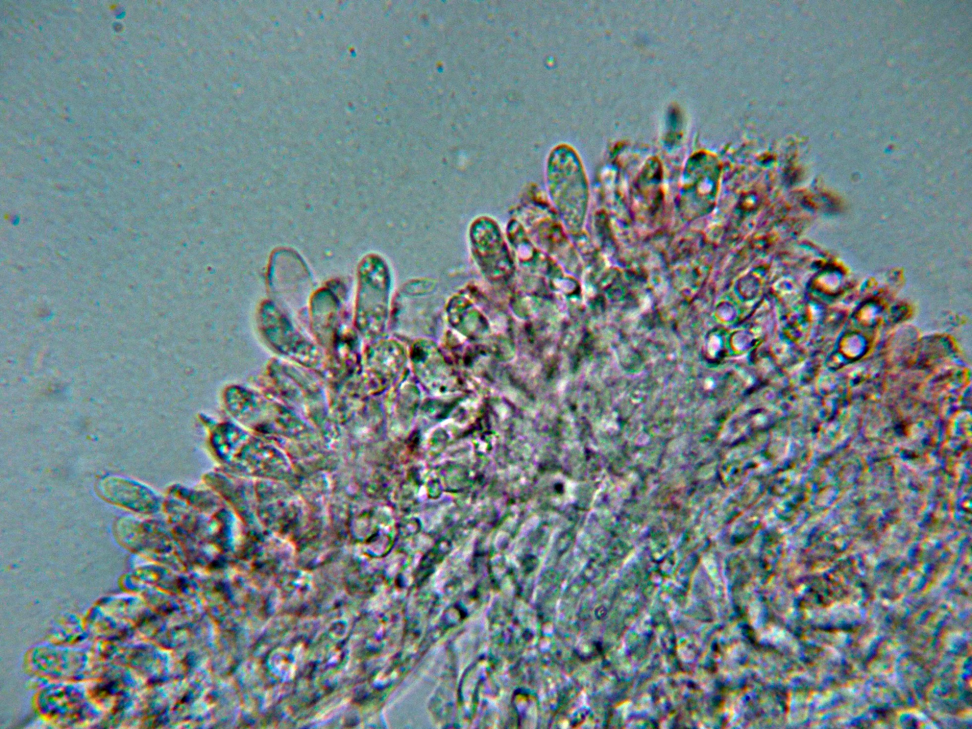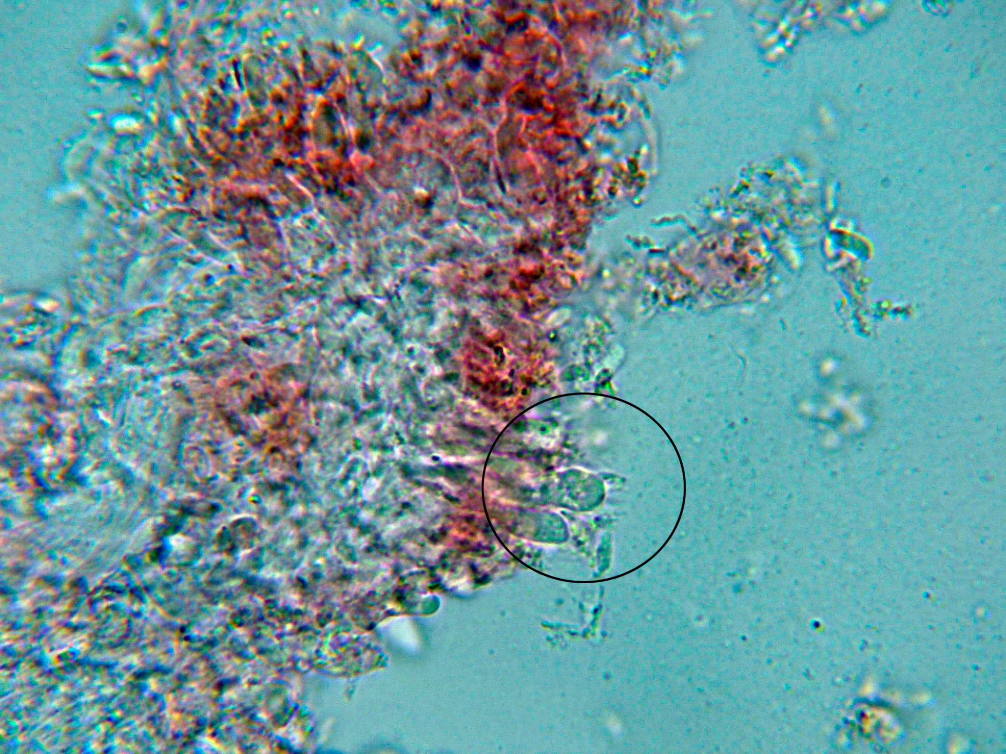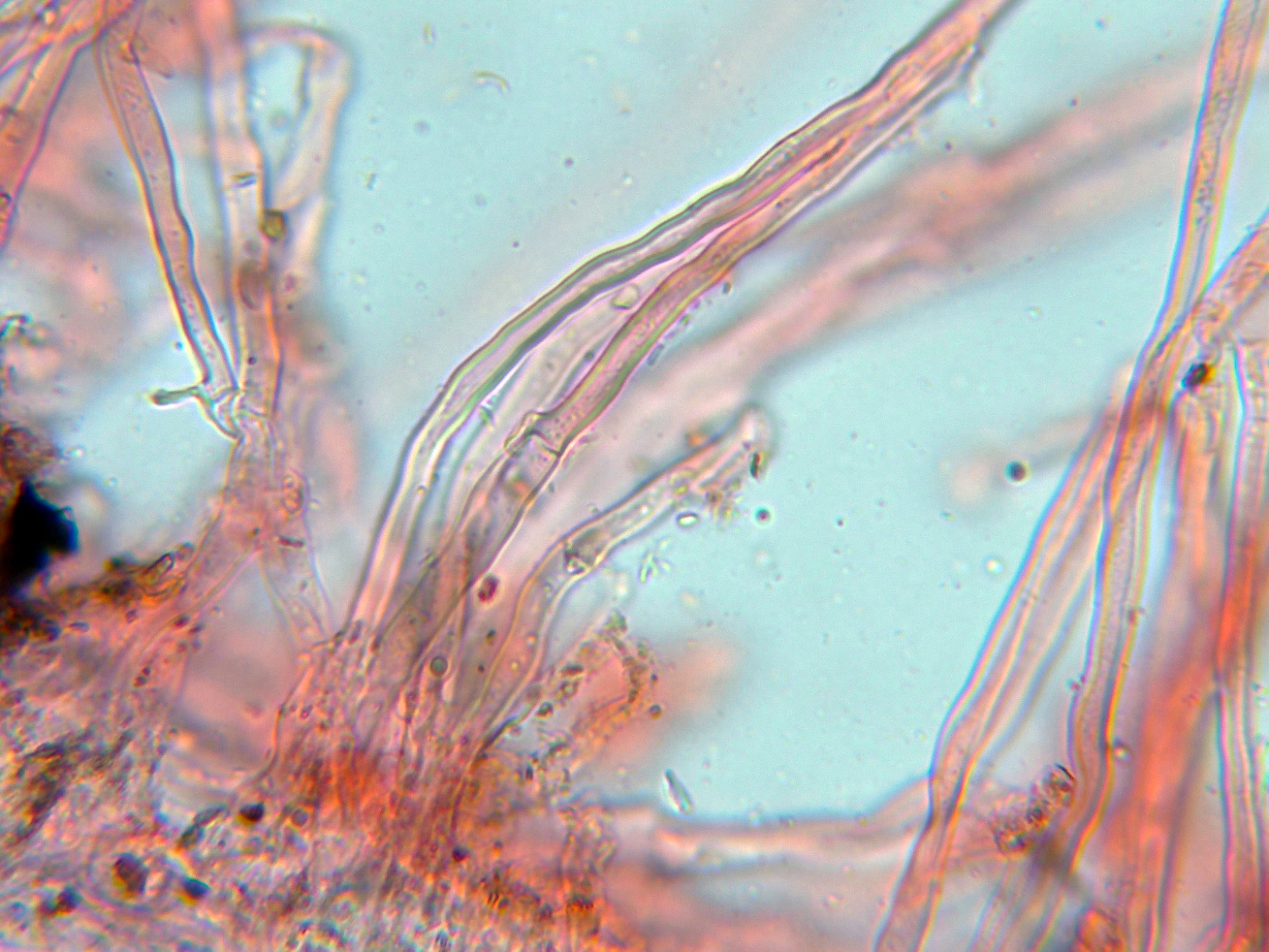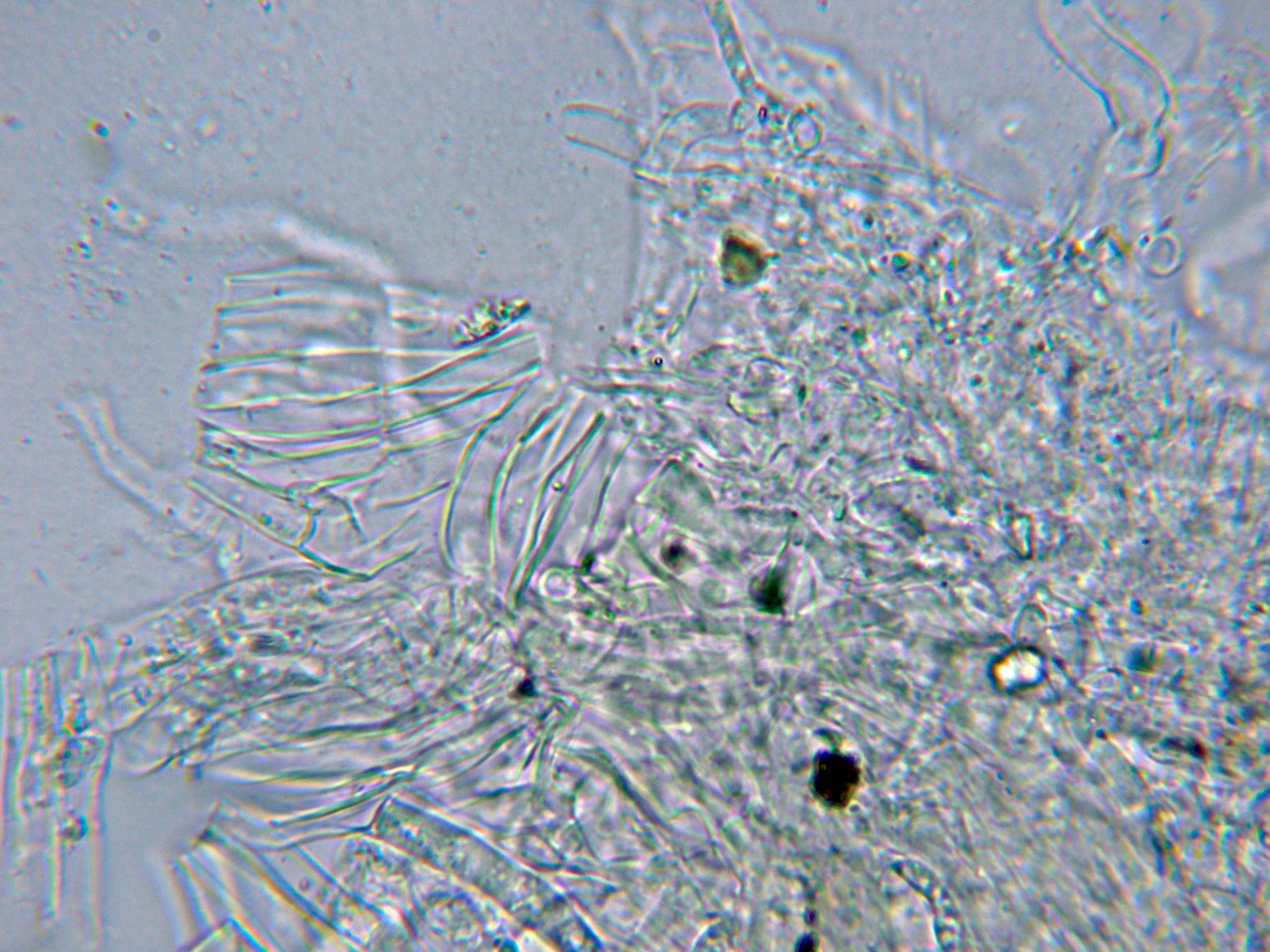 Nada que se diferenciara de manera notable de los basidios o basidiolos, solo un par de estructuras que quizás podrían corresponderse a cistidios o cistidiolos, aunque dada su excepcionalidad debo considerar a la especie como "sin cistidios".