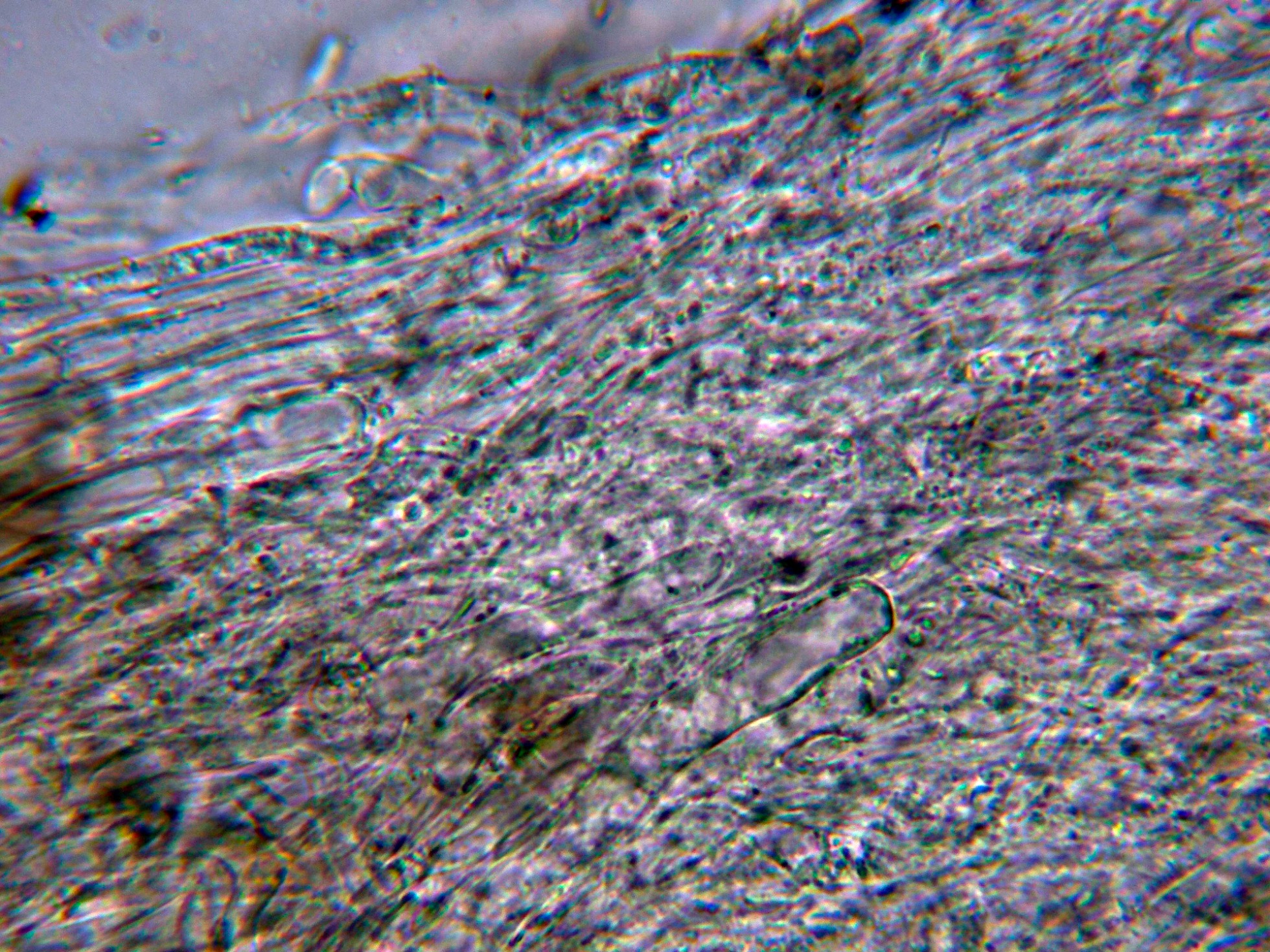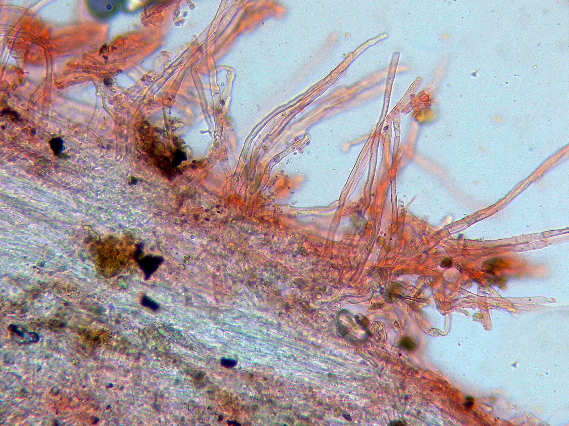 Pileipellis filamentosa con hifas dispuestas más o menos paralelamente, ligeramente pigmentadas y con incrustaciones: