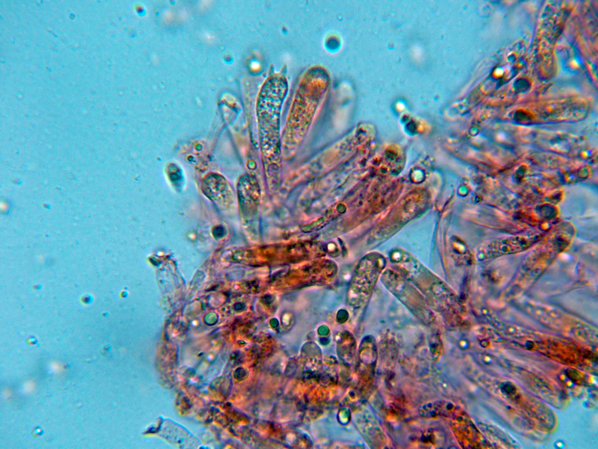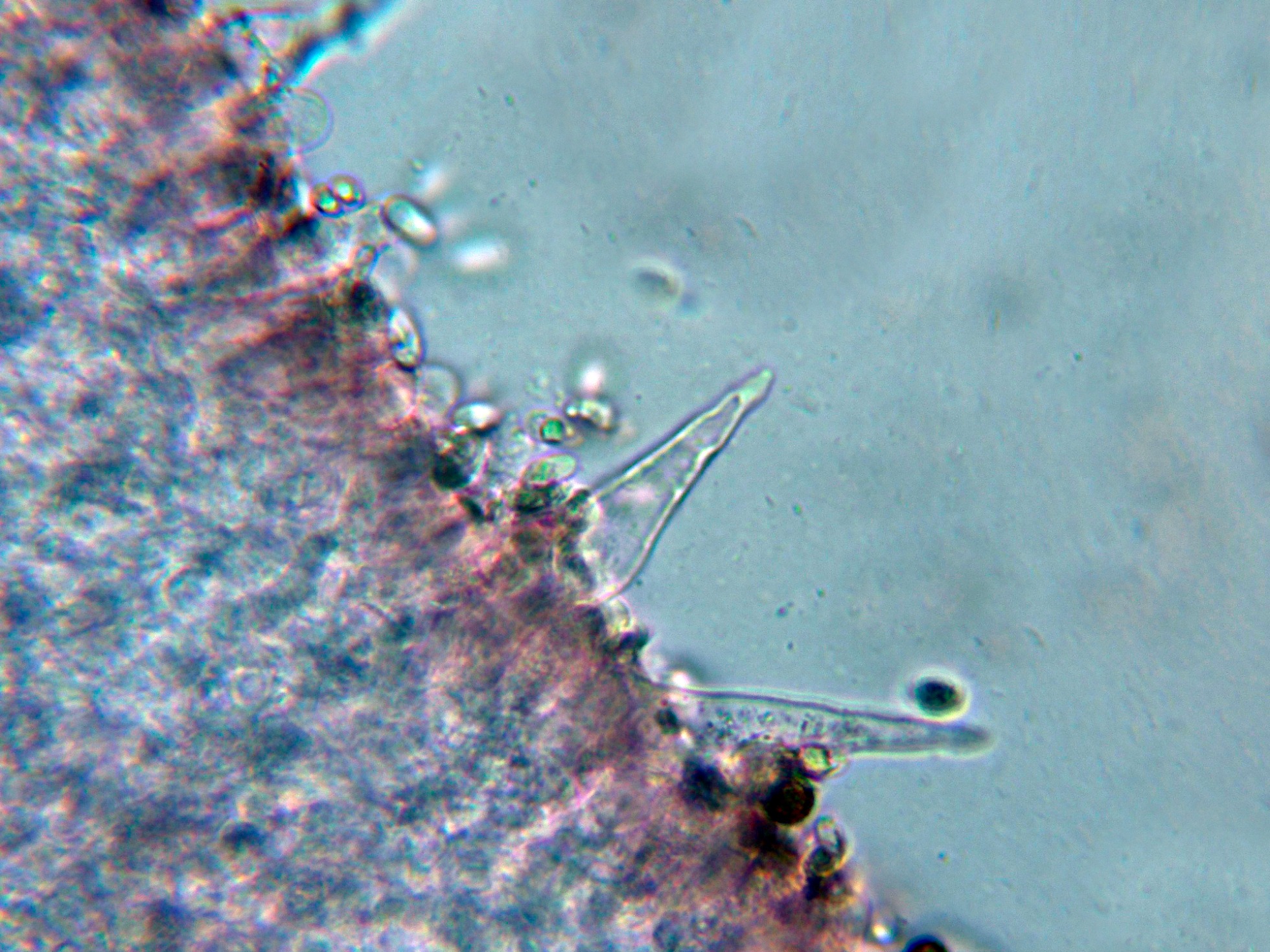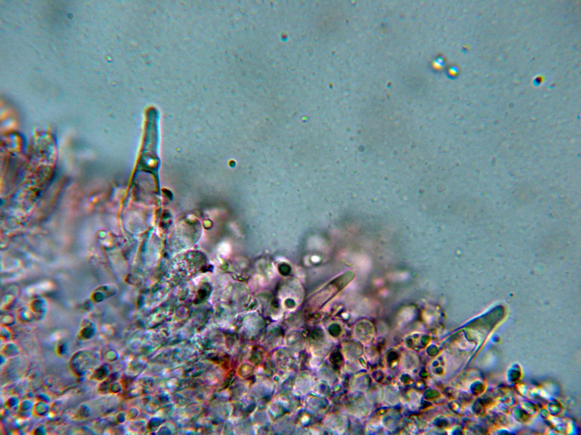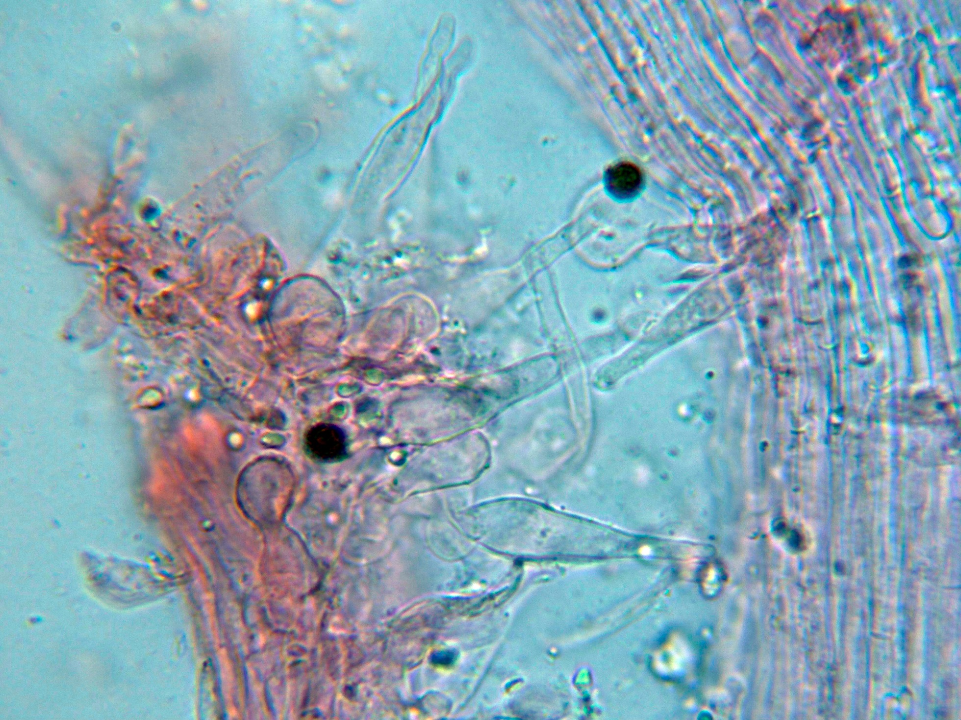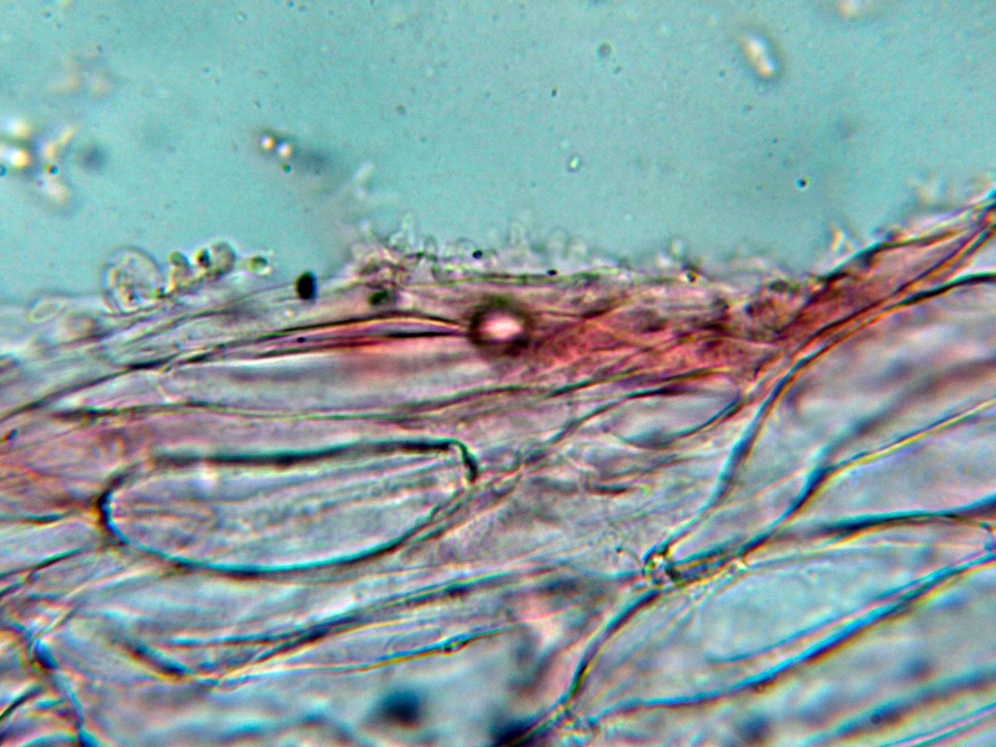 Sin embargo y aunque no se citan en la bibliografía consultada, en la parte alta del pie también pude observar algun caulocistidio mezclado con los anteriores con una morfología parecida a los queilocistidios.