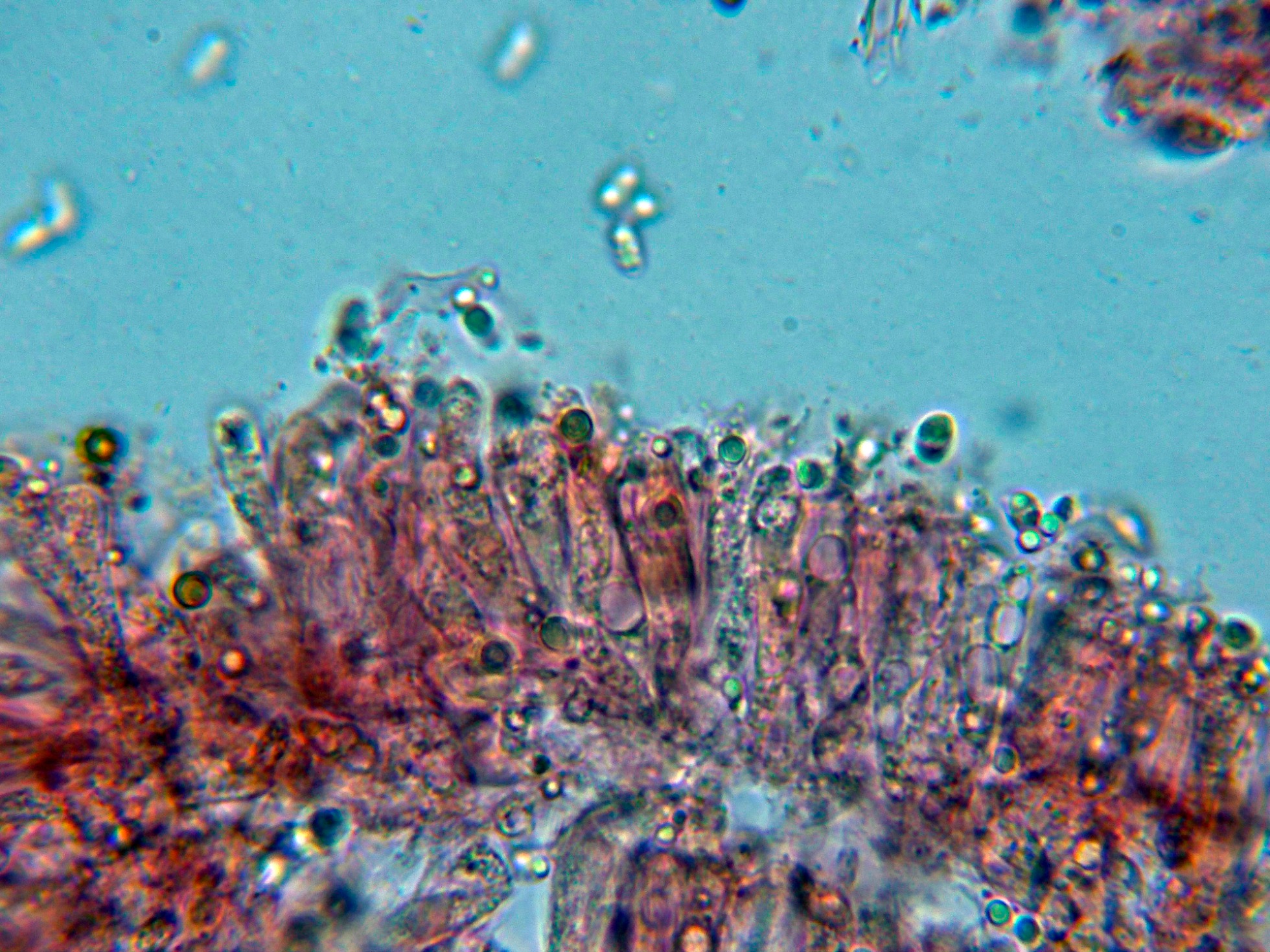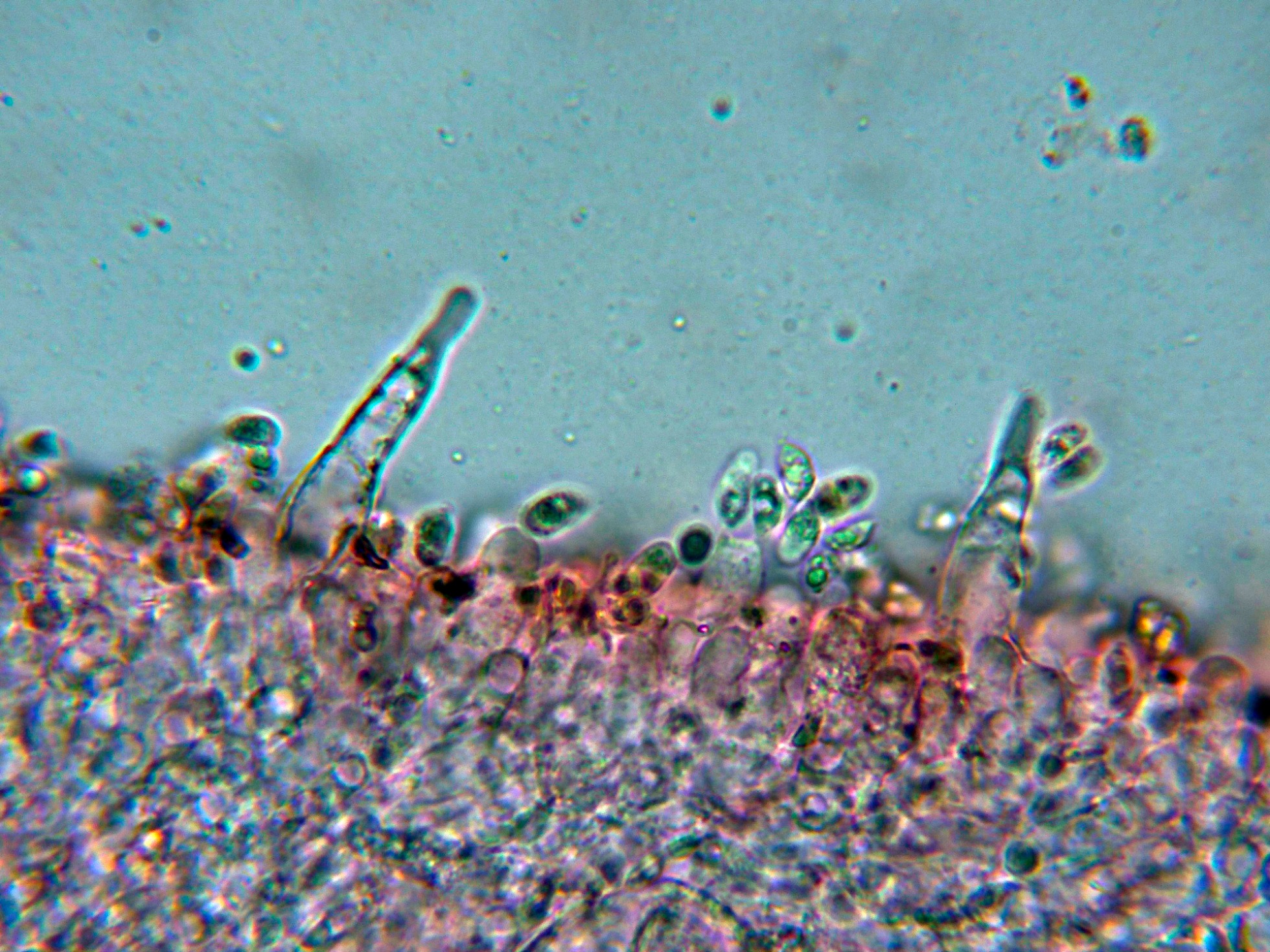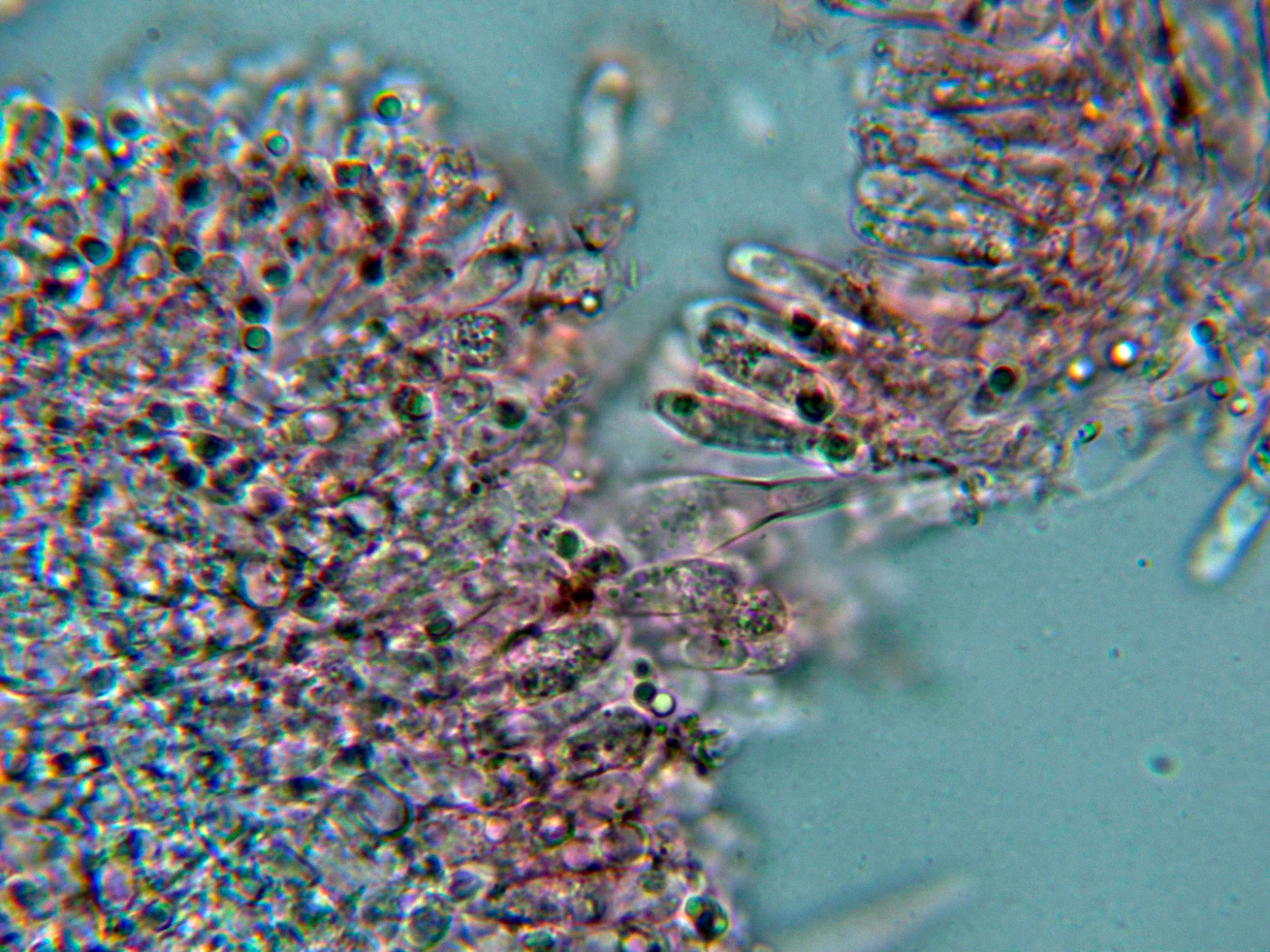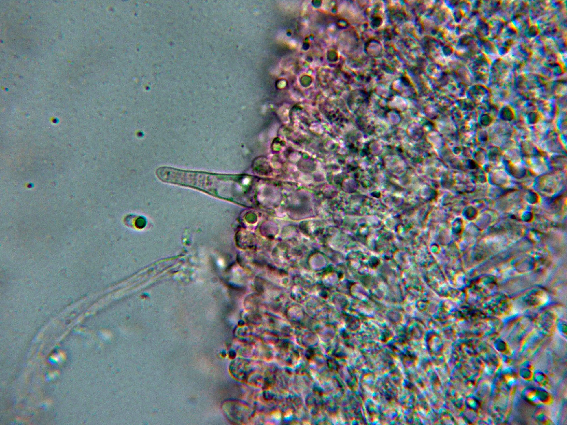 Sin embargo y aunque no se citan en la bibliografía consultada, en la parte alta del pie también pude observar algun caulocistidio mezclado con los anteriores con una morfología parecida a los queilocistidios.