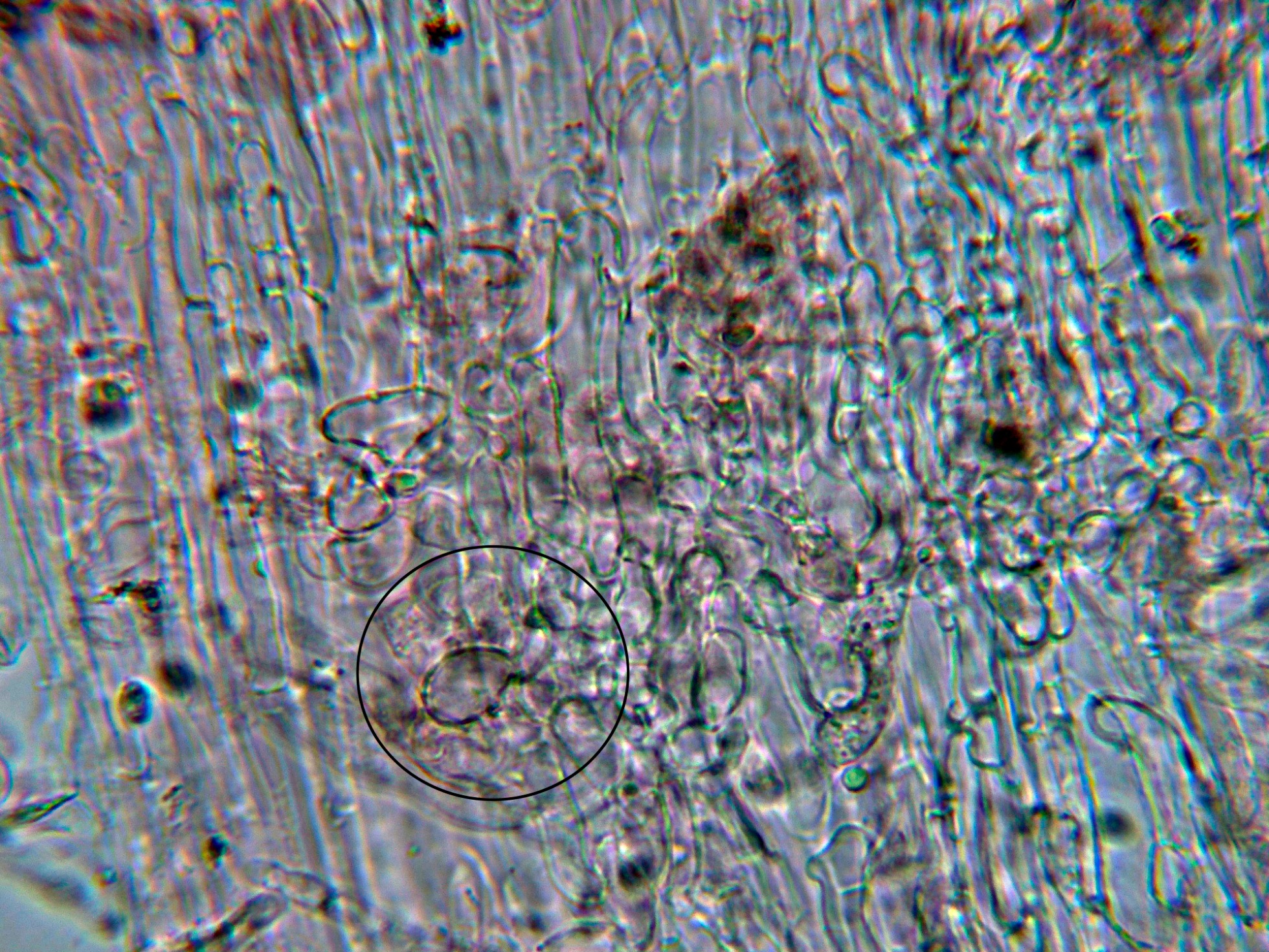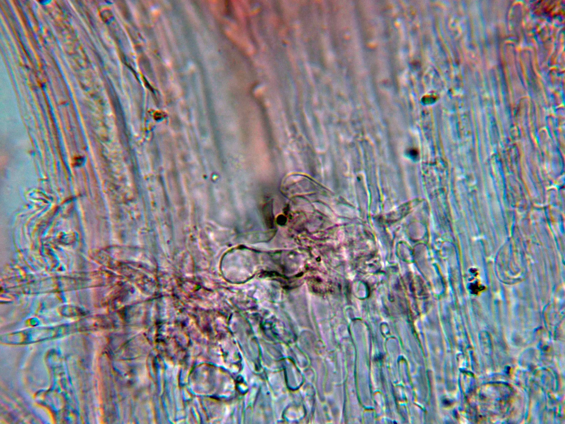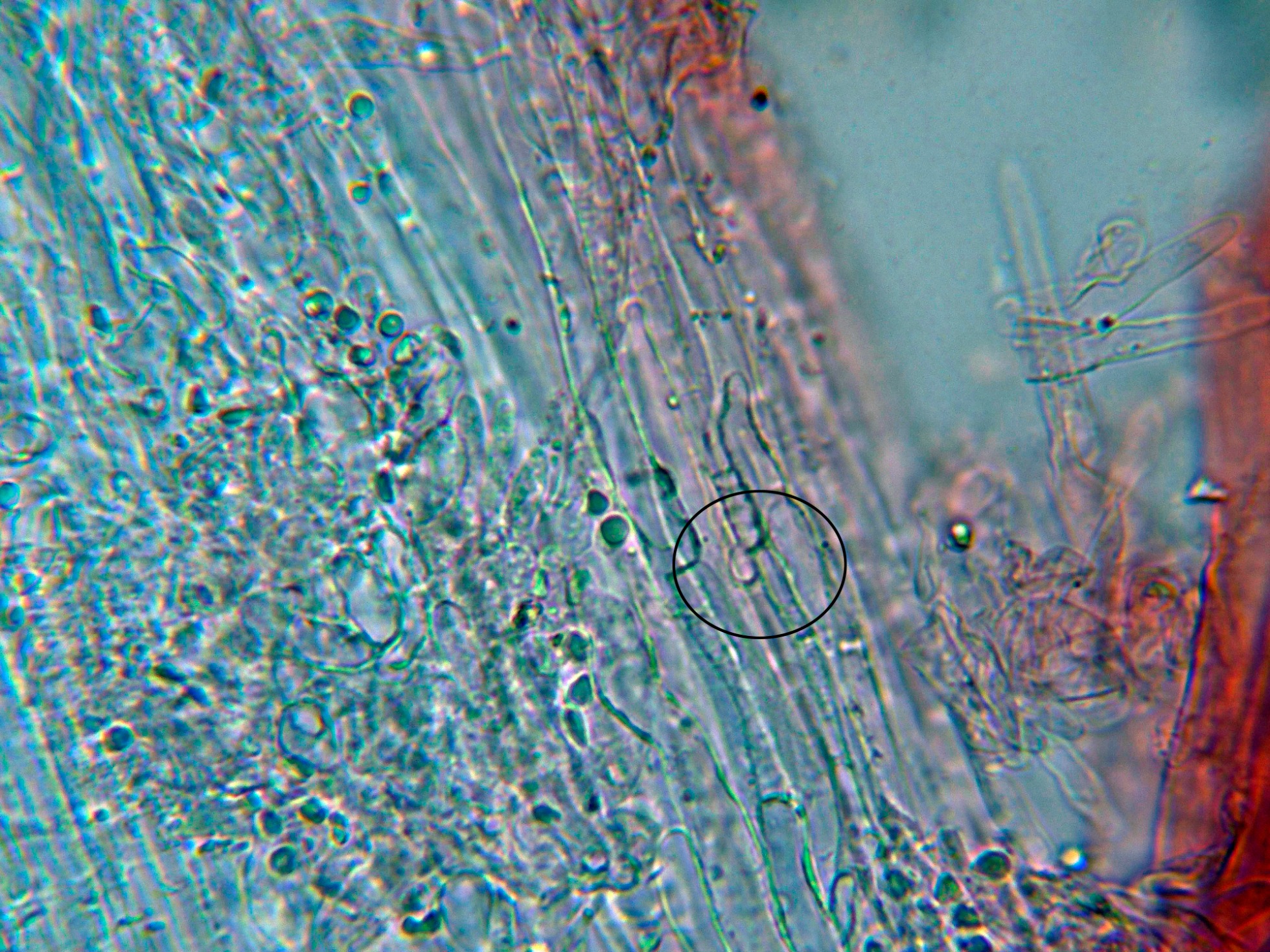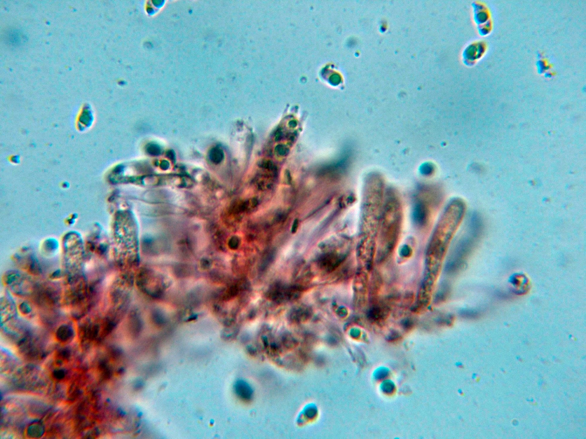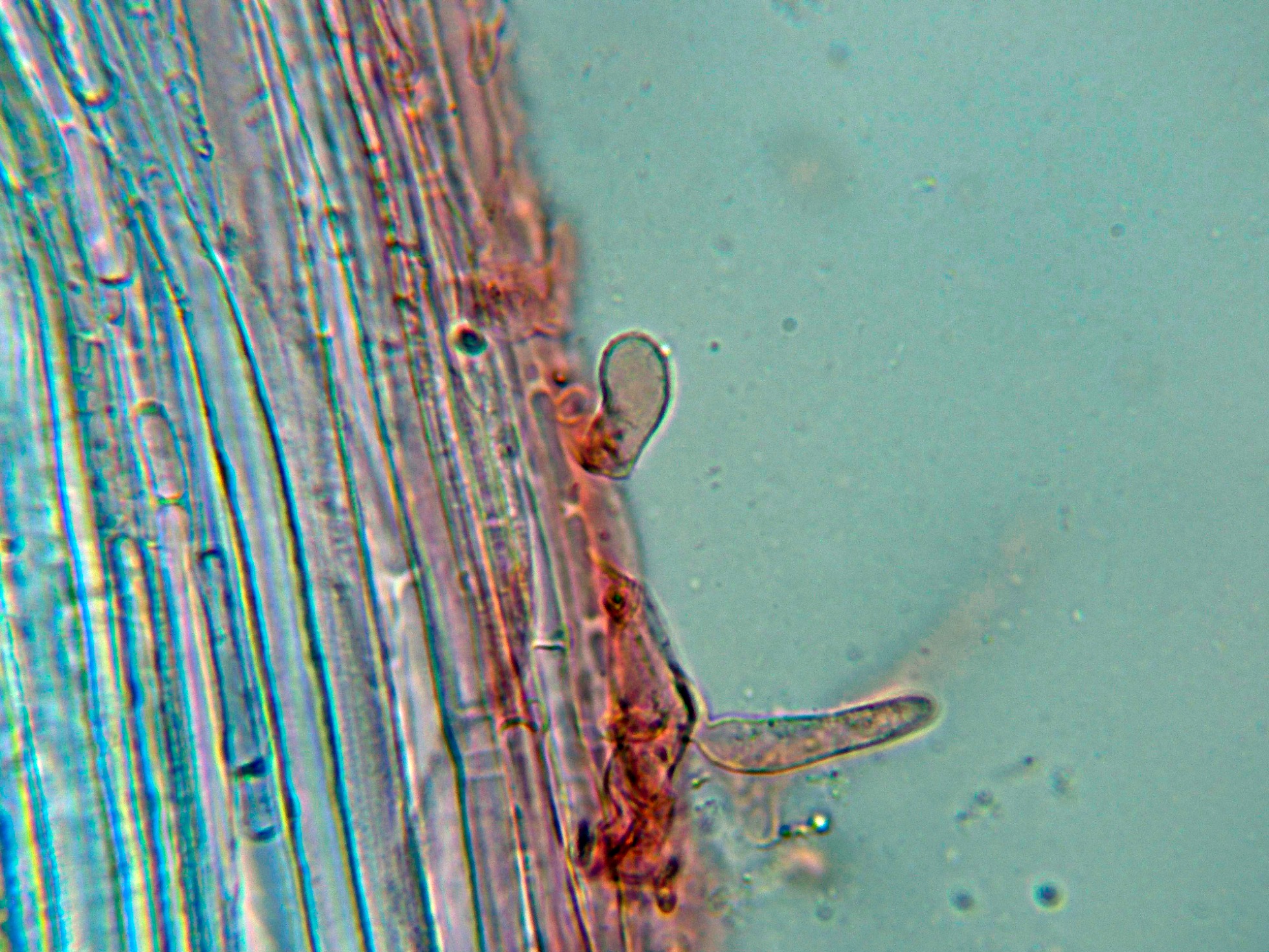 Sin embargo y aunque no se citan en la bibliografía consultada, en la parte alta del pie también pude observar algun caulocistidio mezclado con los anteriores con una morfología parecida a los queilocistidios.