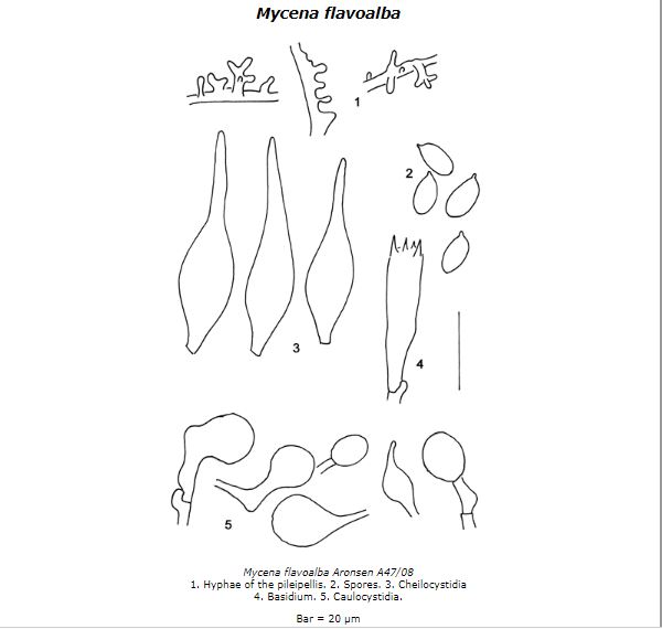 Y para reforzar el criterio de A. Aronsen, y como muy cerca de la anterior encontramos y recogimos muestras de lo que es la Mycena flavoalba tipo, dejo un resumen de la microscopía obtenida: