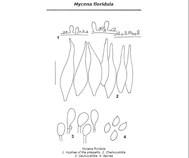Con unas medidas esporales de (7.5) 7.8 - 9 (9.3) × (3.8) 3.9 - 4.7 µm. y un cociente Q= 1.8 - 2.29 (2.3) y una Qe = 2, y una microscopía prácticamente idéntica a la de la Mycena floridula descrita por el mismo autor.