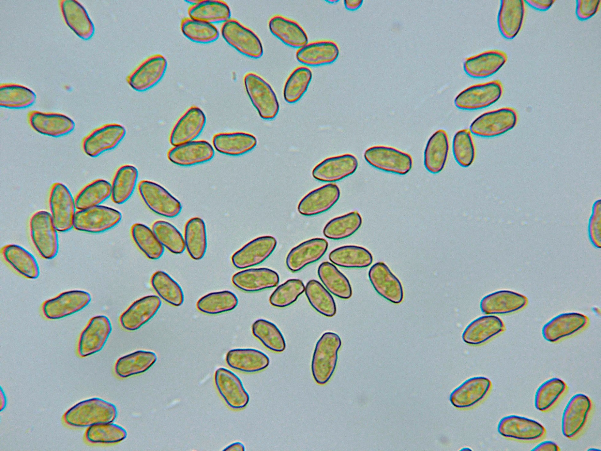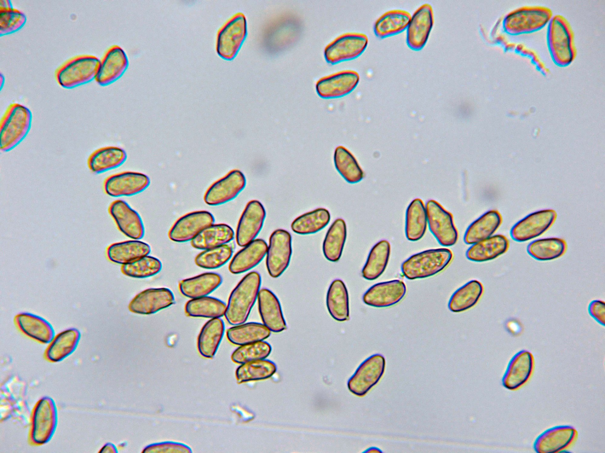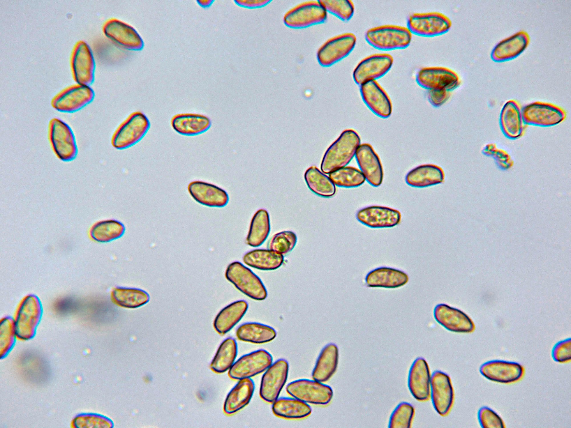 Esporas irregulares, elipsoidales de color marrón amarillento.