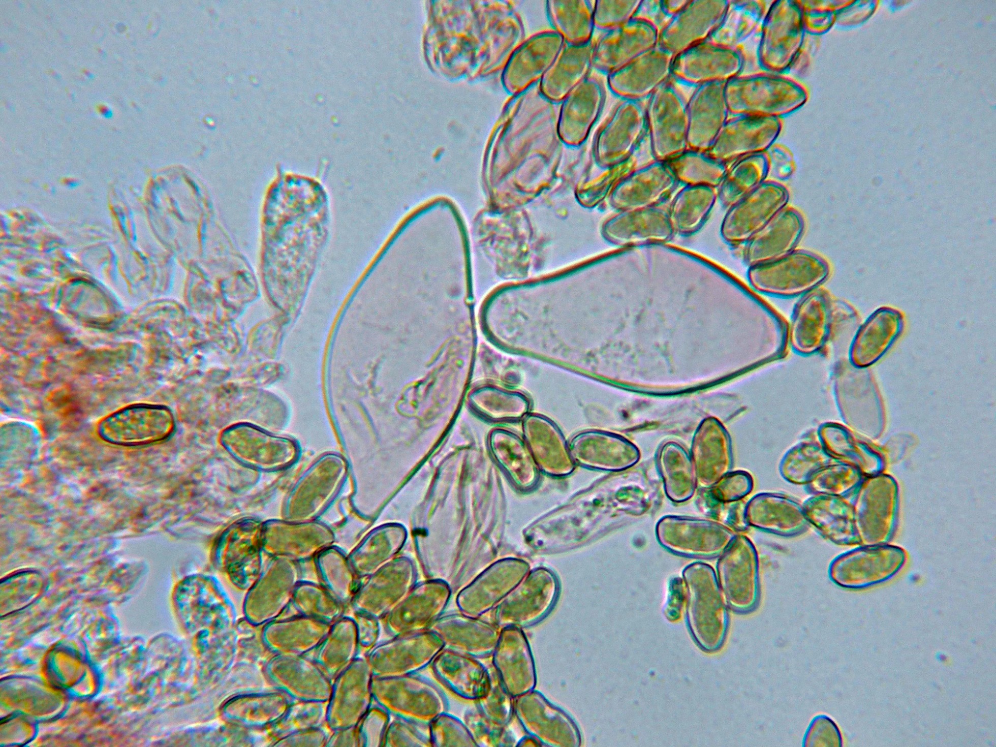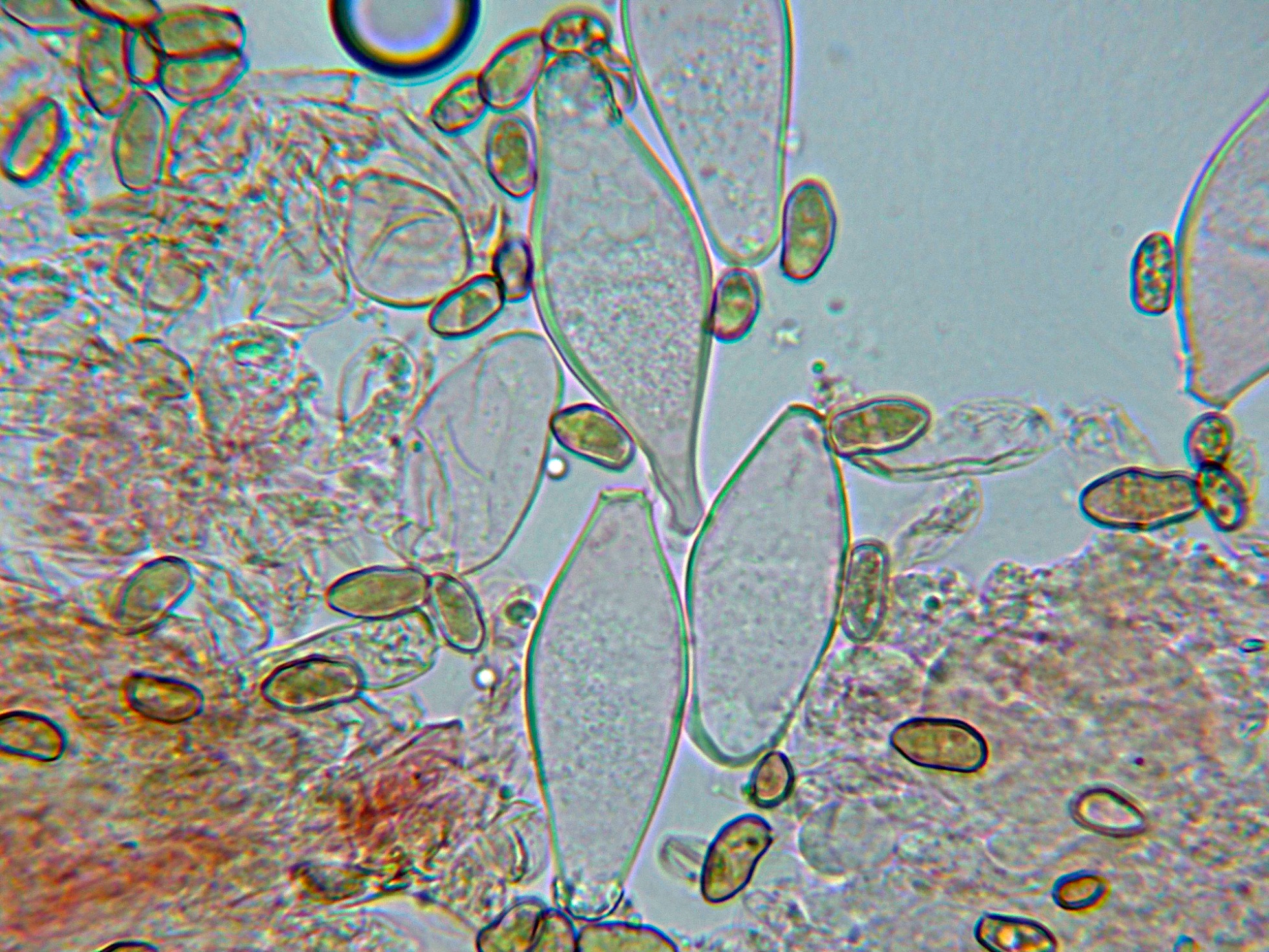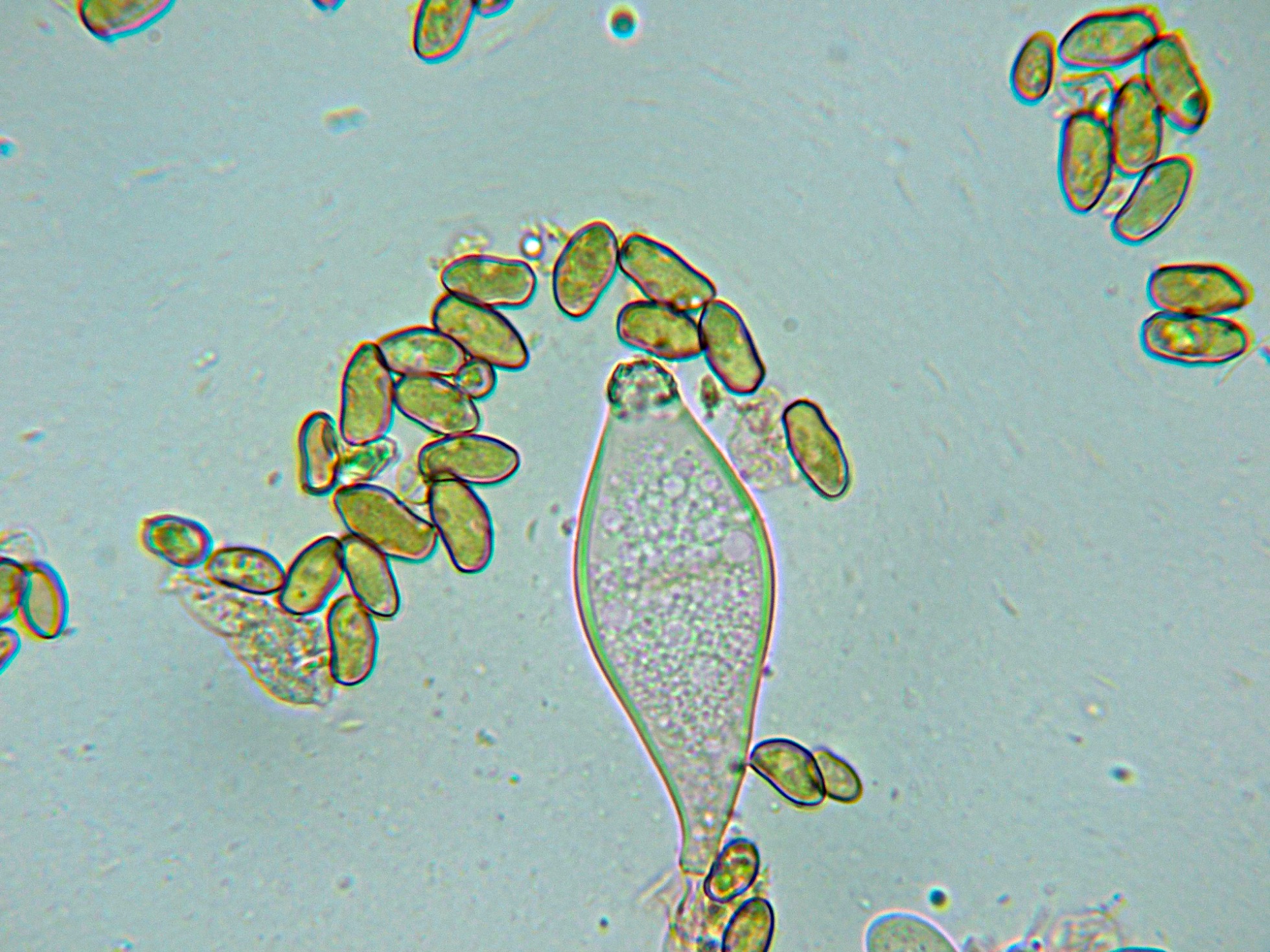 Esporas irregulares, elipsoidales de color marrón amarillento.