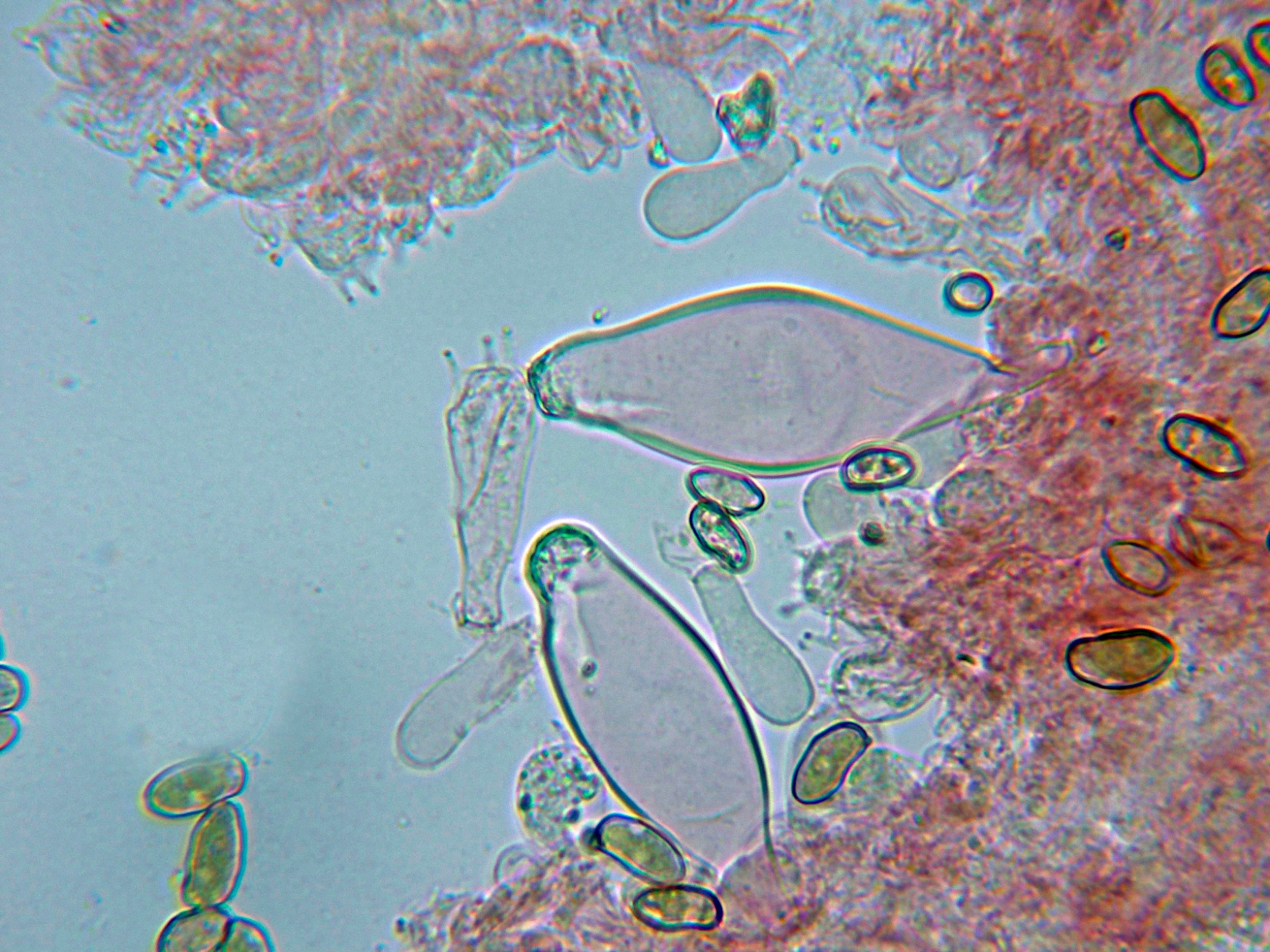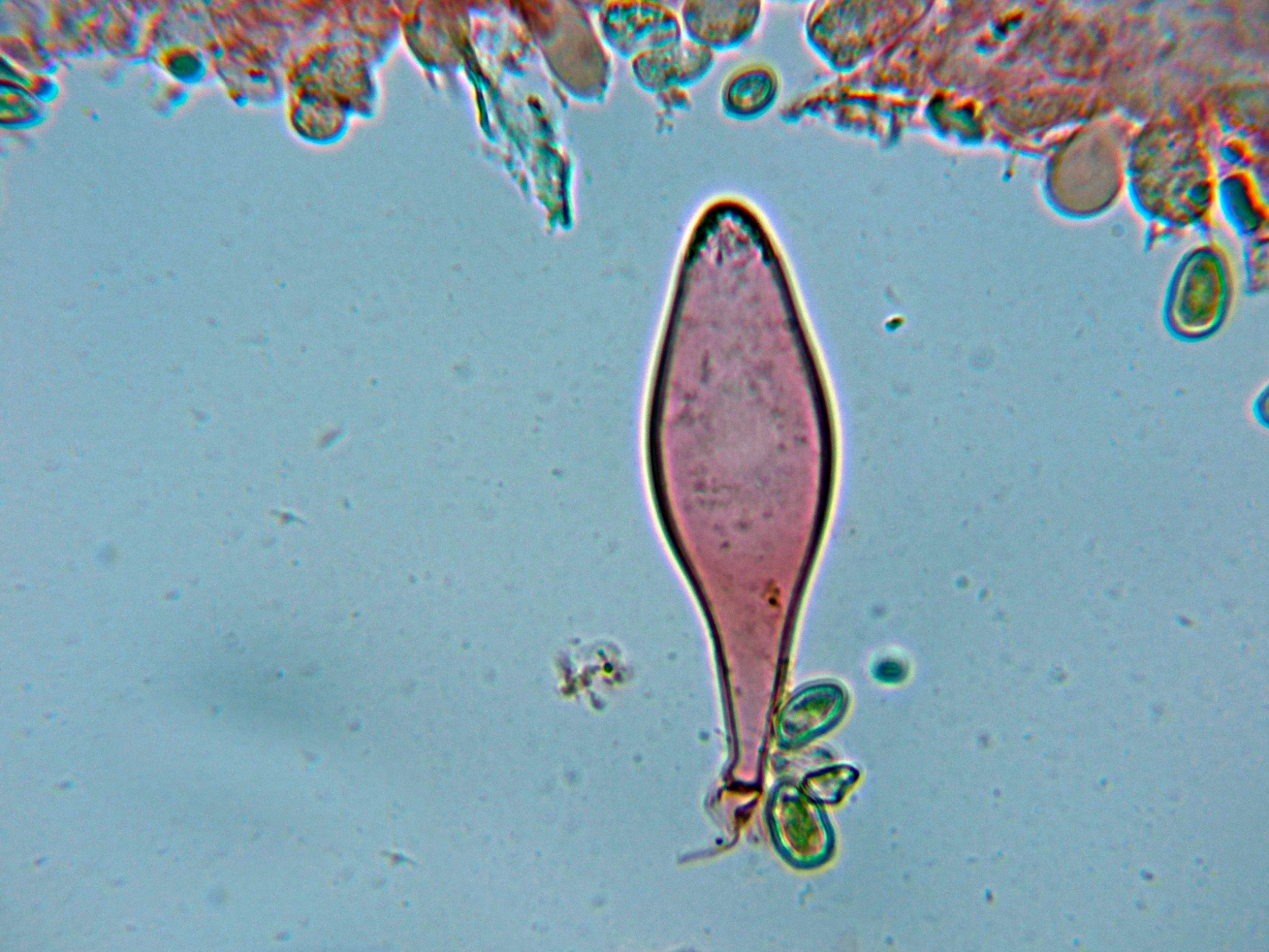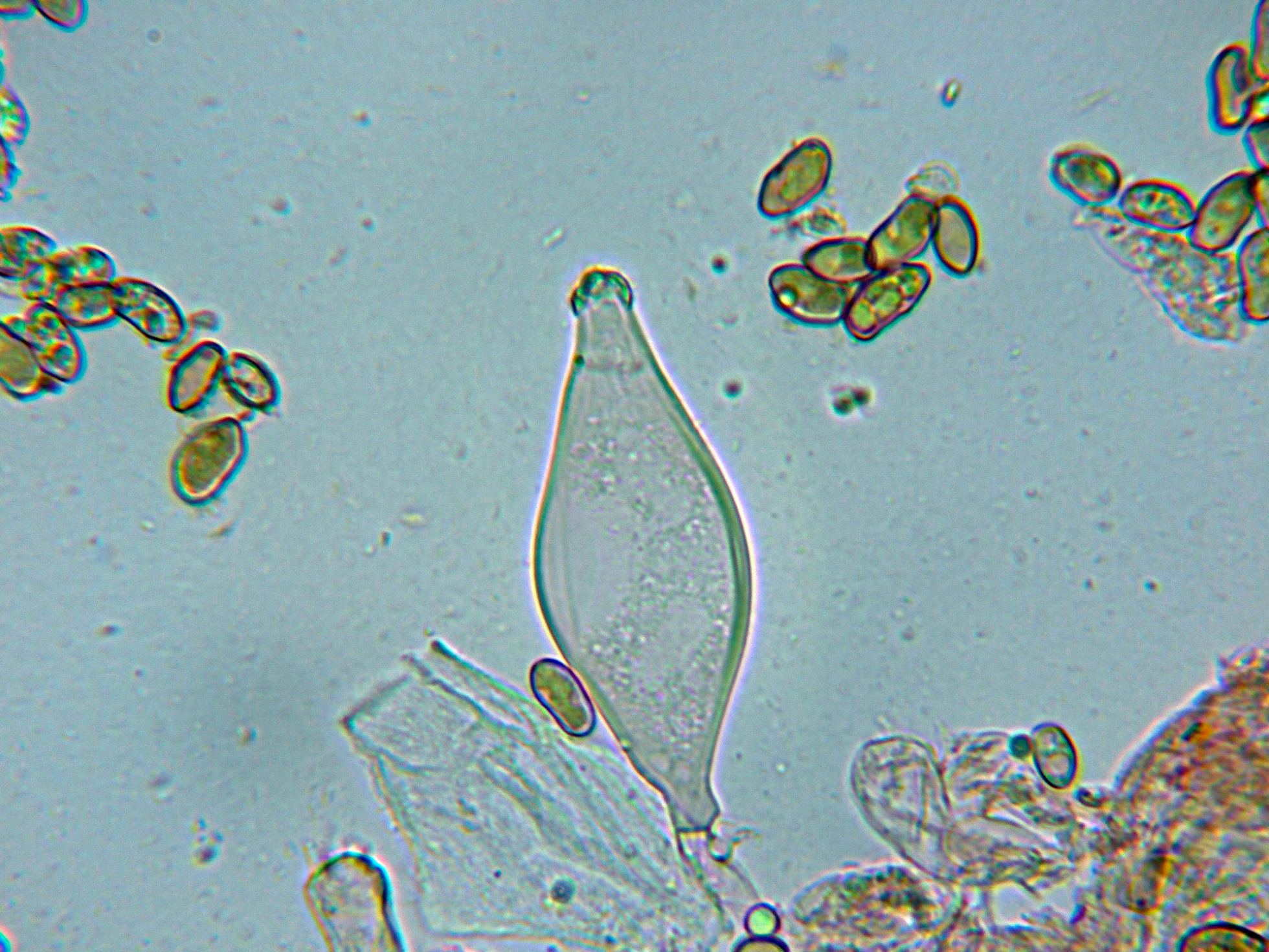 Queilocistidios fusiformes, muy ensanchados, de pared gruesa y muchos de ellos con cristalizaciones amorfas de materia incrustante en el ápice.