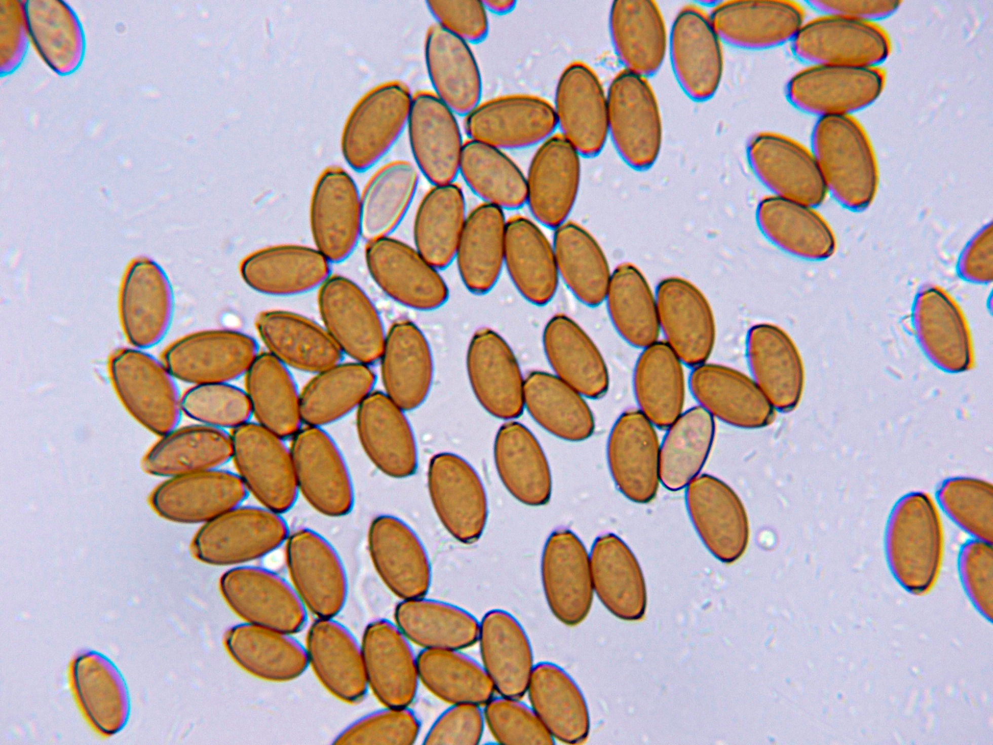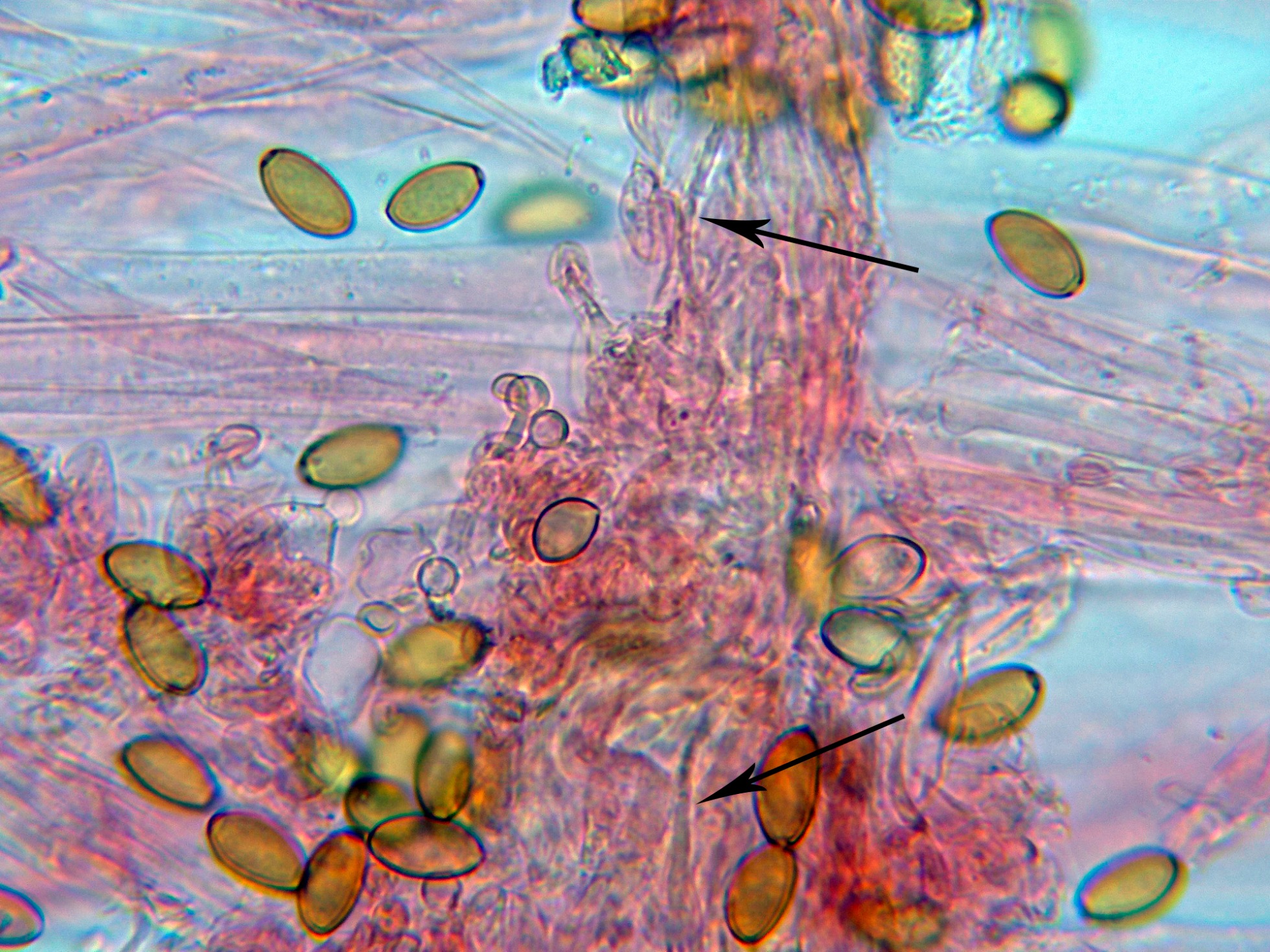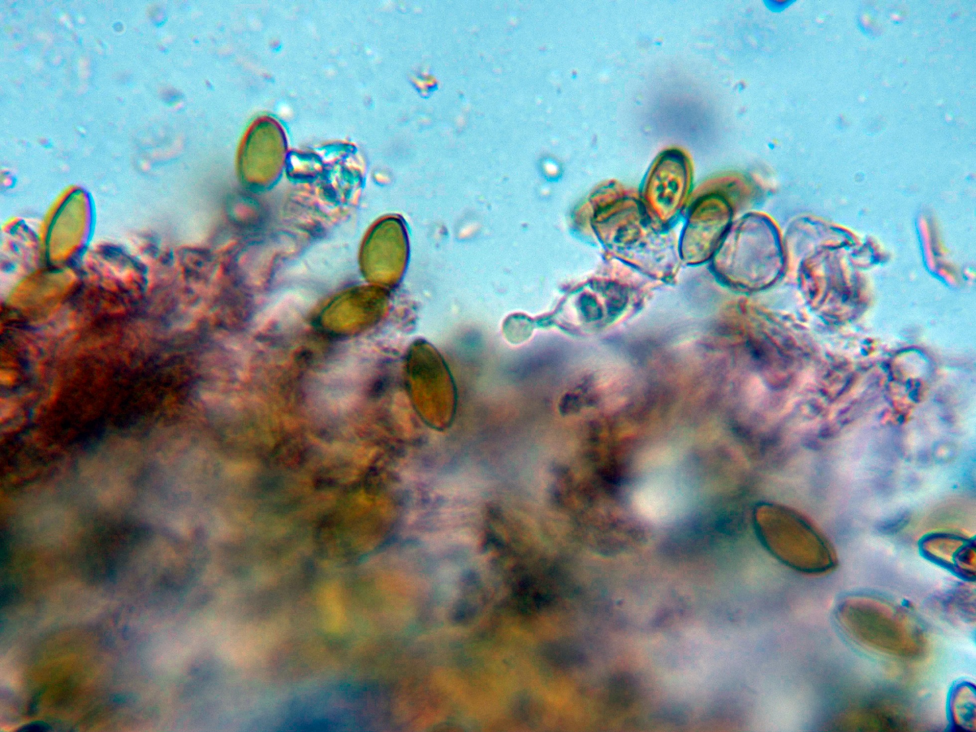 Las esporas en KOH, con fuerte reacción a marrón rojizo oscuro.