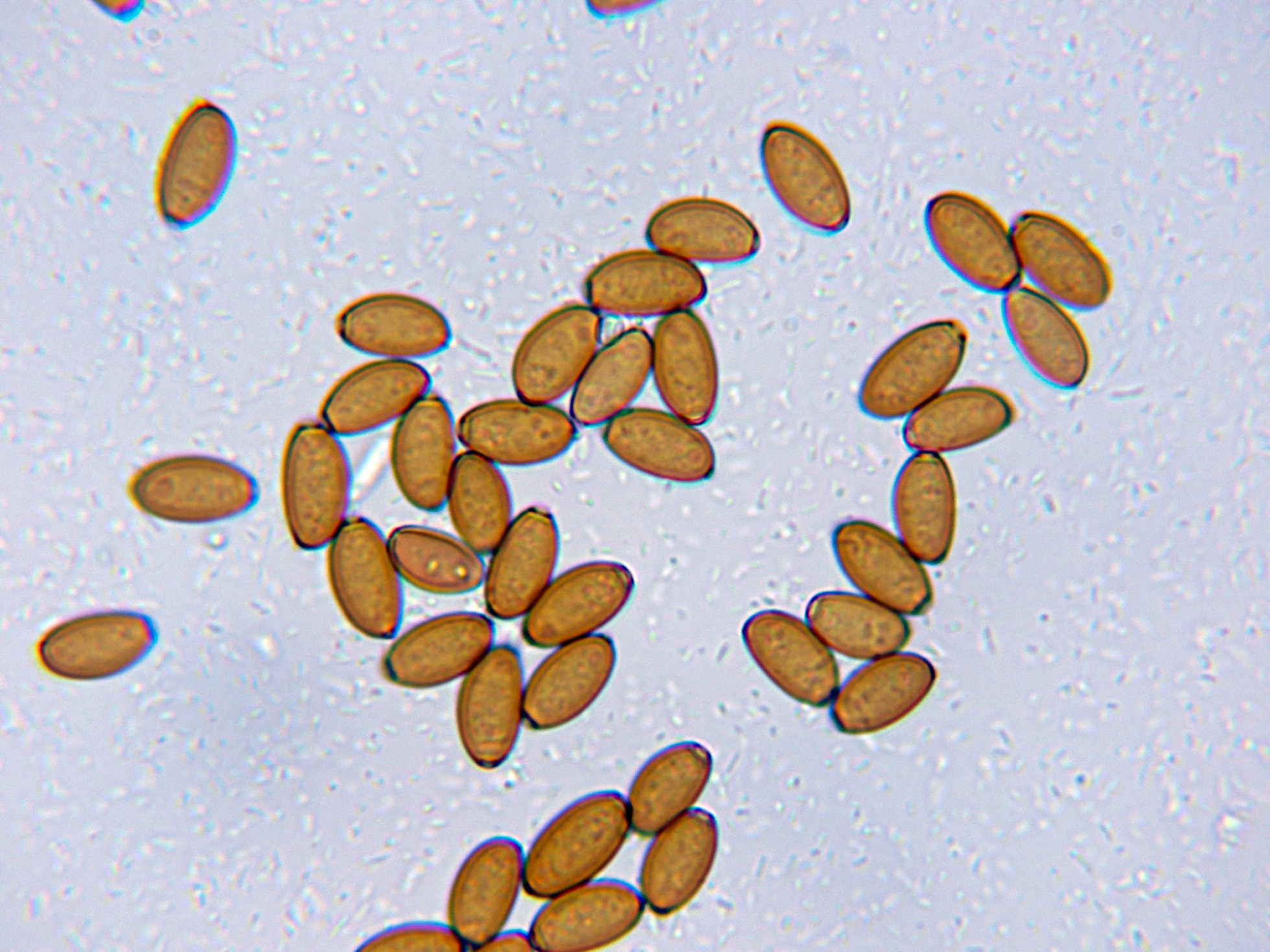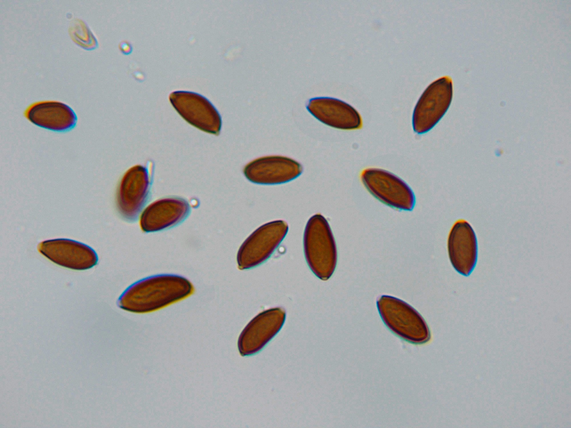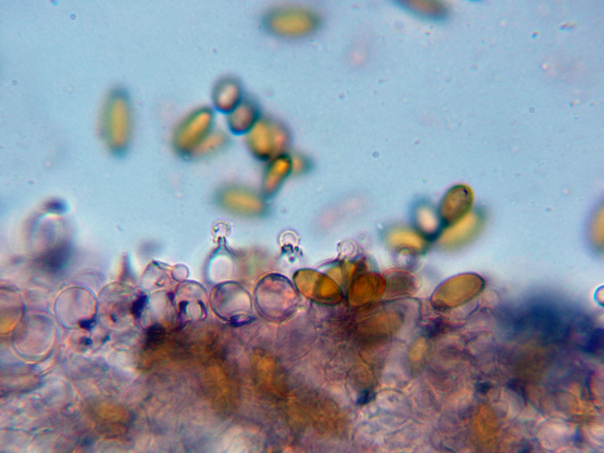 Las esporas en KOH, con fuerte reacción a marrón rojizo oscuro.