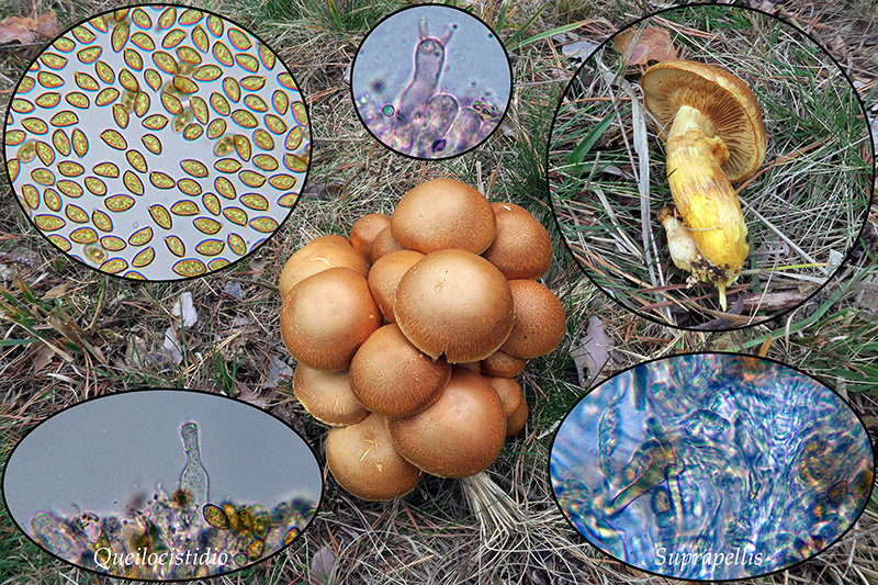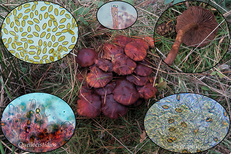 Empezamos con una que por su particular aspecto nos despistó enormemente, aunque confunde su color muy oscuro de la esporada, al minuto de empezar con la microscopía ya pude comprobar que se trataba de un grupo de Pholiota pinicola un poco pasadas