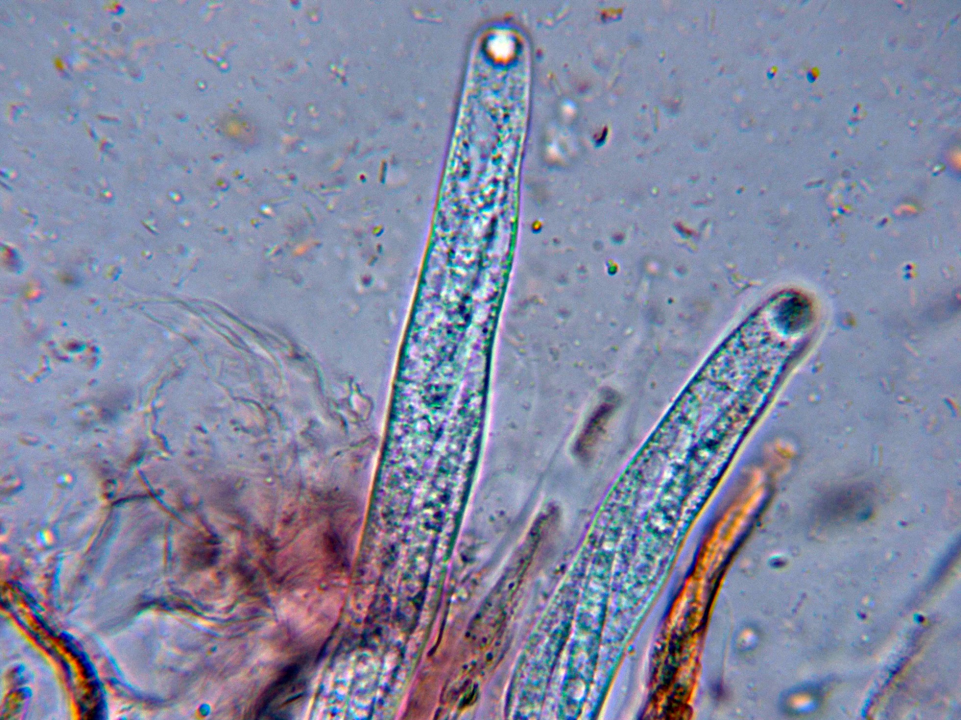 Estas esporas inmaduras con unas medidas sin contar los cilios de (46) 47.2 - 55.3 (55.9) × (4.7) 4.9 - 5.7 µm. Me = 49.8 × 5.3 µm ; Qe = 9.5