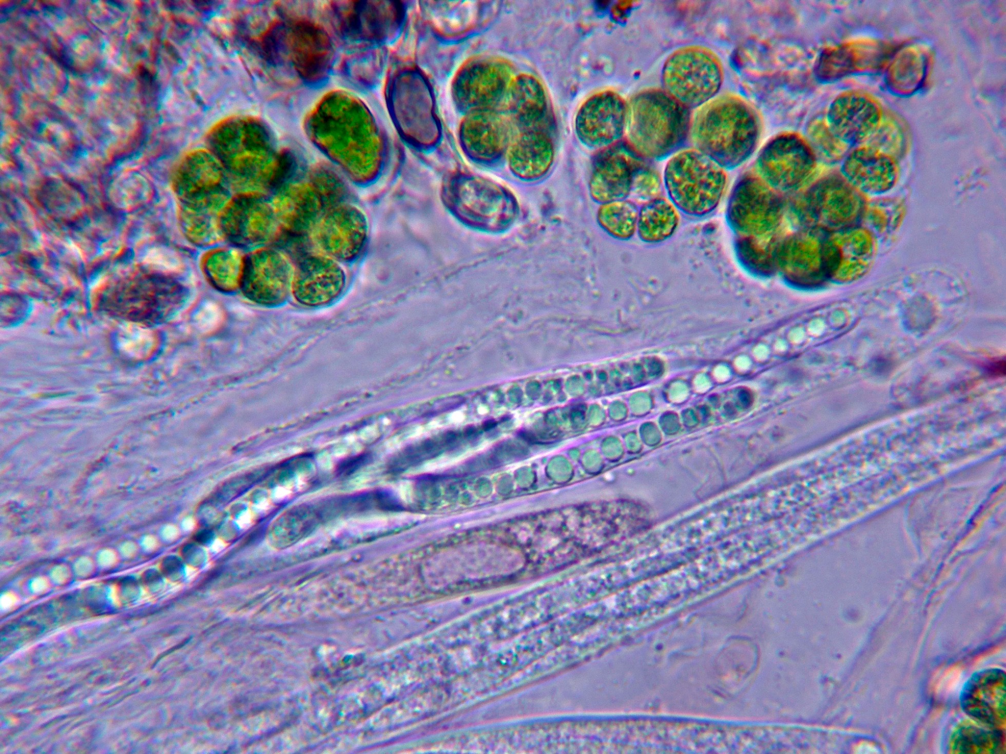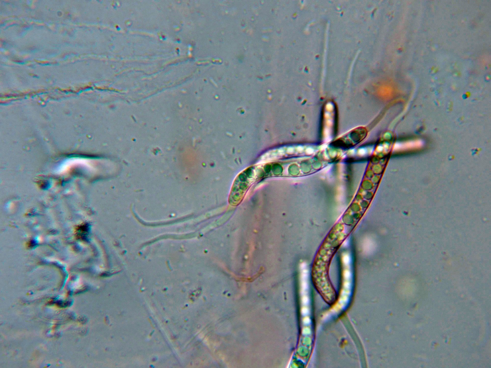Una imágen de un asco y en la parte superior unas cianobacterias embebidas en mucílago (esto me lo enseñó Baral).