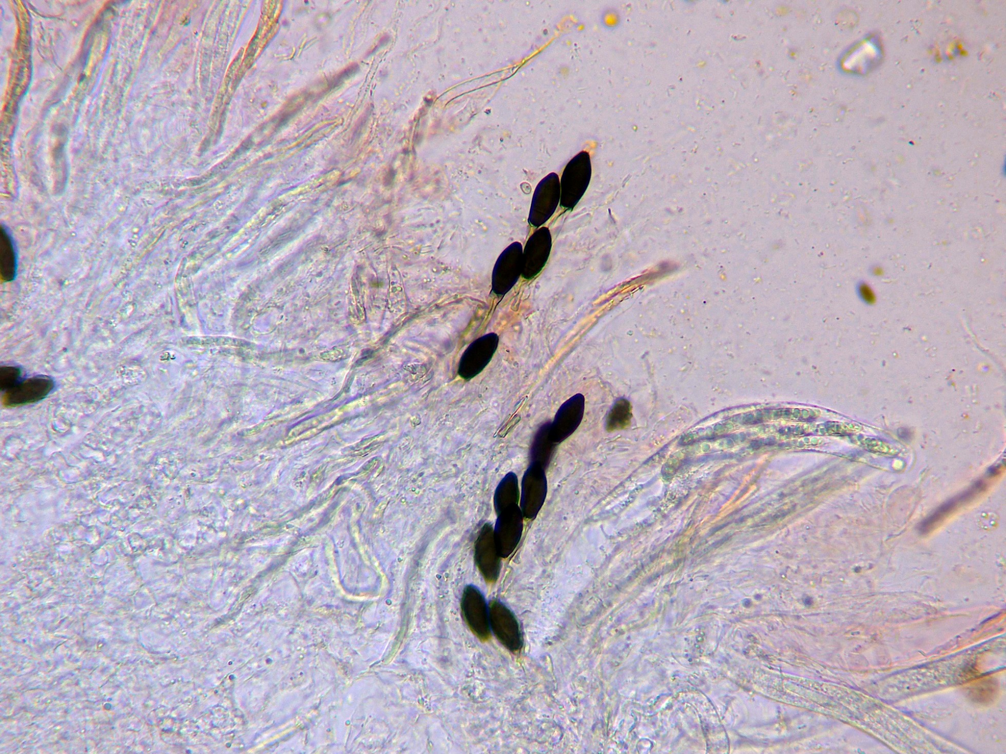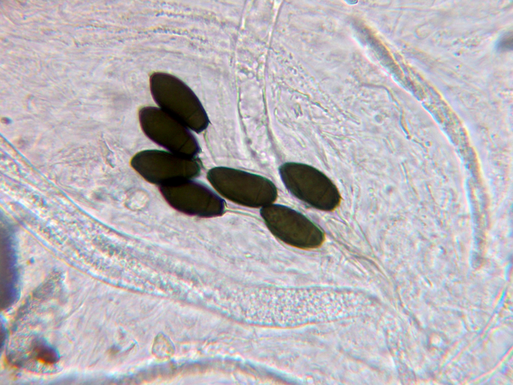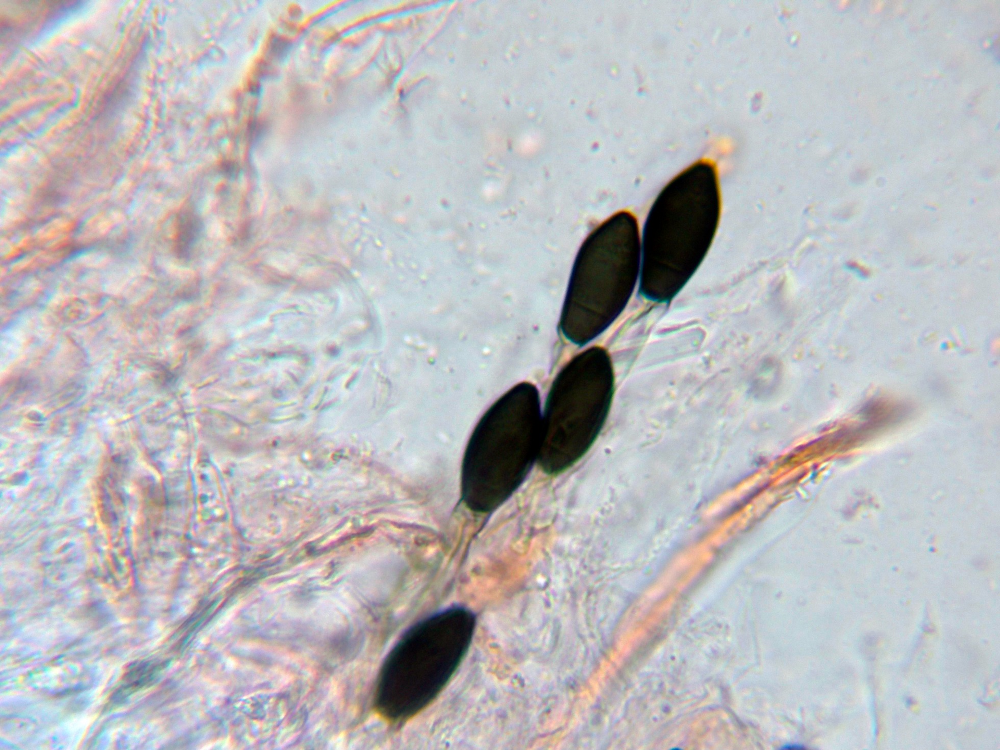Esporas maduras fuertemente pigmentadas de marrón con la base truncada donde están adheridas a un pedicelo hialino.