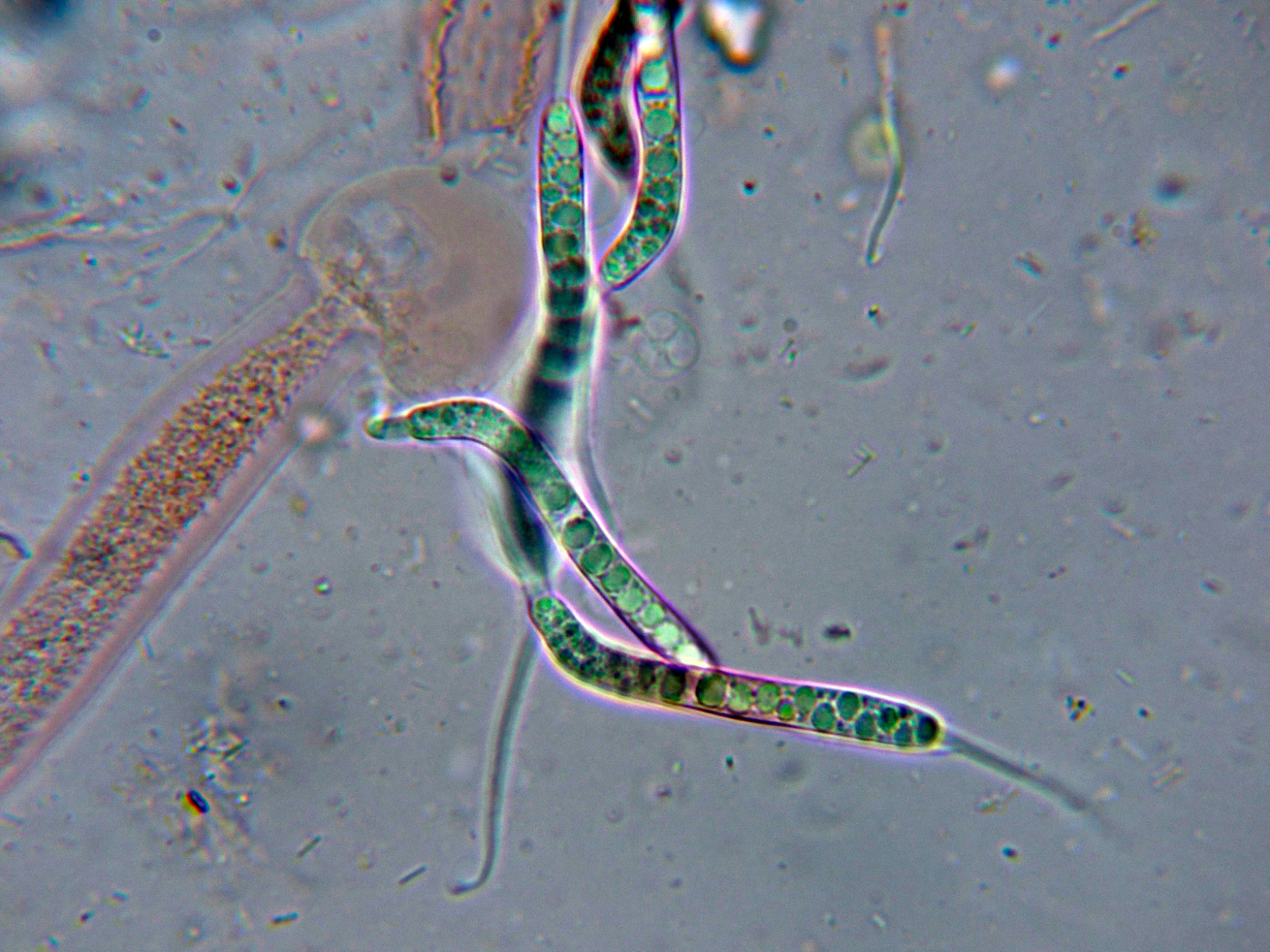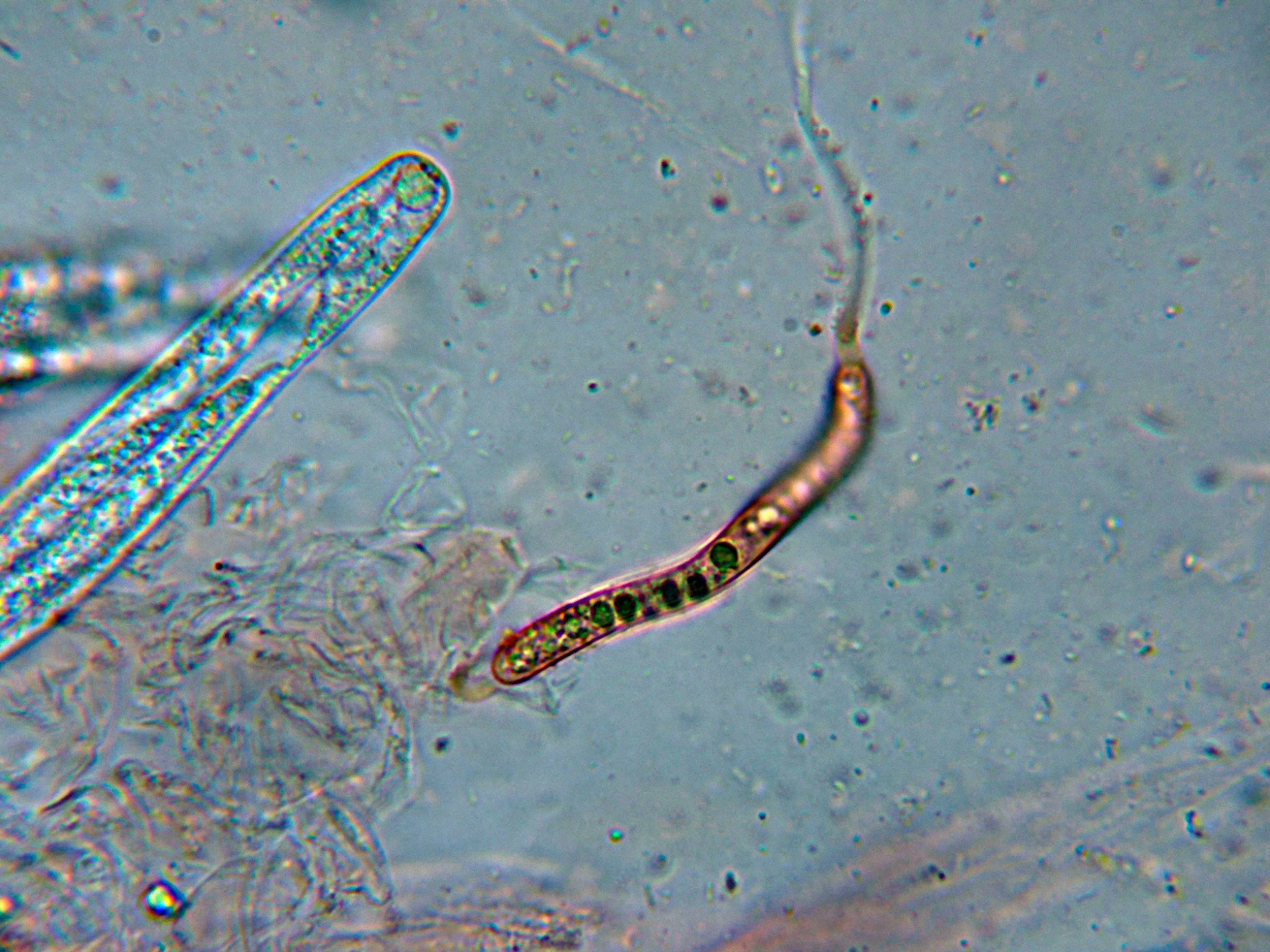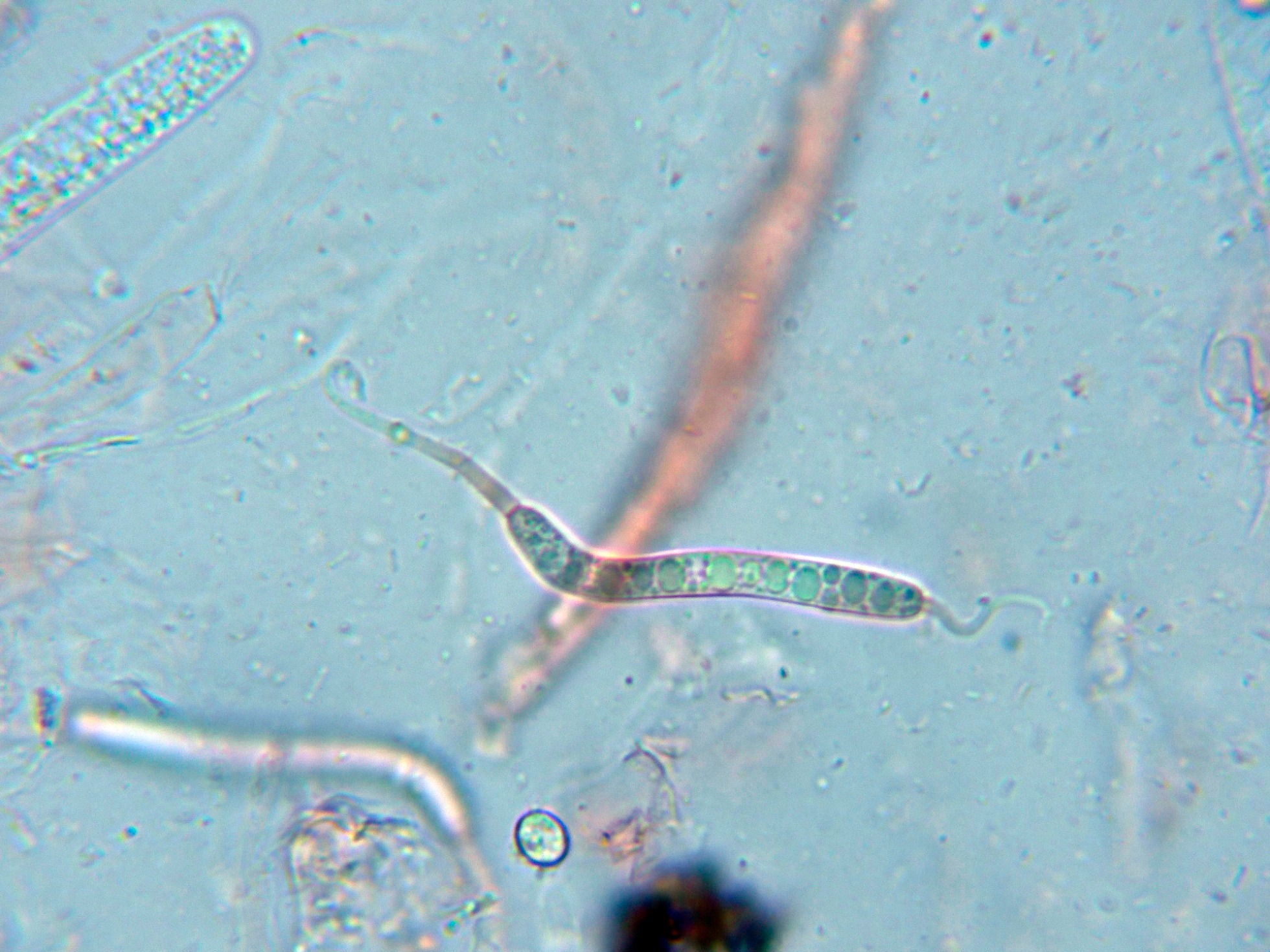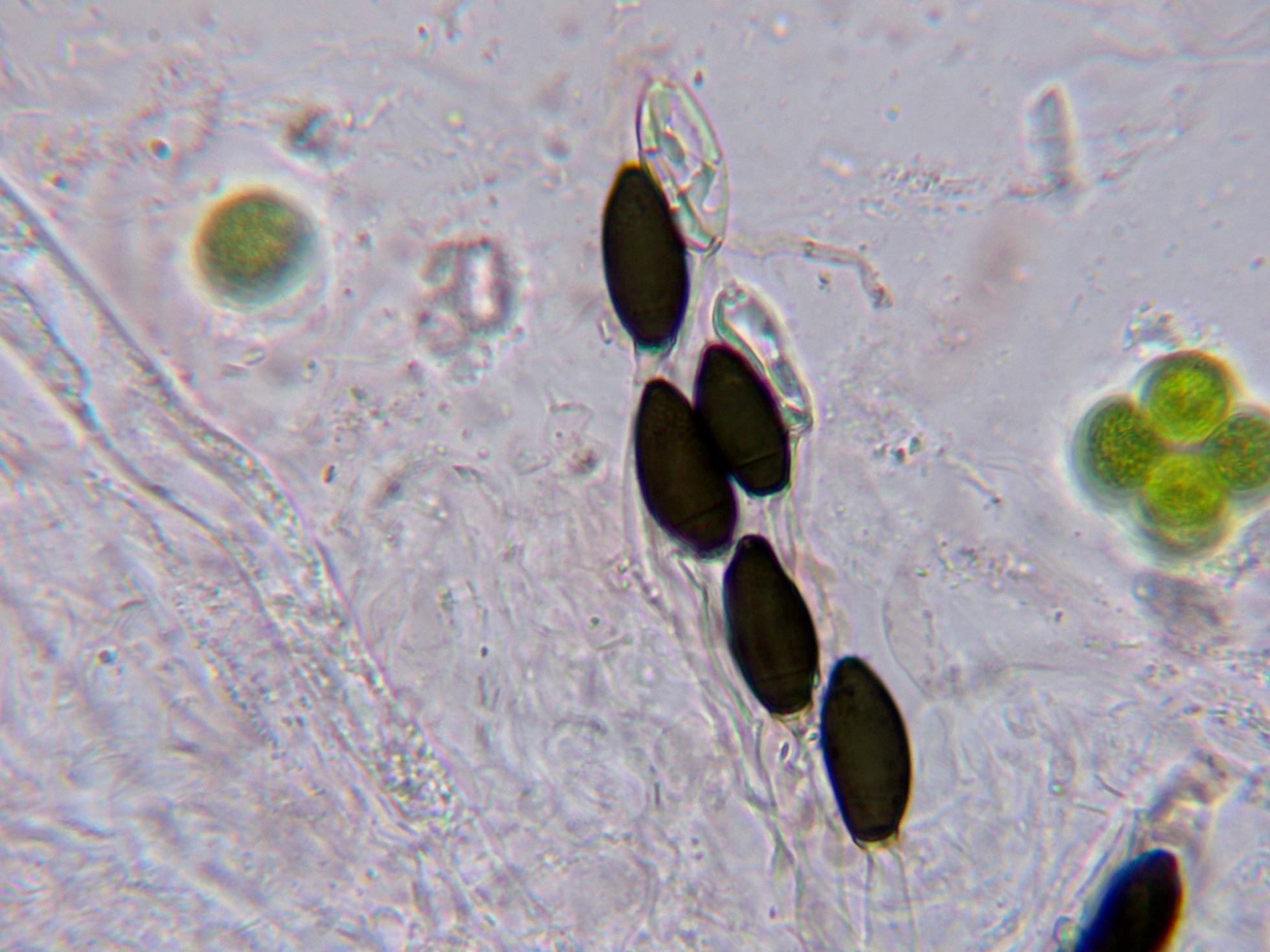Esporas maduras fuertemente pigmentadas de marrón con la base truncada donde están adheridas a un pedicelo hialino.