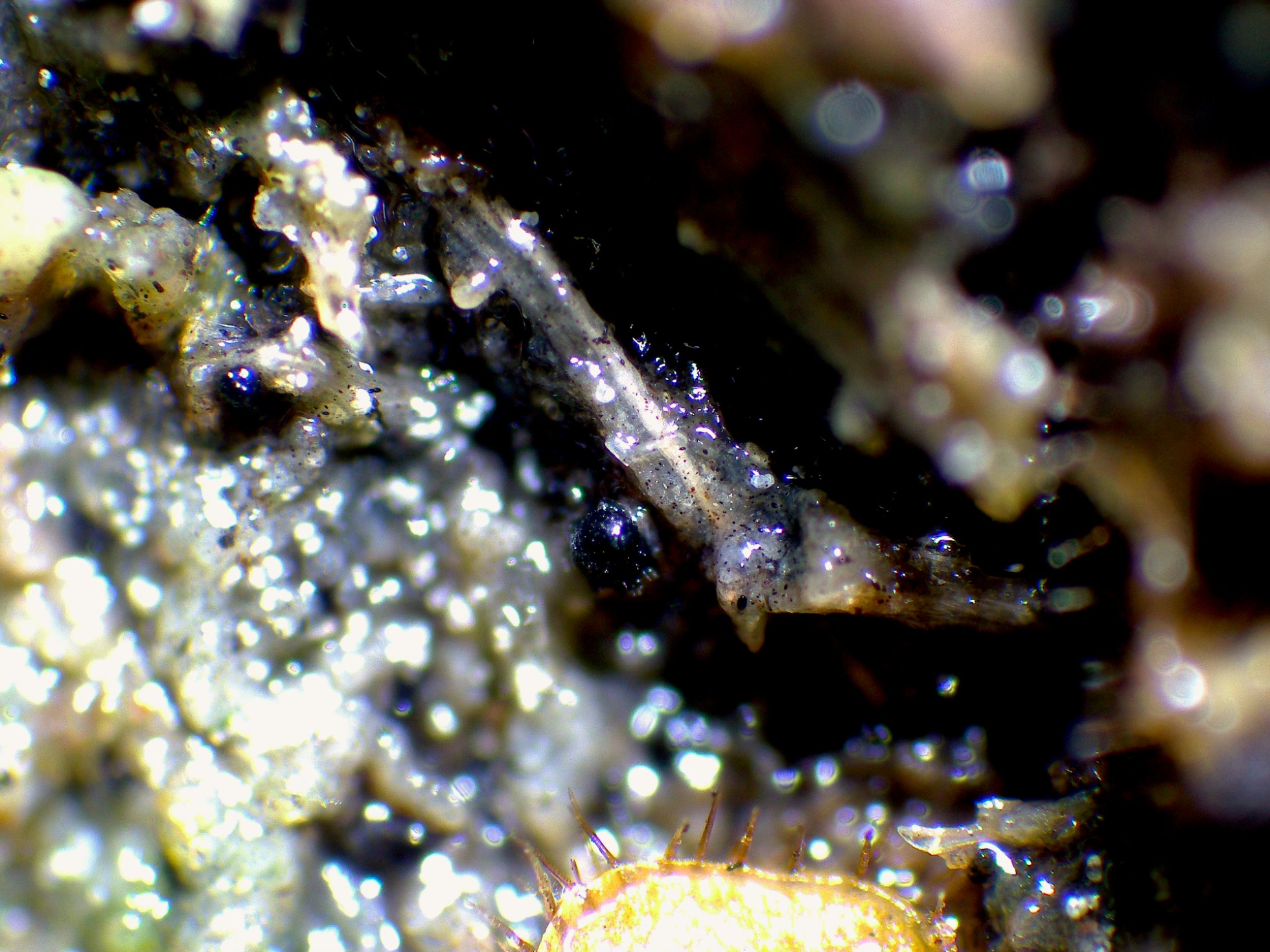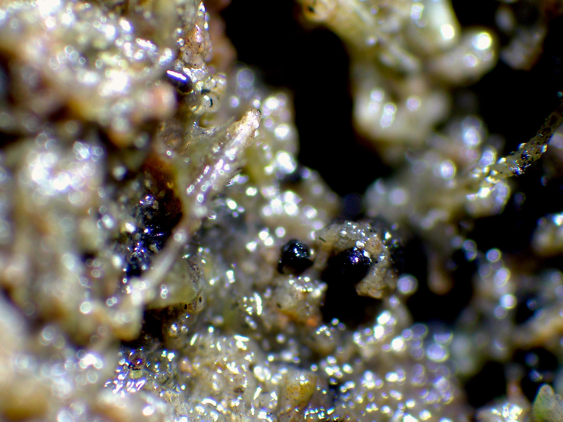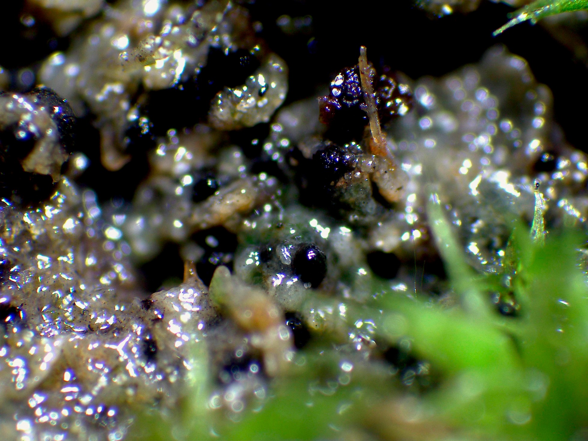 Los diminutos peritecios (de color negro) y en la parte baja de la imagen la Cheilymenia.