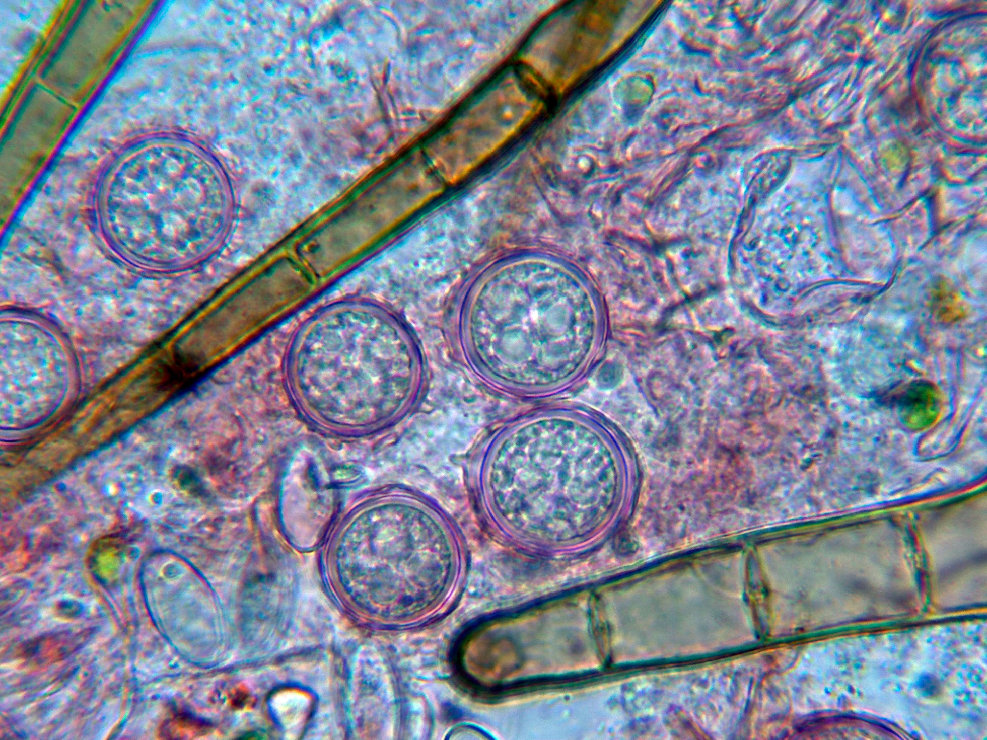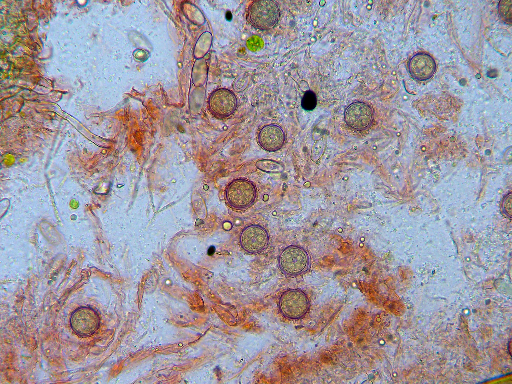 Como la morfología esporal de estas esporas me recordaba a la de algún hipogeo, y más en concreto me recordaban a esporas de Terfezia, supuse que muy probablemente la vaca habría ingerido algun hongo de estos y estaba expulsando las esporas con las heces. Al tratarse de un hipogeo no dudé en pedir consejo a mi amiga Ita Paz Conde, ella opinó que no se podía tratar de una Terfezia ya que no fructifican ahora y se inclinaba un poco más por un Pezizal ya muy cercano a Pachyphlodes spp., con lo que archivo el tema simplemente como "esporas de Pachyphlodes cf."