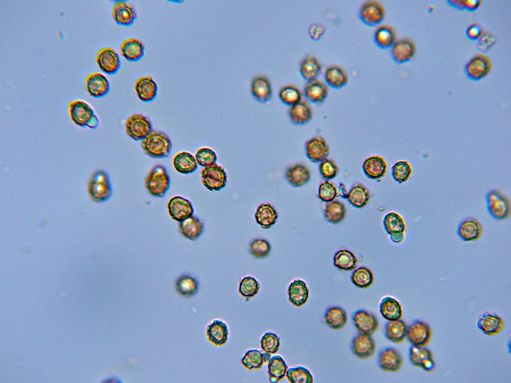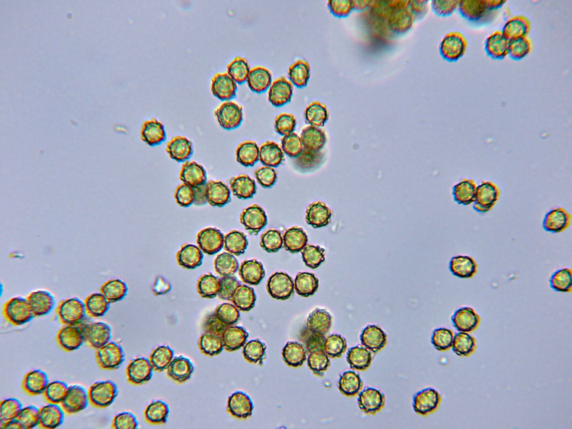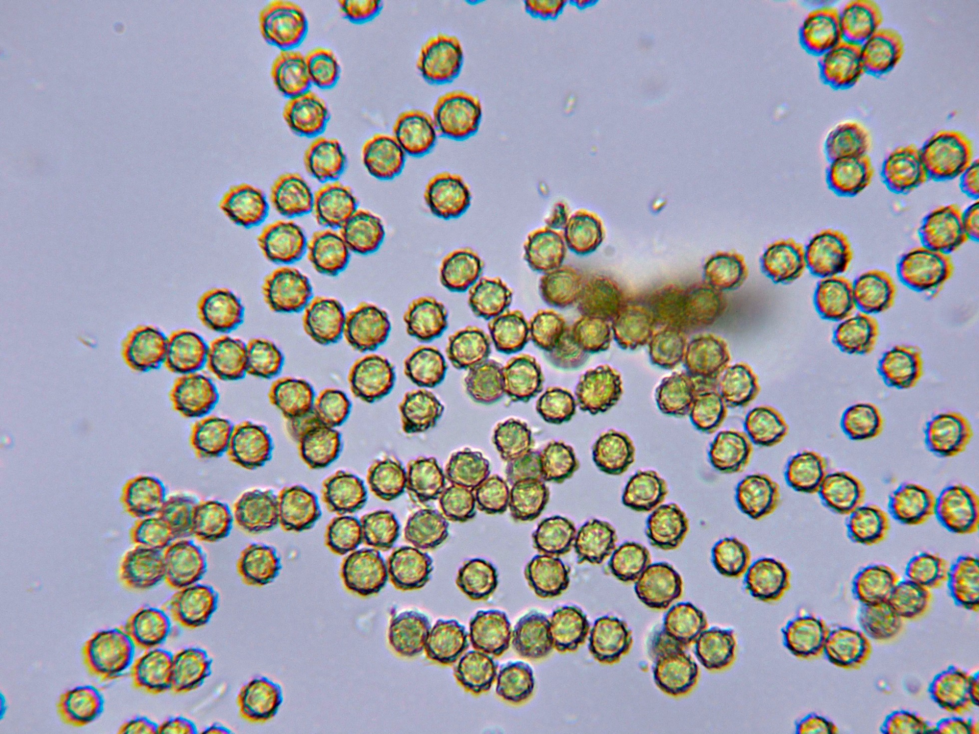 Las esporas en agua, prácticamente esféricas y ornamentadas con verrugas dispuestas regularmente por toda su superficie: