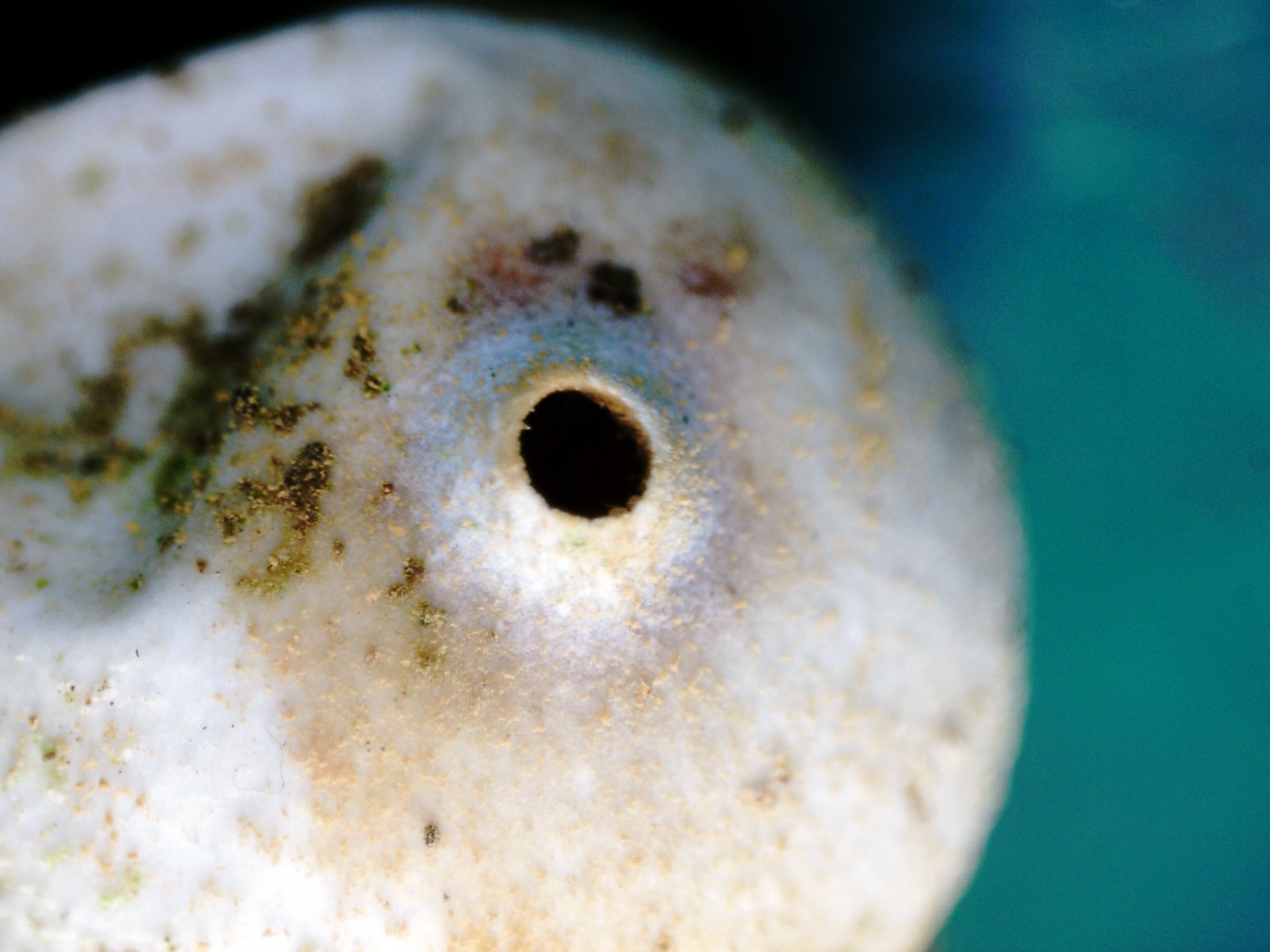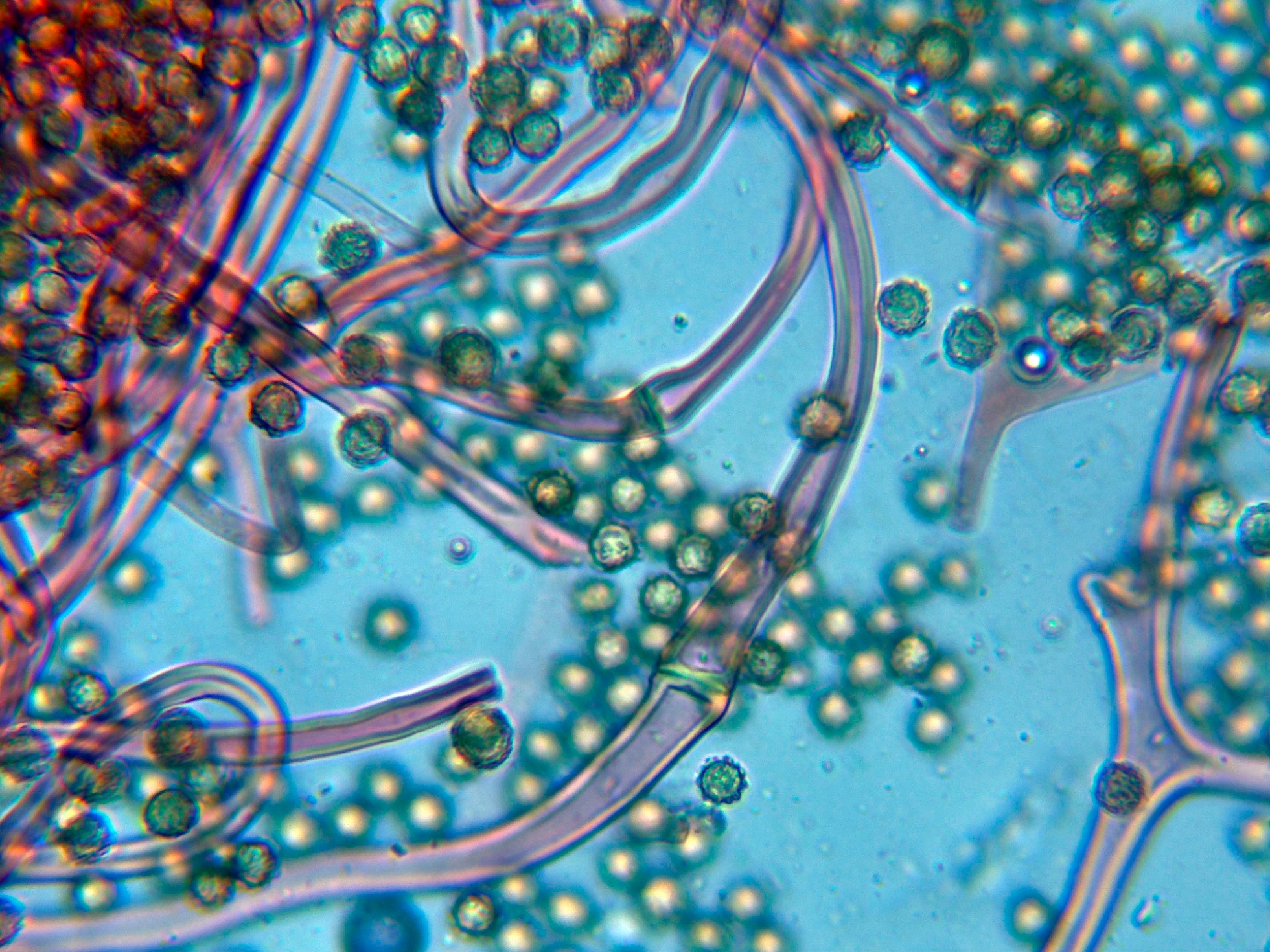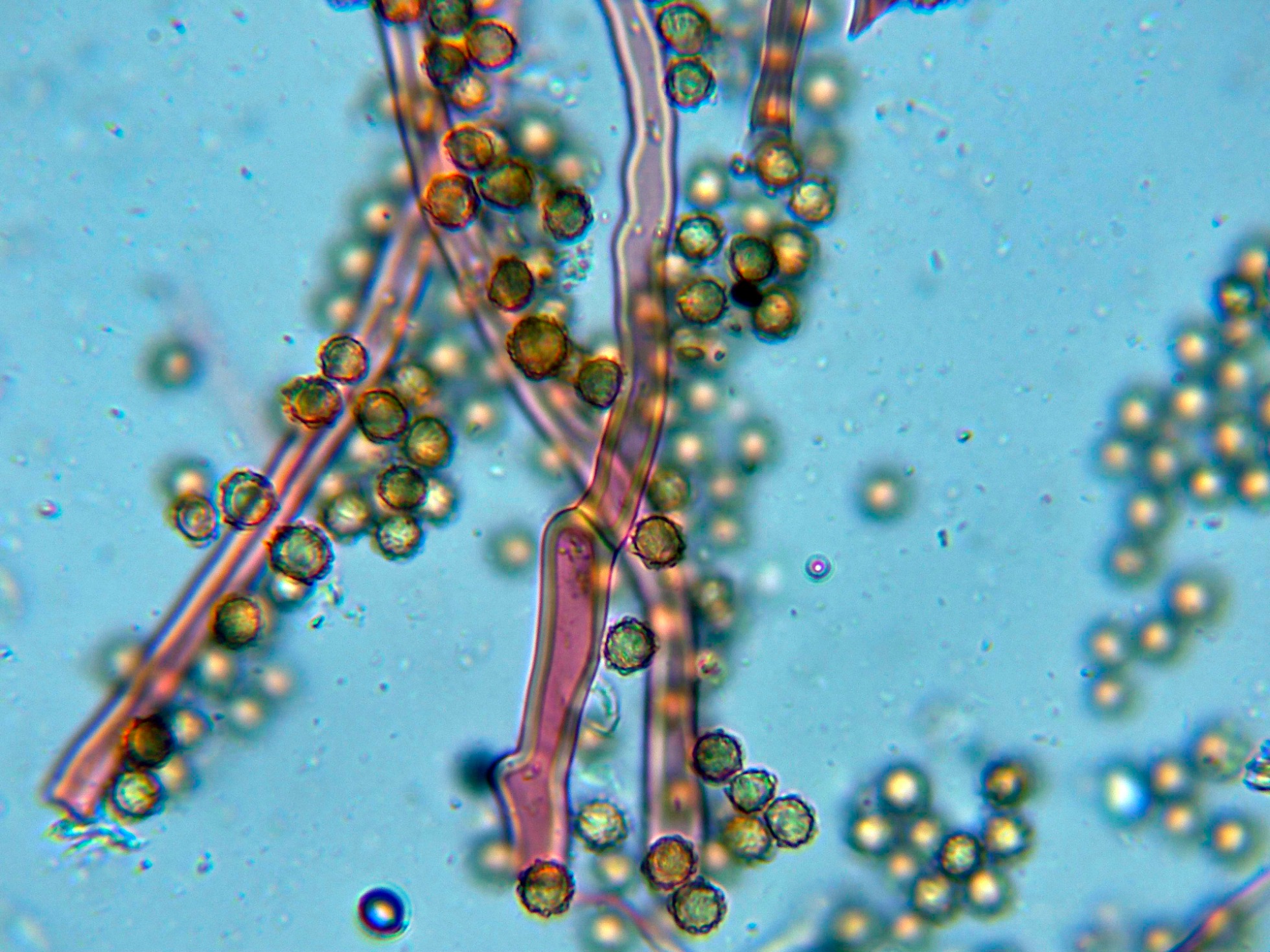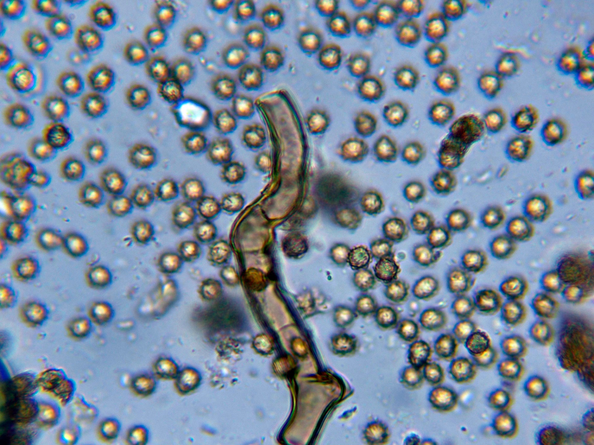 Las esporas en agua, prácticamente esféricas y ornamentadas con verrugas dispuestas regularmente por toda su superficie: