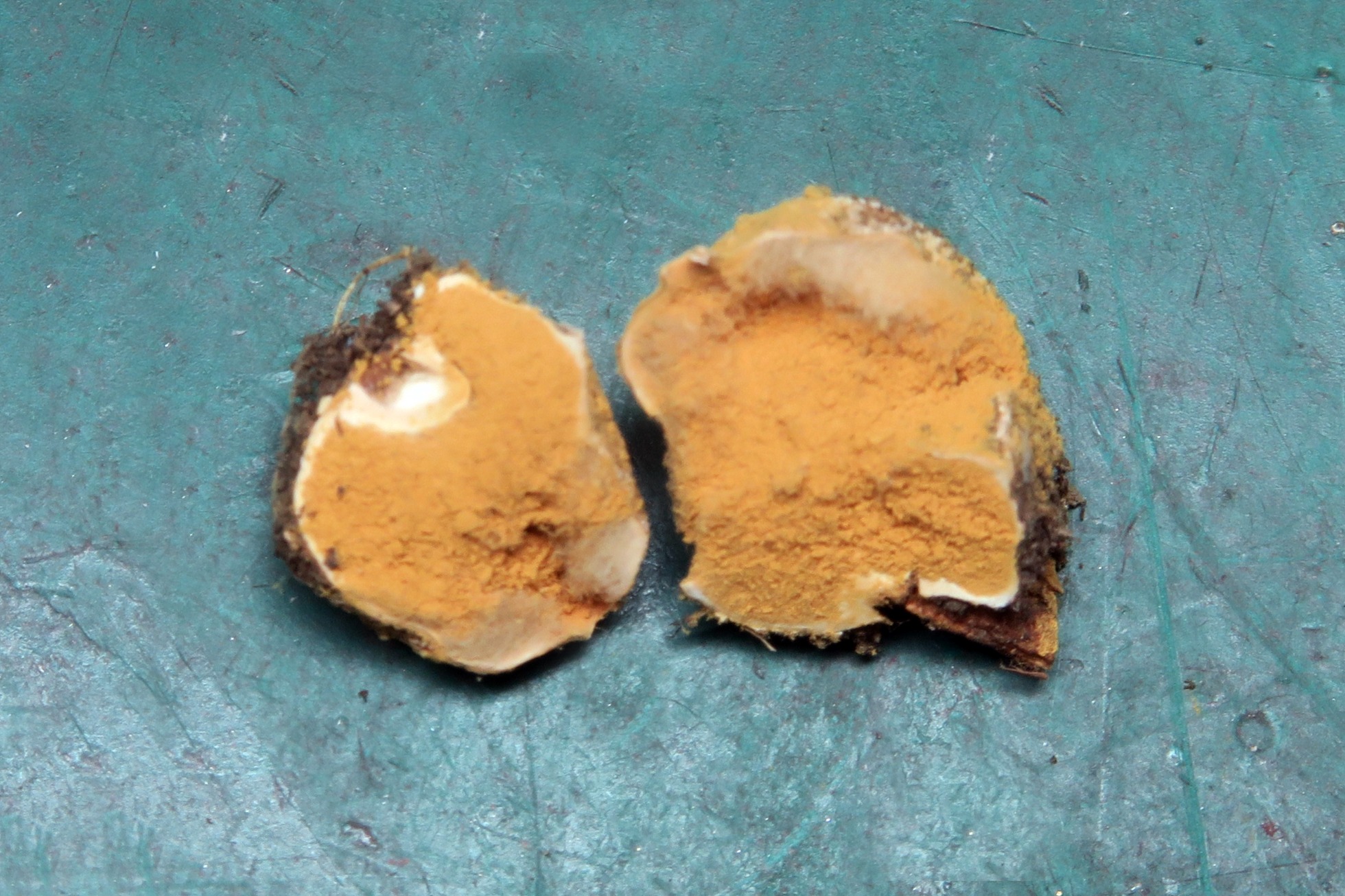 Sección de la gleba con su interior lleno de esporas de color ocráceo: