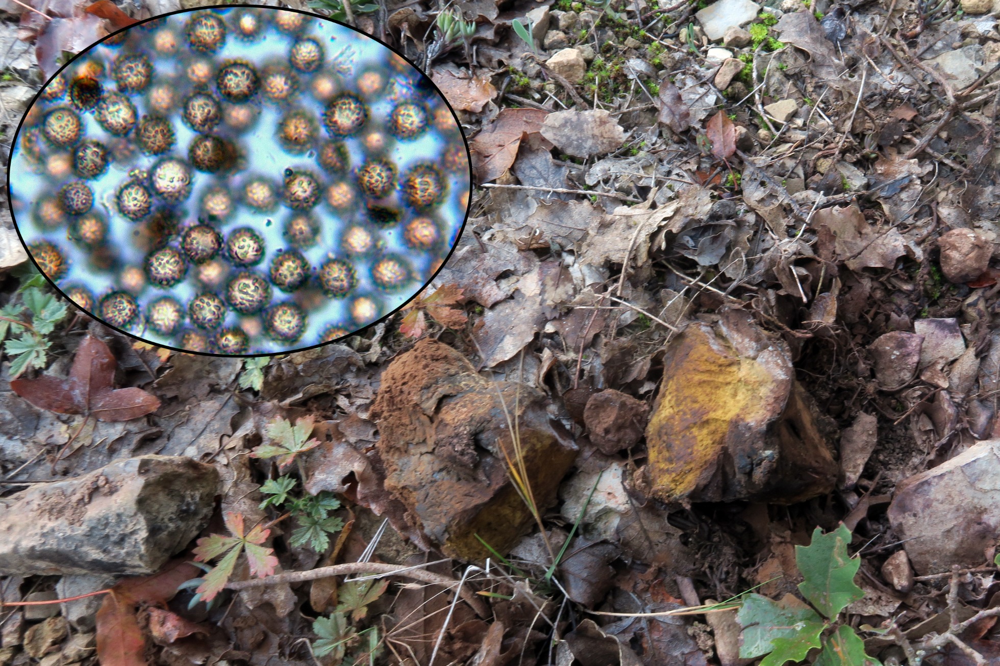 Era como un trozo de tronco podrido, que al tocarlo con el pie al quebrarse soltó un polvillo de esporas y al ver la sección amarillenta, me llevé una muestra, la micro del colapso de esporas parece confirmar el Pisolithus arhizus, eso si en un estado de lo más lamentable , para nada presentable.