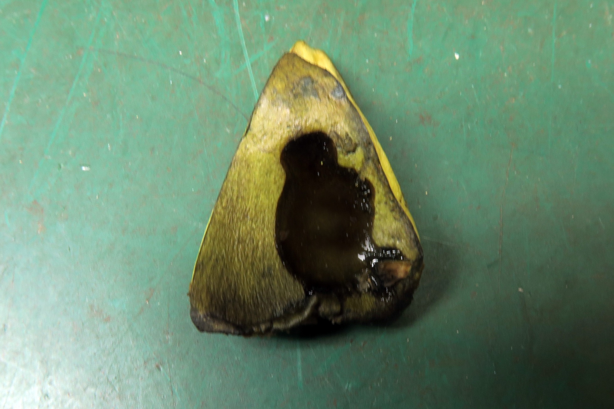 Carne al corte de color amarillo verdoso, más acusado en su base: