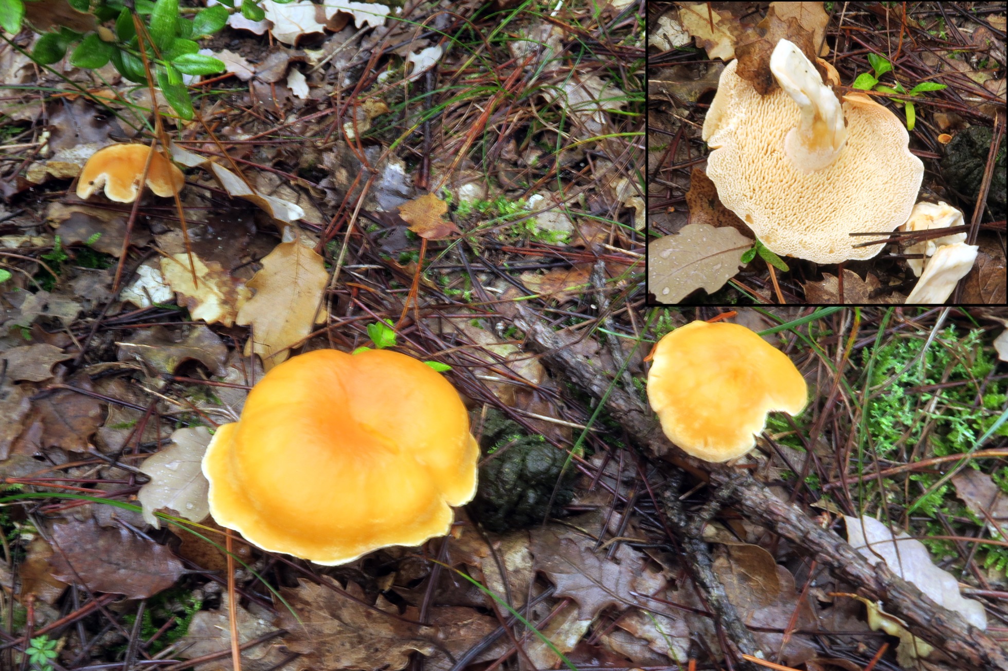 A poca distancia del anterior y también con el sombrero anaranjado el abundante y amargo Gymnopilus penetrans.
