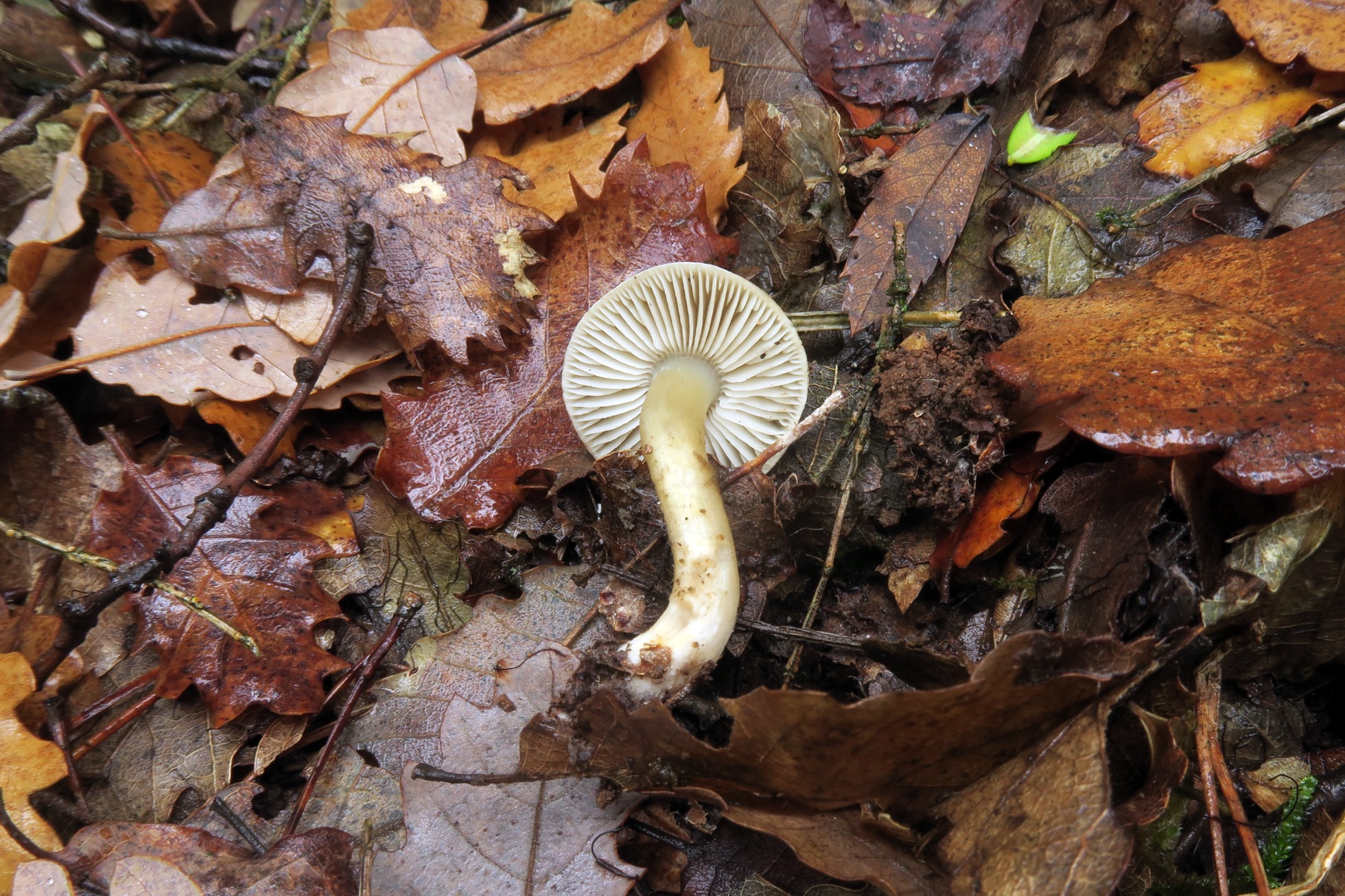 Aunque su aspecto nos puede despistar, su olor a jabón y sus láminas libres ligeramente escotadas nos conducen al Tricholoma saponaceum sl.