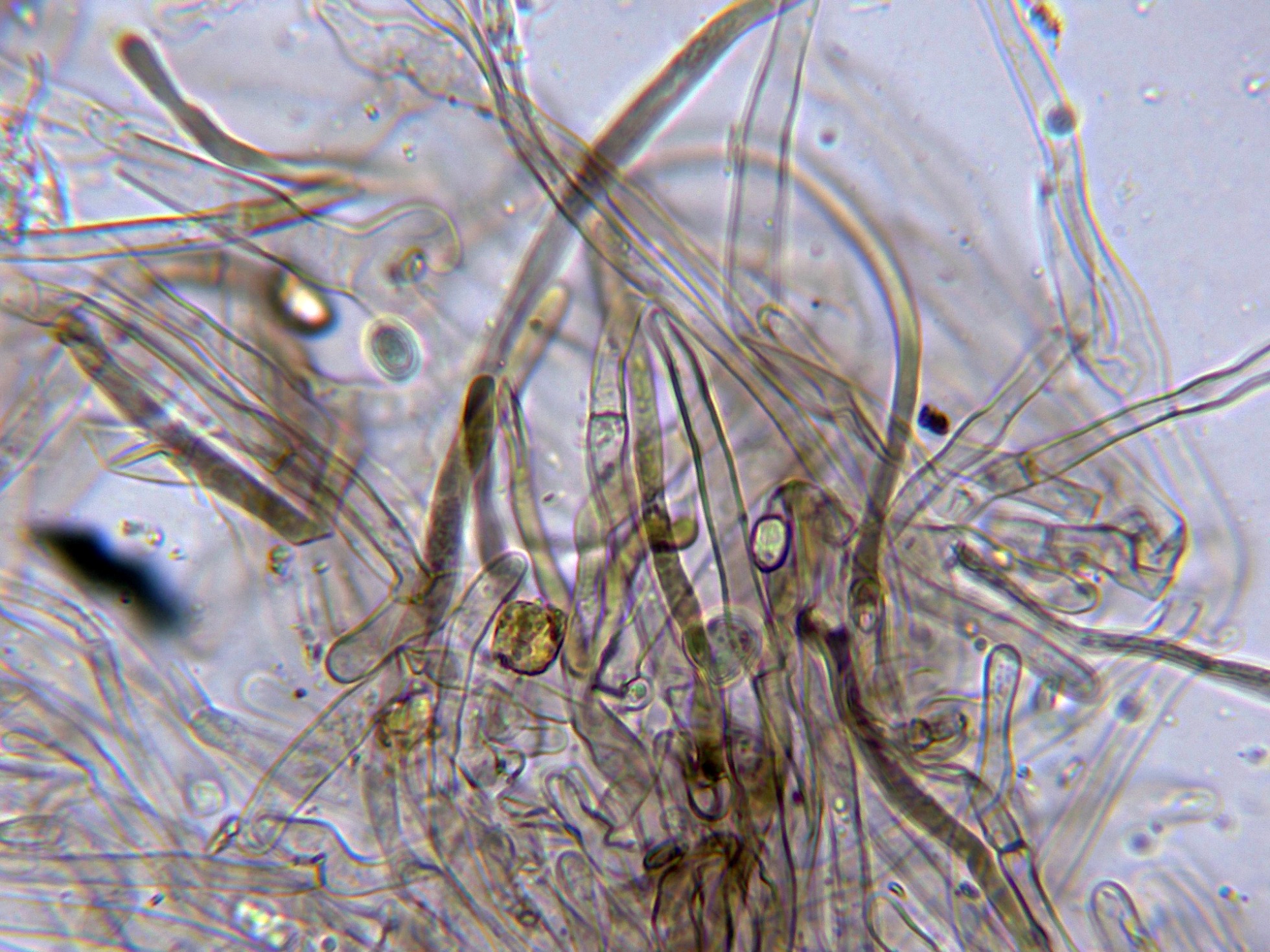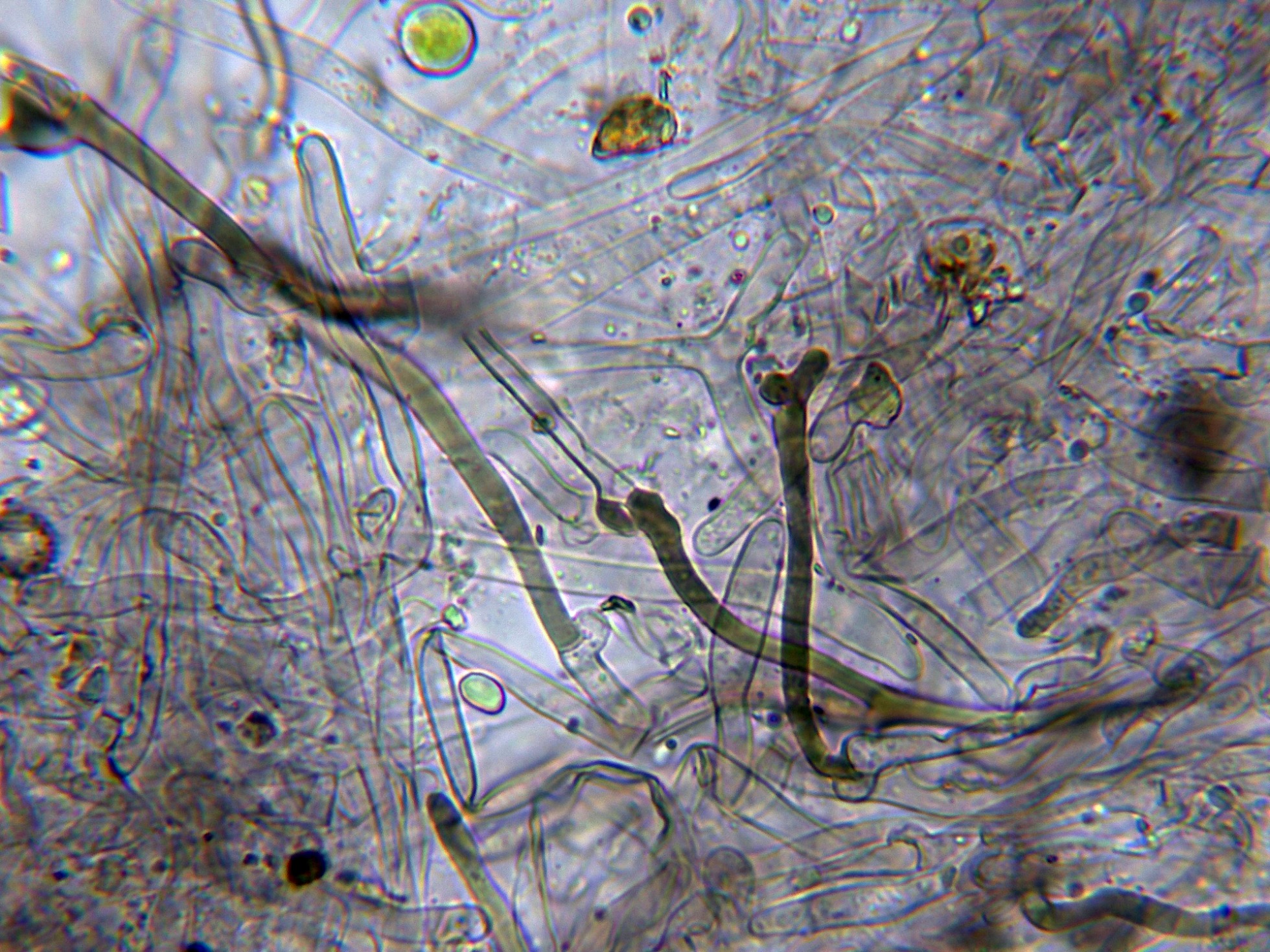 Hifas de la suprapellis, algunas de ellas fuertemente pigmentadas y provistas de fíbulas.