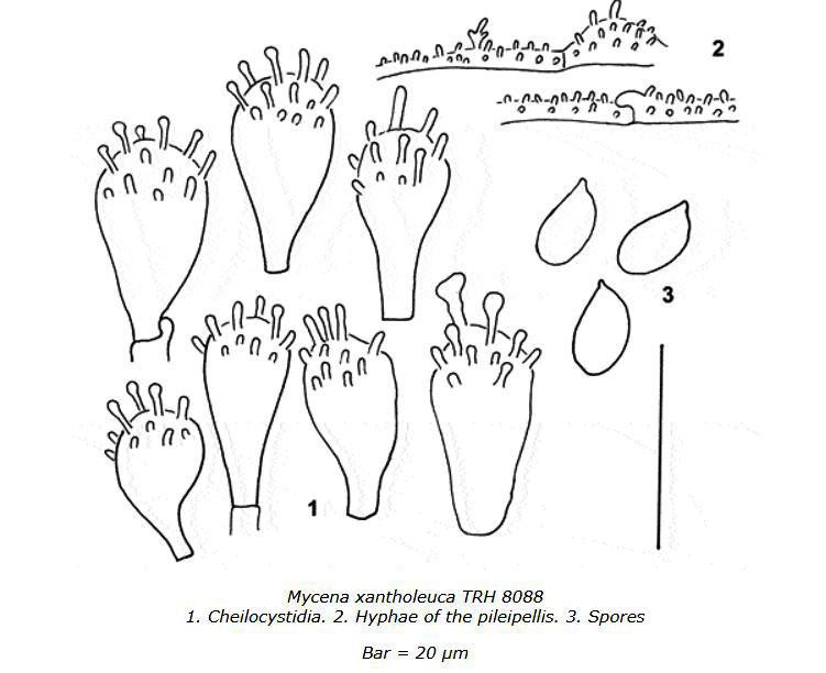 La Mycena xantholeuca se caracterizaría por su sombrero y pie blanco amarillentos, sus esporas amiloides, la ausencia de pleurocistidios y la morfología de sus queilocistidios con excrecencias ligeramente capitadas.