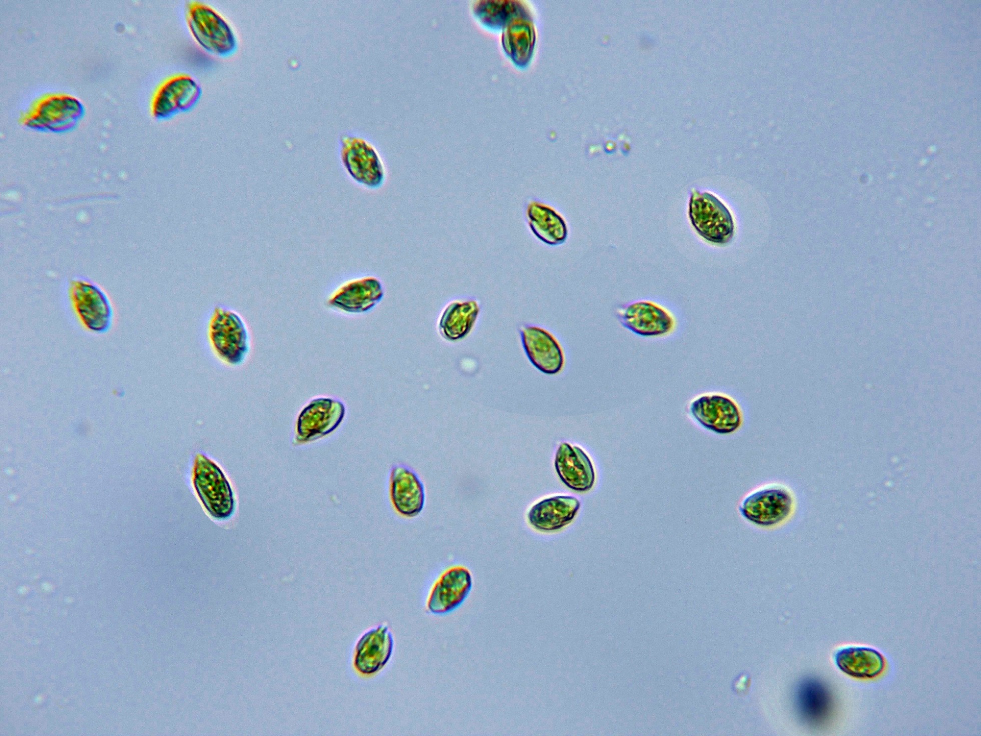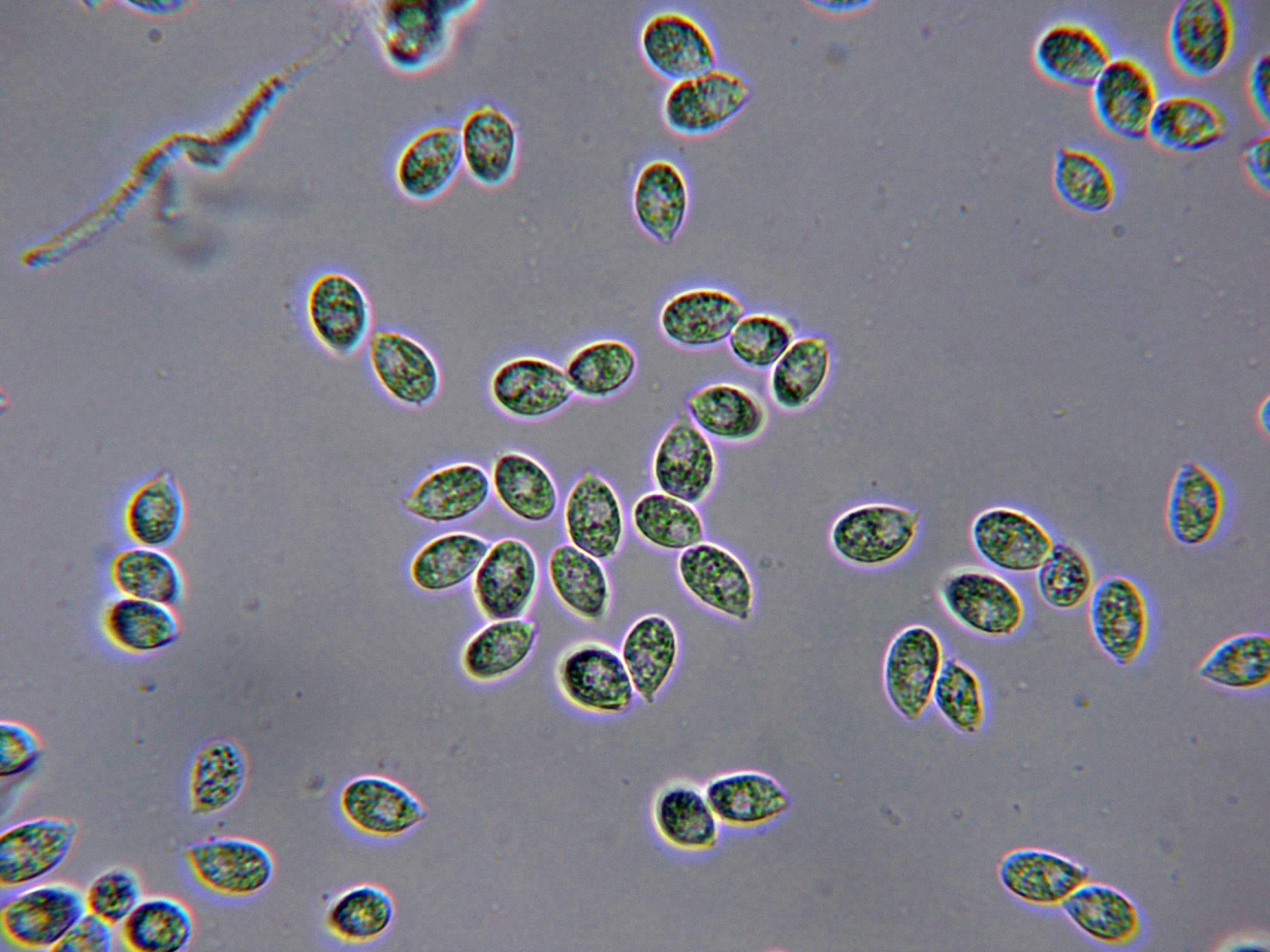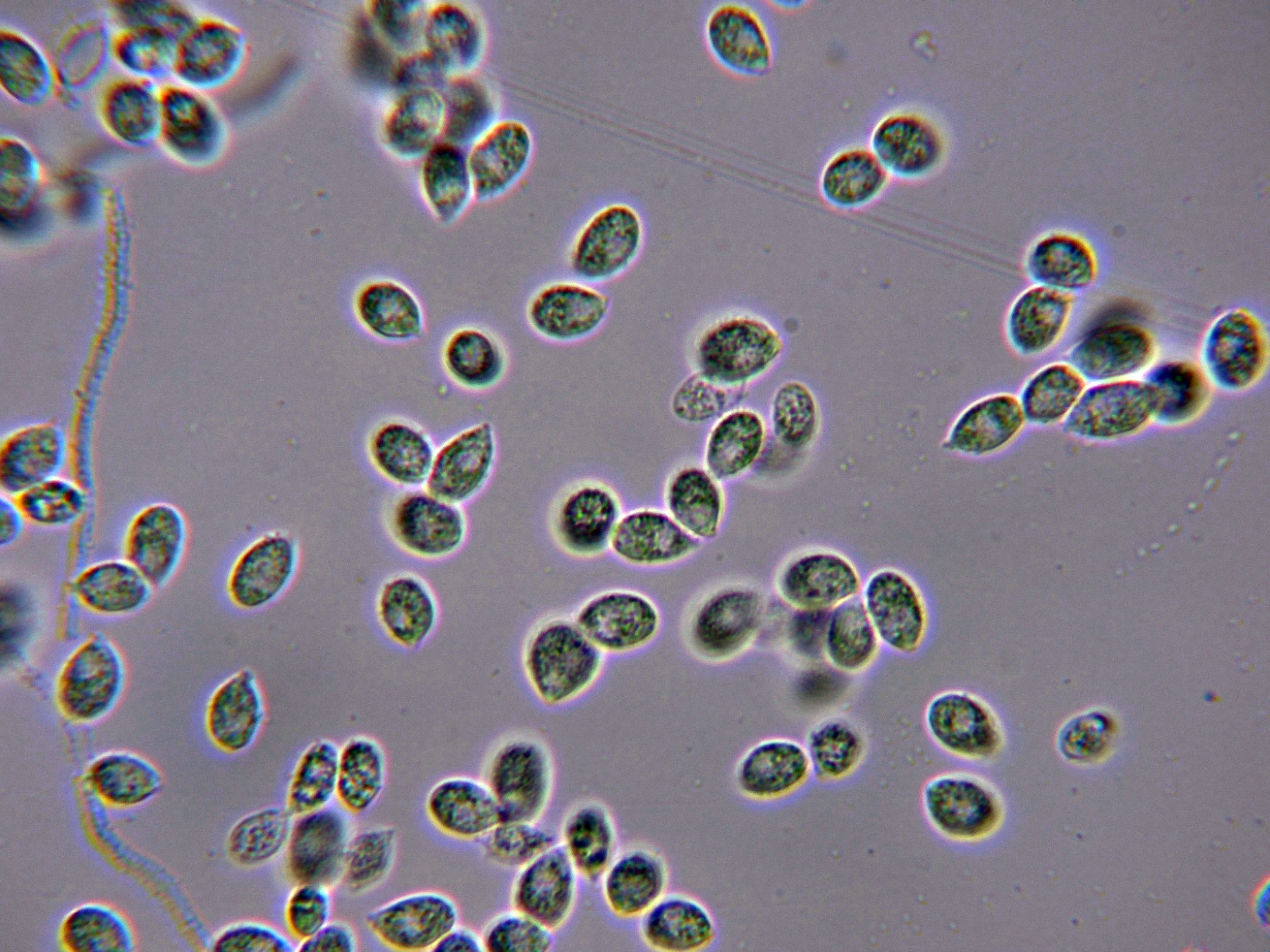 Esporas entre elipsoides y amigdaliformes, con forma de semilla, de pared fina con tenue contenido granuloso en su interior.