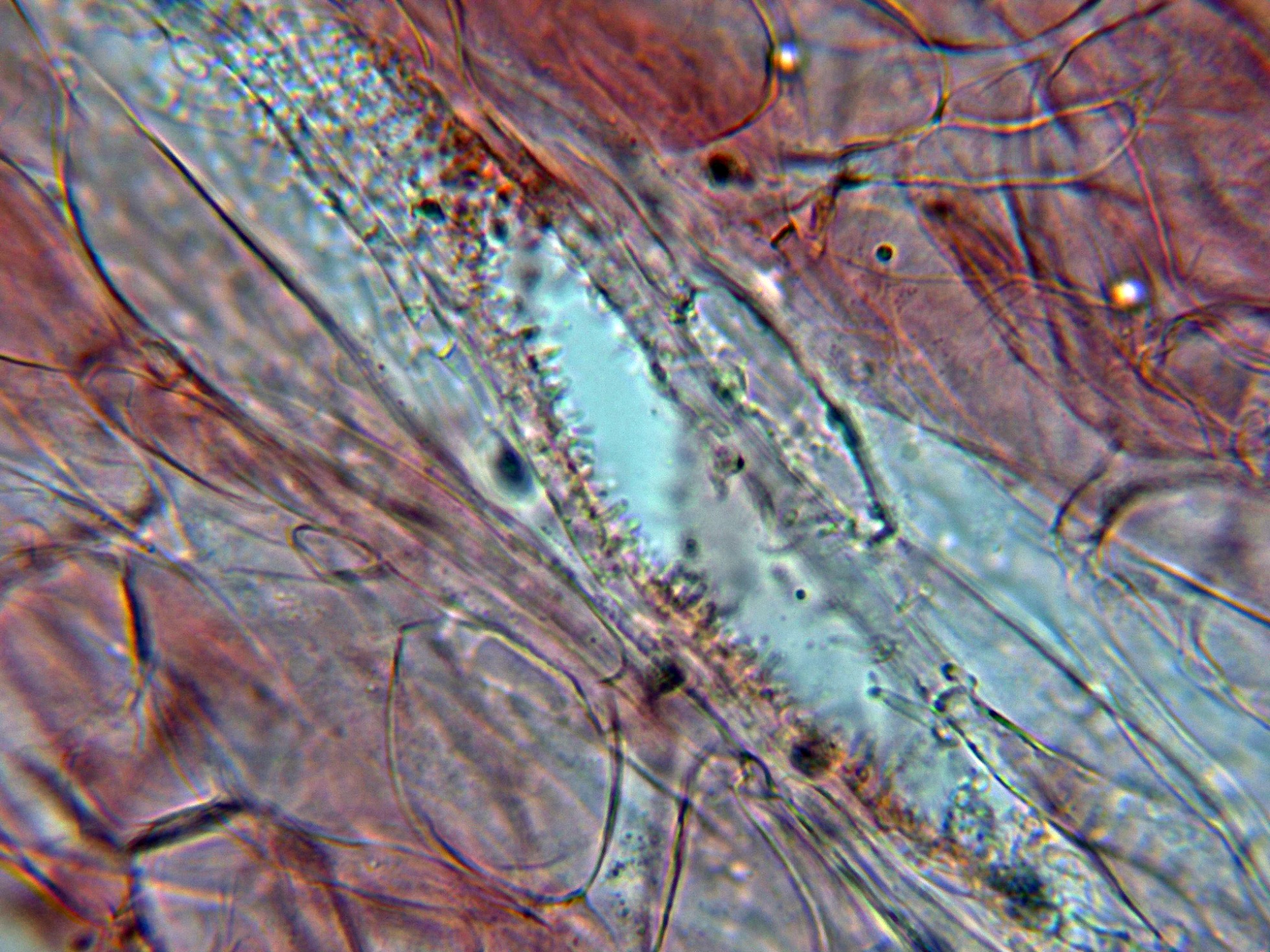 Hifas de la capa cortical del estípite asimismo con excrecencias cortas.