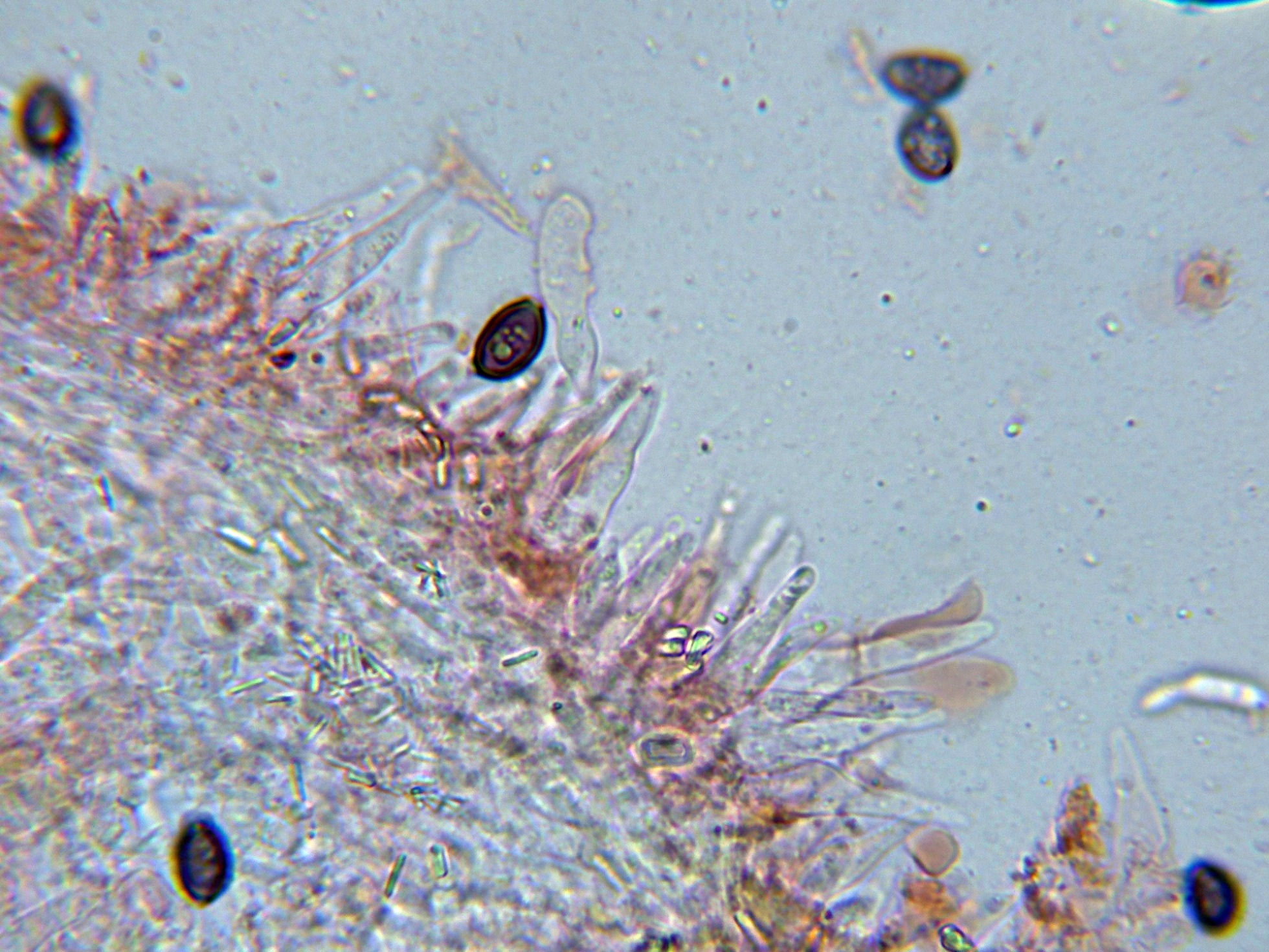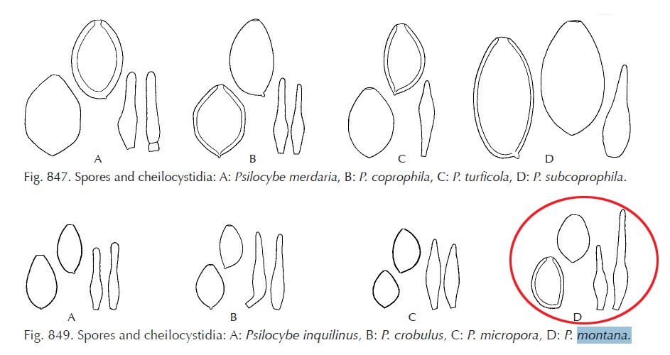 Observaciones: Determinación hecha siguiendo las claves de Funga Nordica en la que se indican para la Psilocybe montana unas medidas esporales de 7-9 x 5-6 x 4.5-6 μm, añado una captura de imágen con la morfología de las esporas y los queilocistidios.