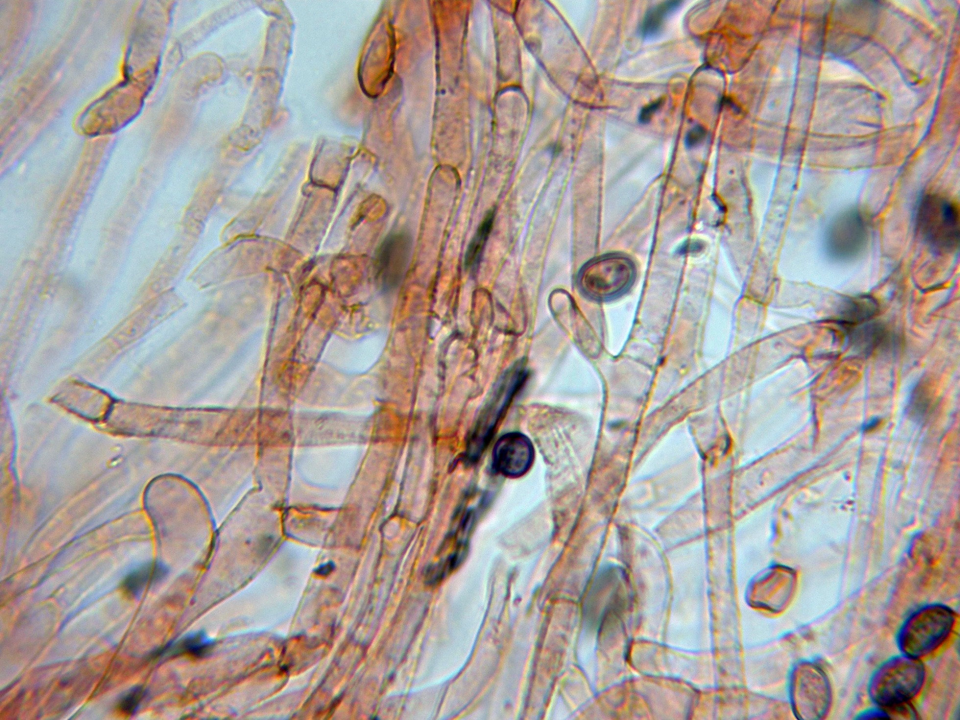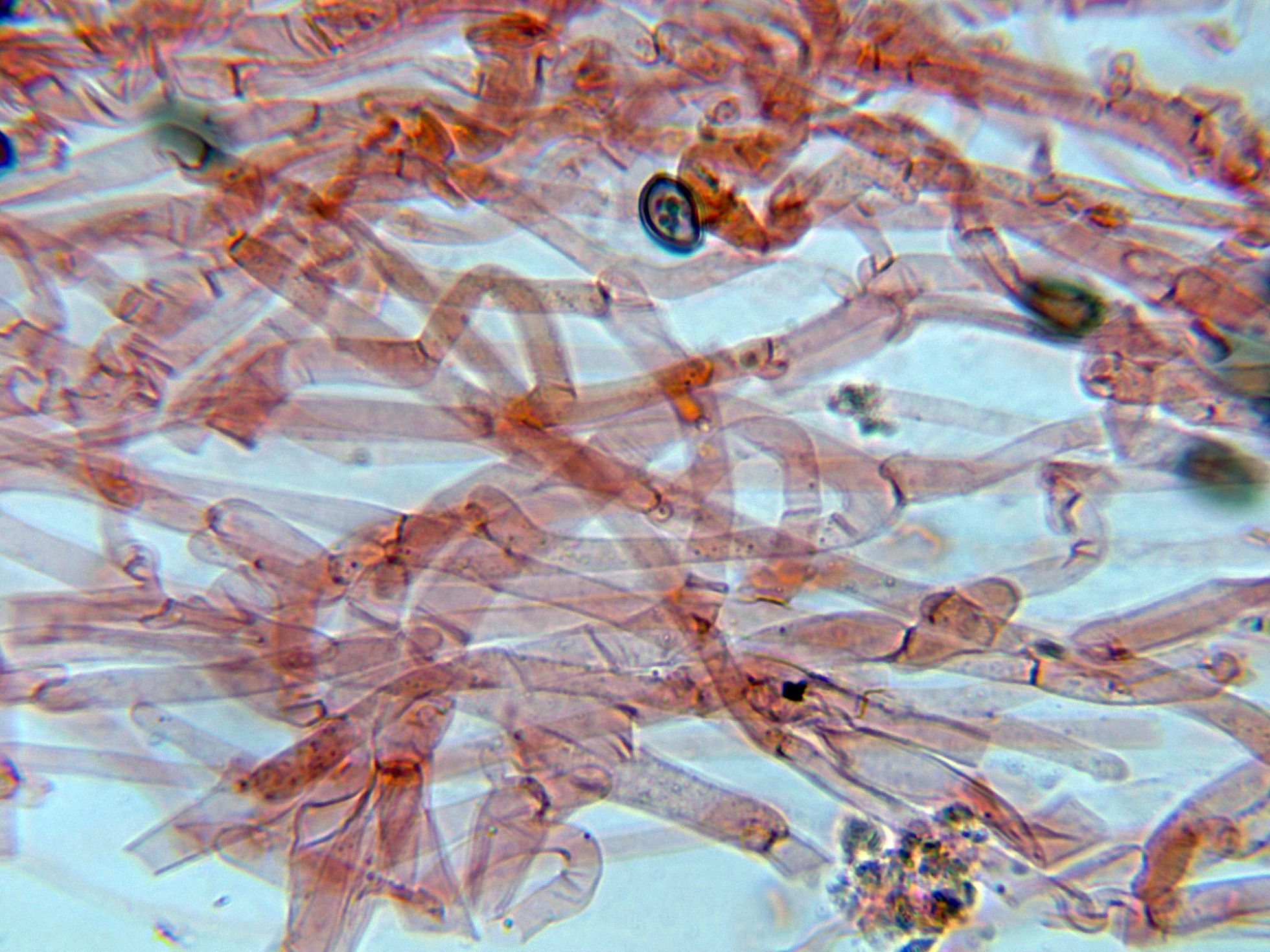 Pileipellis filamentosa, con las hifas superficiales separadas por gelificación y provistas de fíbulas:
