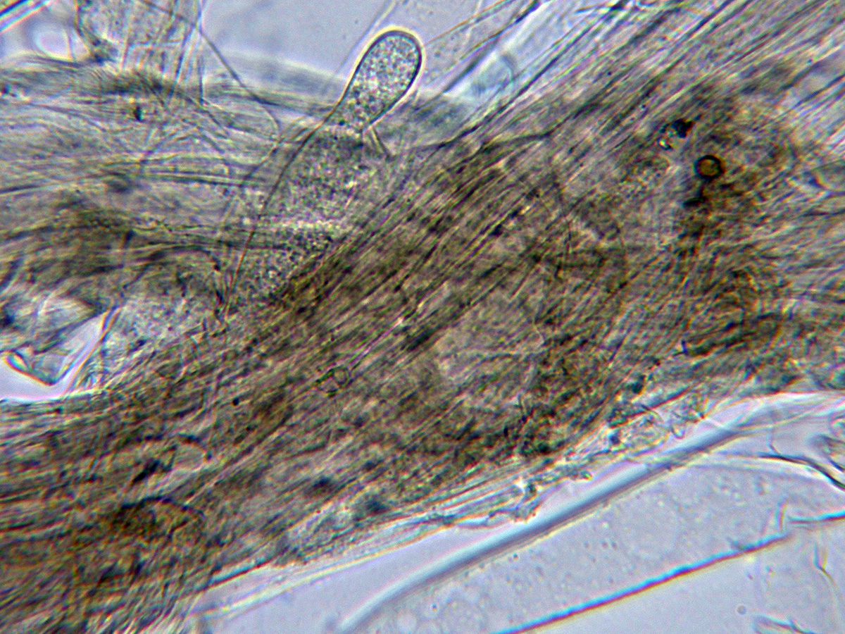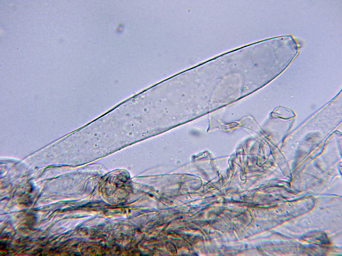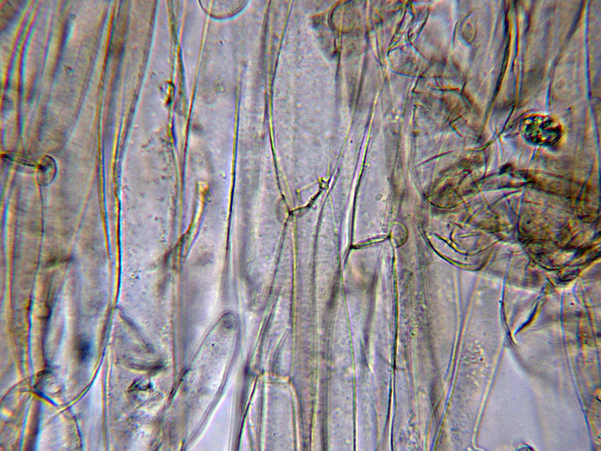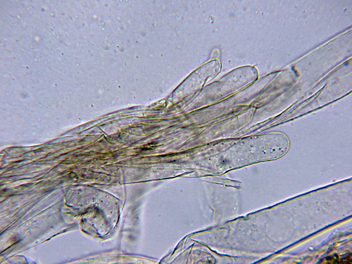 Pileipellis con hifas filamentosas dispuestas mas o menos paralelamente con los tabiques provistos de fíbulas y algunas hifas terminales anchas, cilíndricas e hialinas a modo de pelos.