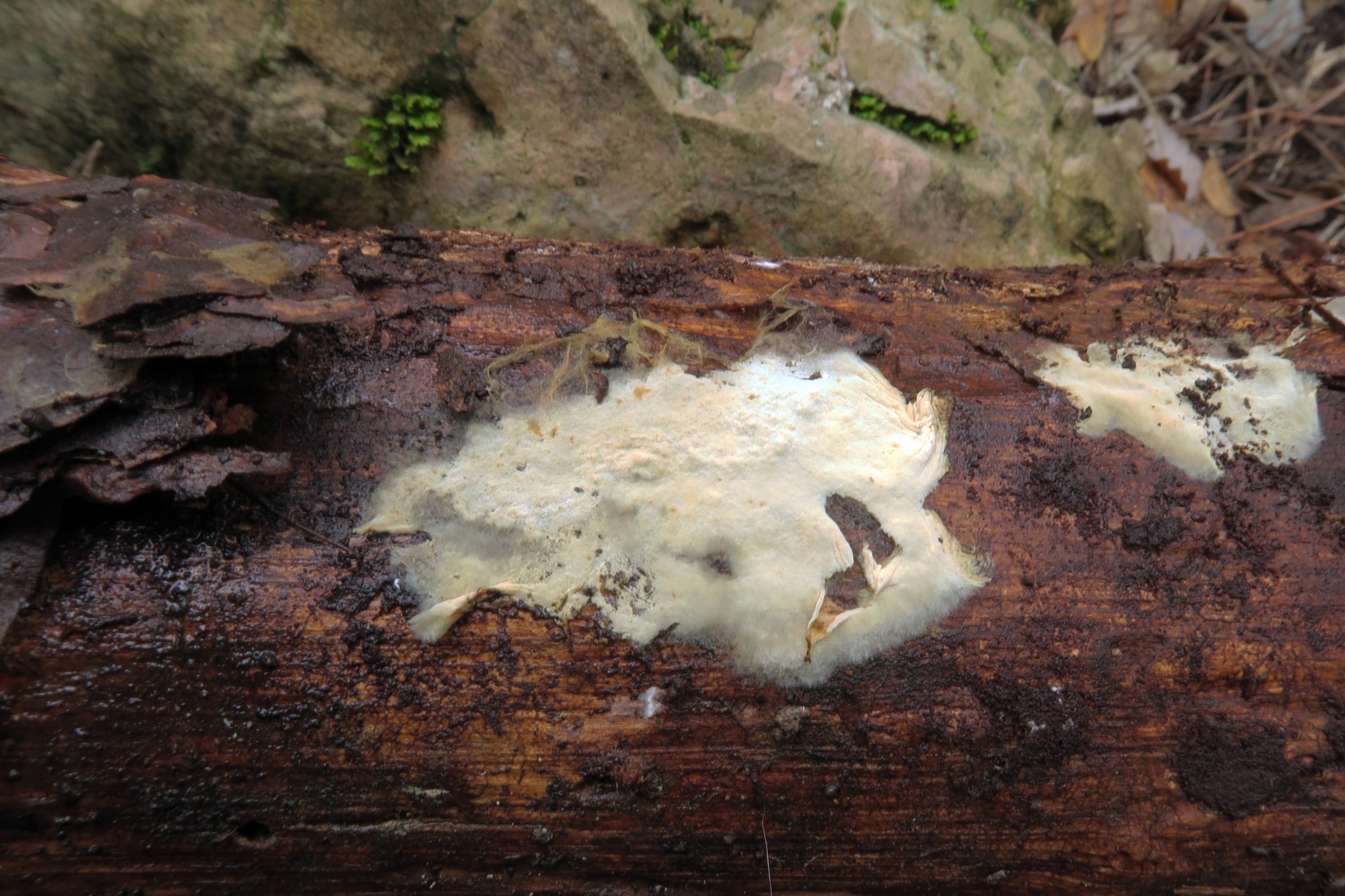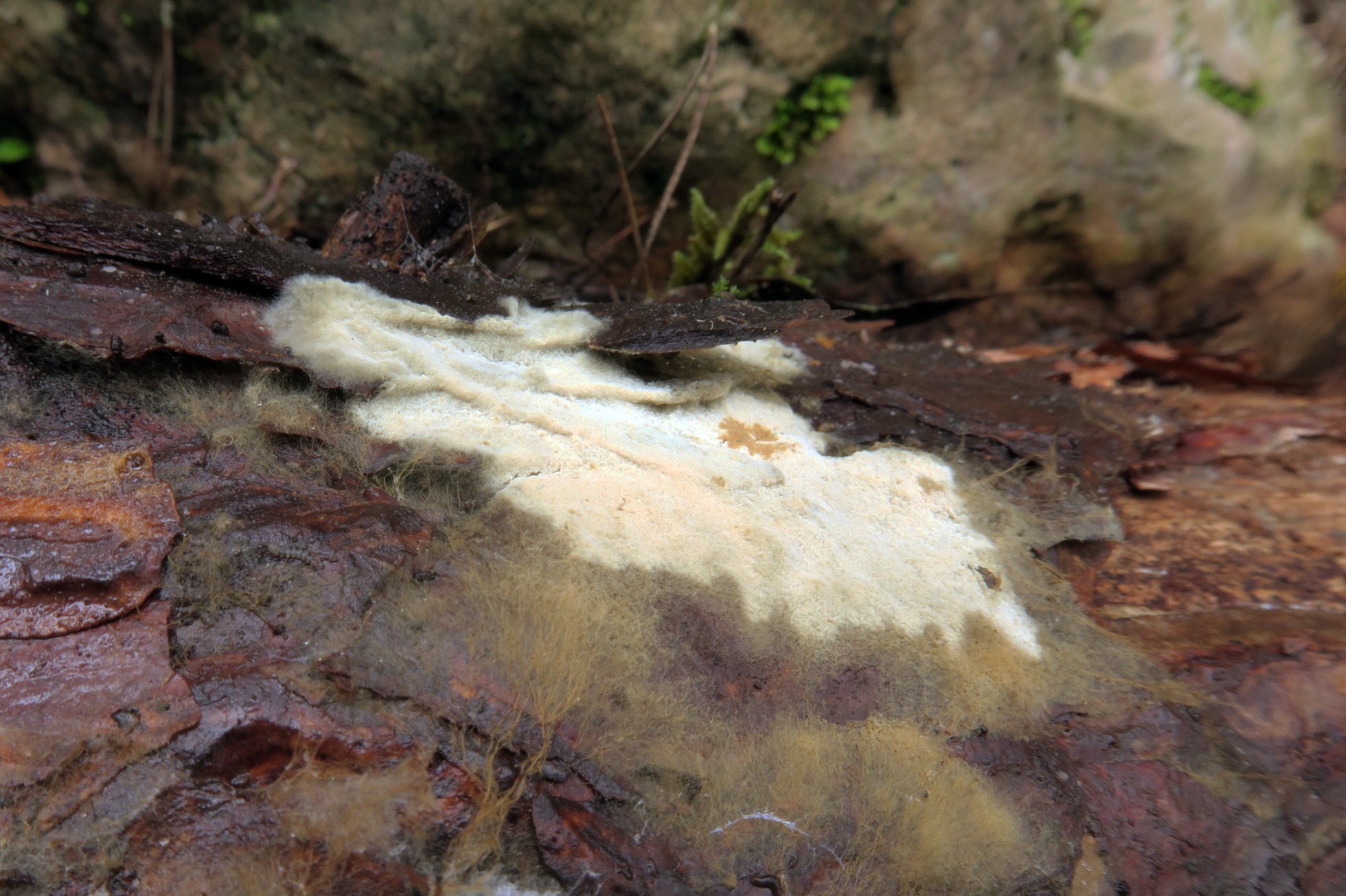 Un Corticial poco adherido al sustrato sobre un tronco tumbado de Pinus pinaster y a poca distancia de unos basidiomas de Phlebiopsis gigantea.