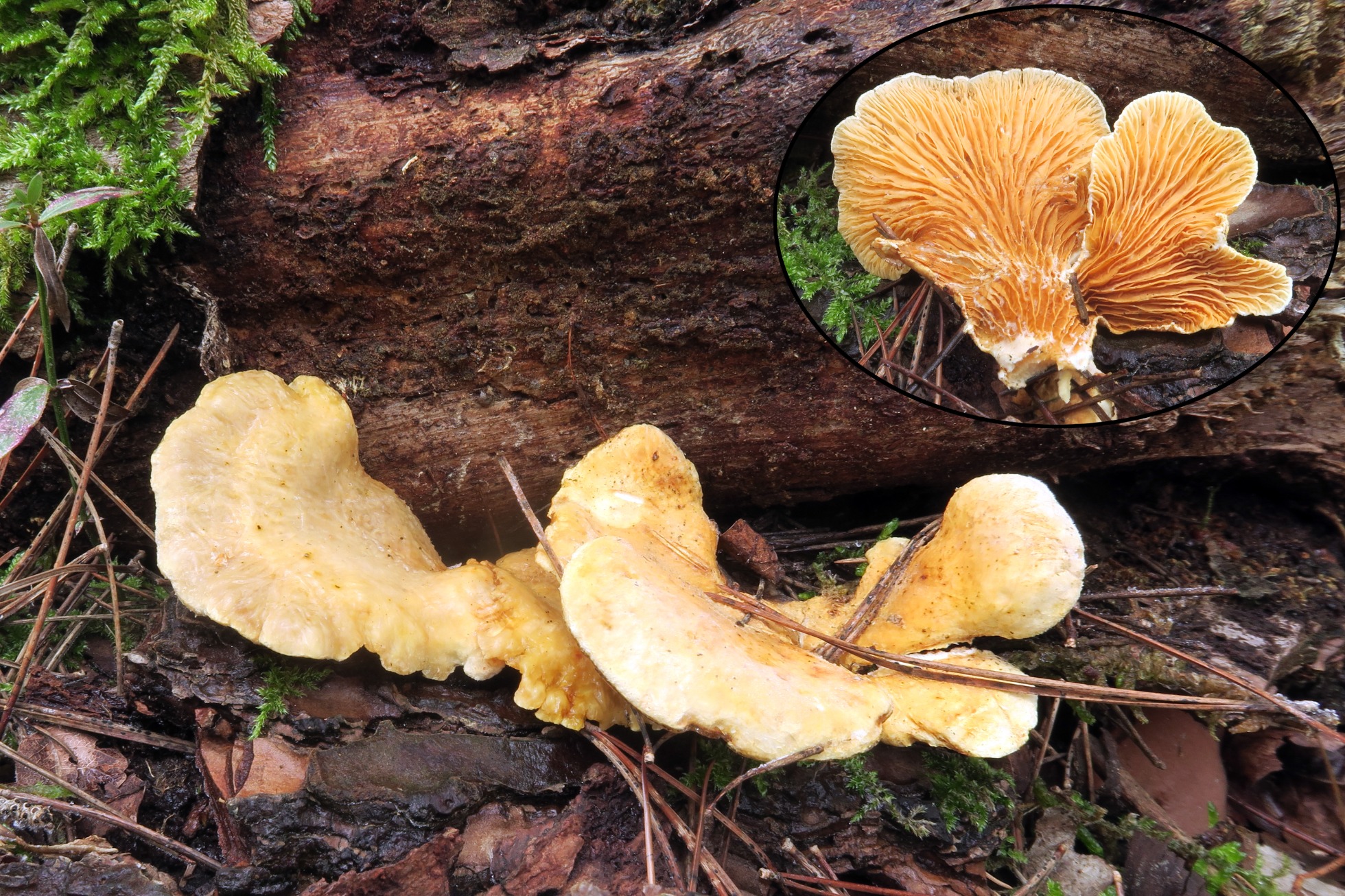 Una lignícola, sobre Pinus pinaster, la Phyllotopsis nidulans.